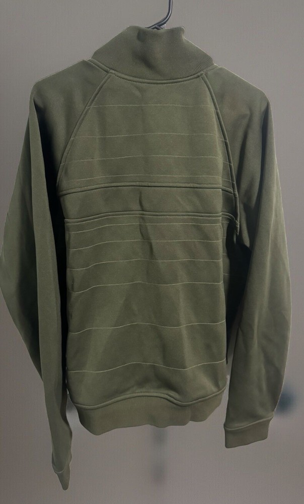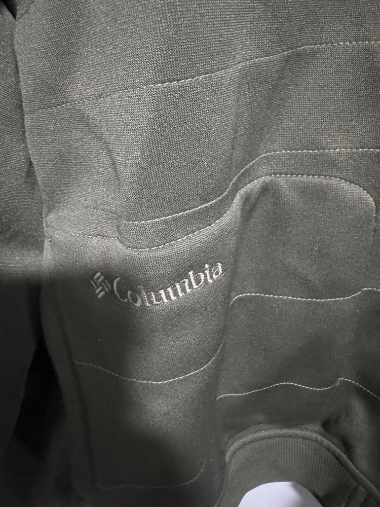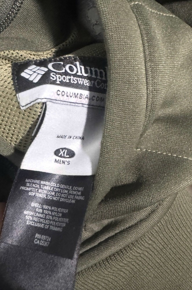 This is a men's Columbia track jacket in size XL, featuring a reversible design in olive green polyester. It is lightweight and suitable for sports activities.