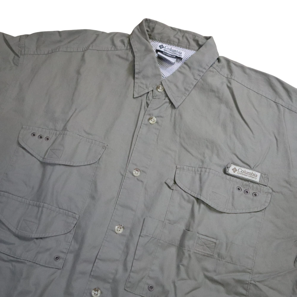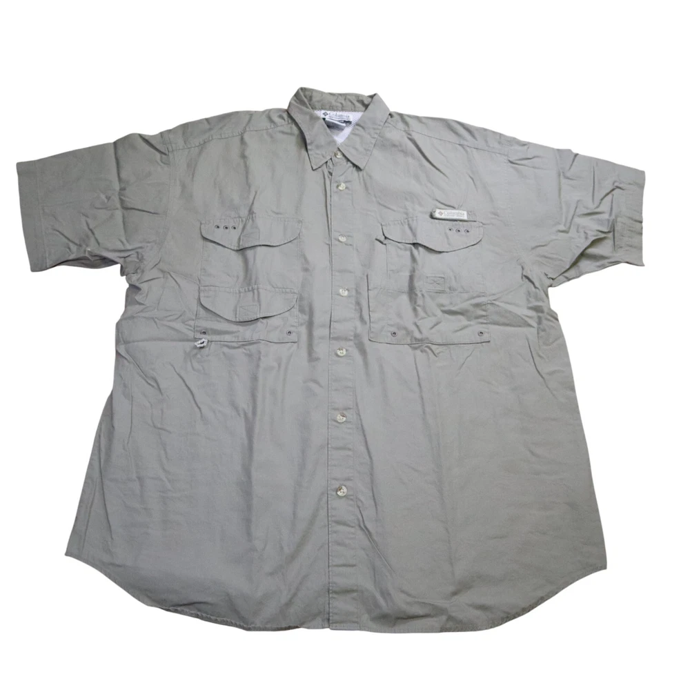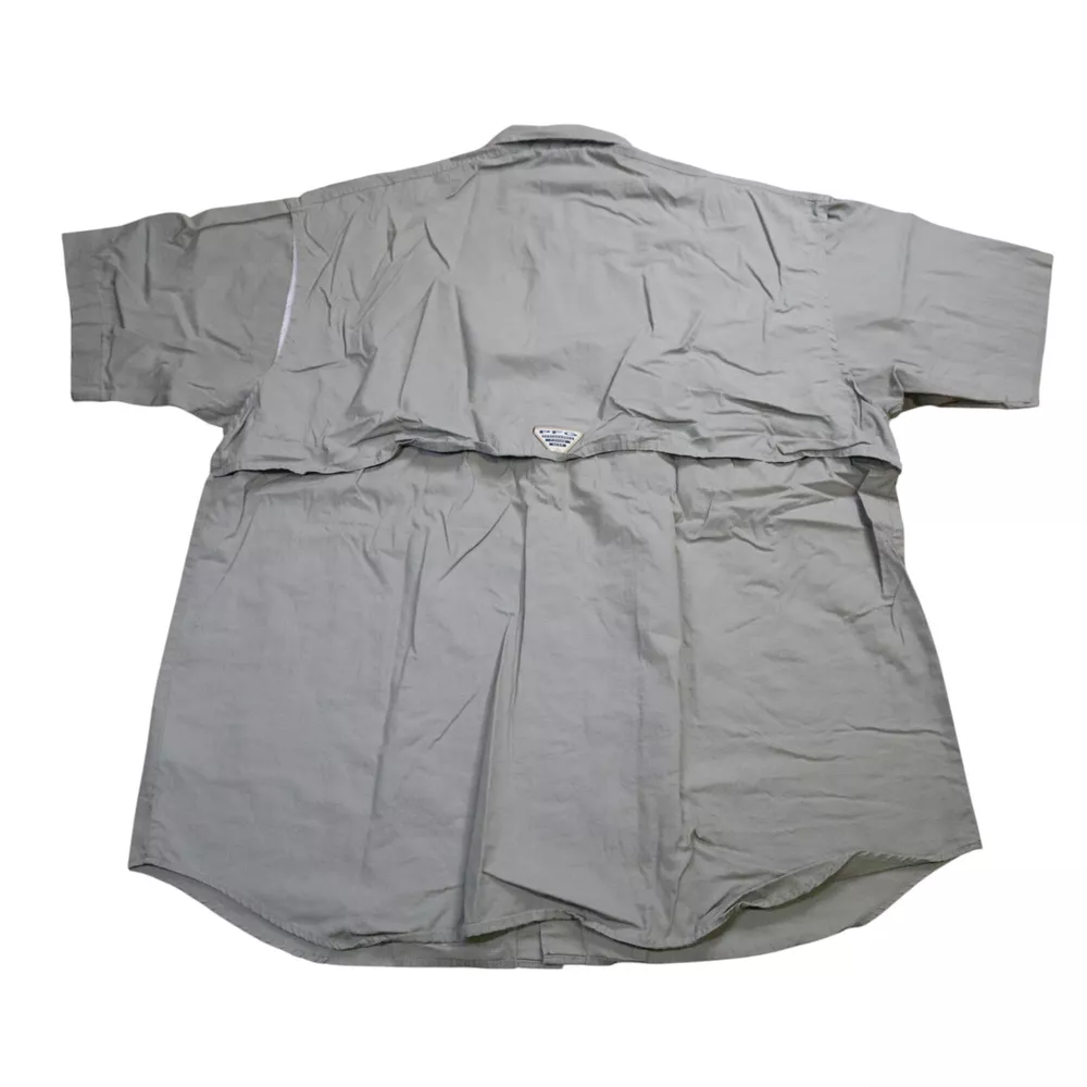 Handmade: No Model: Columbia PFG Omni-Shade Product Line: Columbia Bonehead Color: Gray Brand: Columbia Fabric Type: Woven Closure: Button Department: Men Country/Region of Manufacture: Thailand Vintage: No Occasion: Casual, Travel, Workwear Accents: Button, Embroidered, Strap Chest Size: 48 in Personalize: No Theme: Classic, Colorful, Dad, Fish, Florida, Marine, Nature, Nautical, Outdoor, USA Season: Fall, Spring, Summer, Winter Size: L Features: All Seasons, Breathable, Easy Care, Lightweight, Lined, Moisture Wicking, Pockets, Quick Dry, UV Protection Garment Care: Machine Washable Fit: Regular Pattern: Solid Size Type: Regular Sleeve Length: Short Sleeve Material: Cotton, Nylon, Polyester Character: Fisherman Type: Button-Up Neckline: Collared Collar Style: Point
