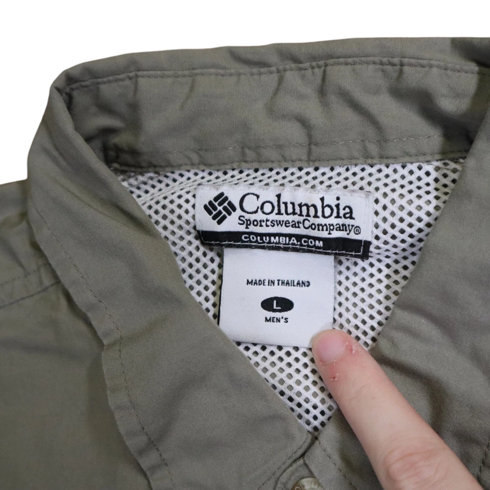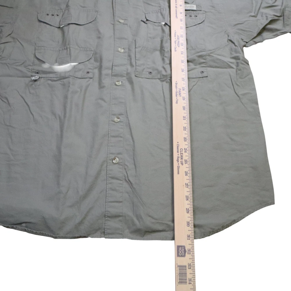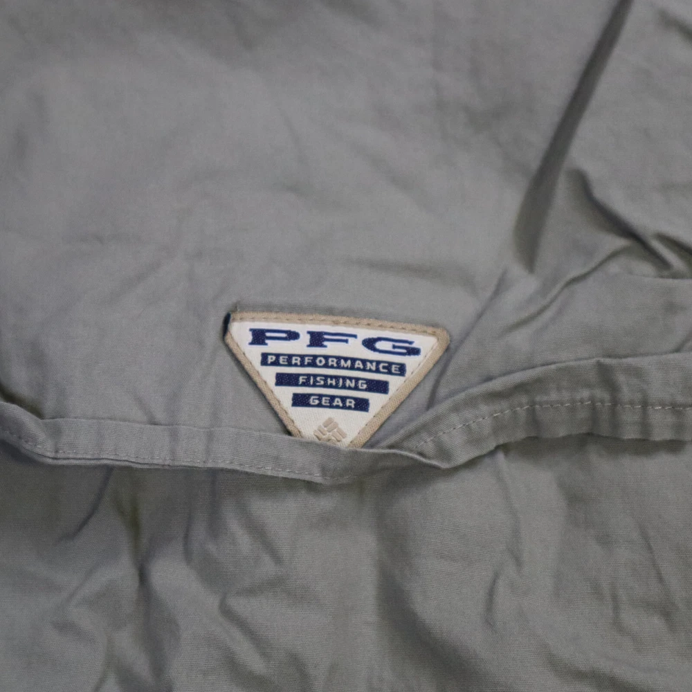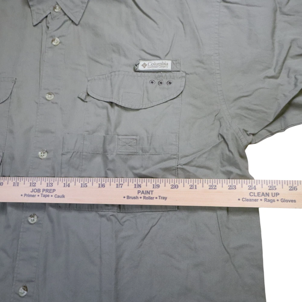 Handmade: No Model: Columbia PFG Omni-Shade Product Line: Columbia Bonehead Color: Gray Brand: Columbia Fabric Type: Woven Closure: Button Department: Men Country/Region of Manufacture: Thailand Vintage: No Occasion: Casual, Travel, Workwear Accents: Button, Embroidered, Strap Chest Size: 48 in Personalize: No Theme: Classic, Colorful, Dad, Fish, Florida, Marine, Nature, Nautical, Outdoor, USA Season: Fall, Spring, Summer, Winter Size: L Features: All Seasons, Breathable, Easy Care, Lightweight, Lined, Moisture Wicking, Pockets, Quick Dry, UV Protection Garment Care: Machine Washable Fit: Regular Pattern: Solid Size Type: Regular Sleeve Length: Short Sleeve Material: Cotton, Nylon, Polyester Character: Fisherman Type: Button-Up Neckline: Collared Collar Style: Point
