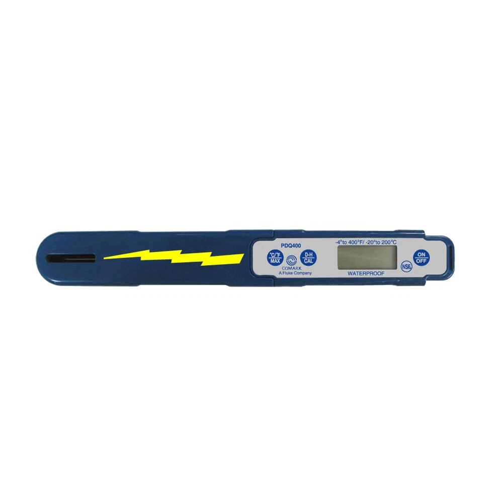 This Comark digital thermometer has a compact design with a thin probe tip for a fast response. It has a temperature range of -4°F to 400°F and data hold to freeze a reading. It has been treated with BioCote Antimicrobial Protection to help avoid cross-contamination. -4°F to 400°F temperature range °F & °C scales Under 6 seconds response time Data hold can freeze a reading Waterproof Protective case BioCote Antimicrobial Protection Field calibratable 1.5mm probe tip diameter Uses 1.5V button cell battery Auto off conserves battery life Model #: PDQ400 "