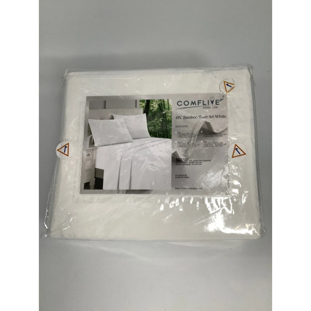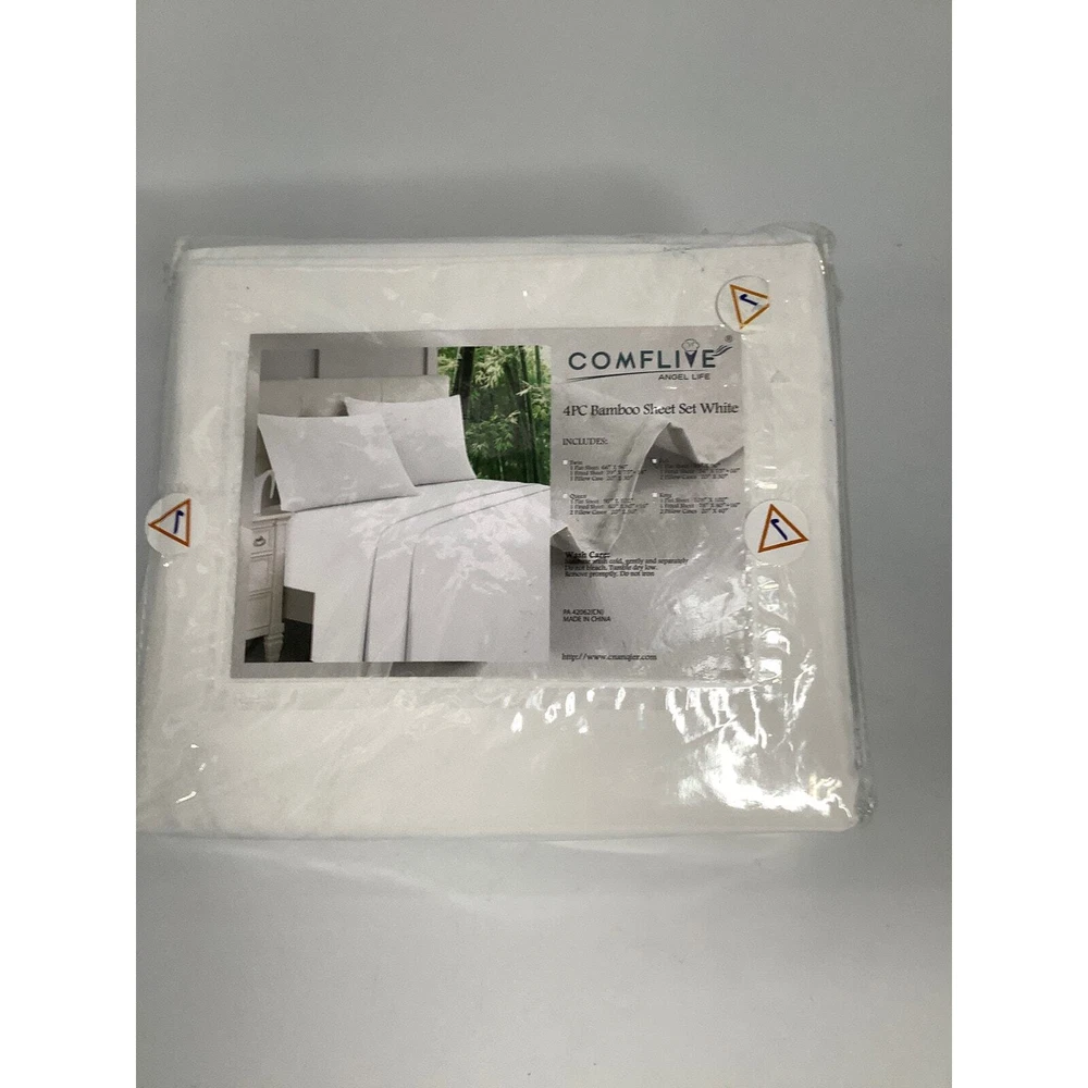Comflive Angel life 4 piece bamboo sheet set. White. Full set includes one flat sheet 84 x 96 one fitted sheet 54 x 75+16. Two pillowcases 20 x 30. Machine wash cold, gently, and separately do not bleach, tumble, dry, low, remove promptly. B138