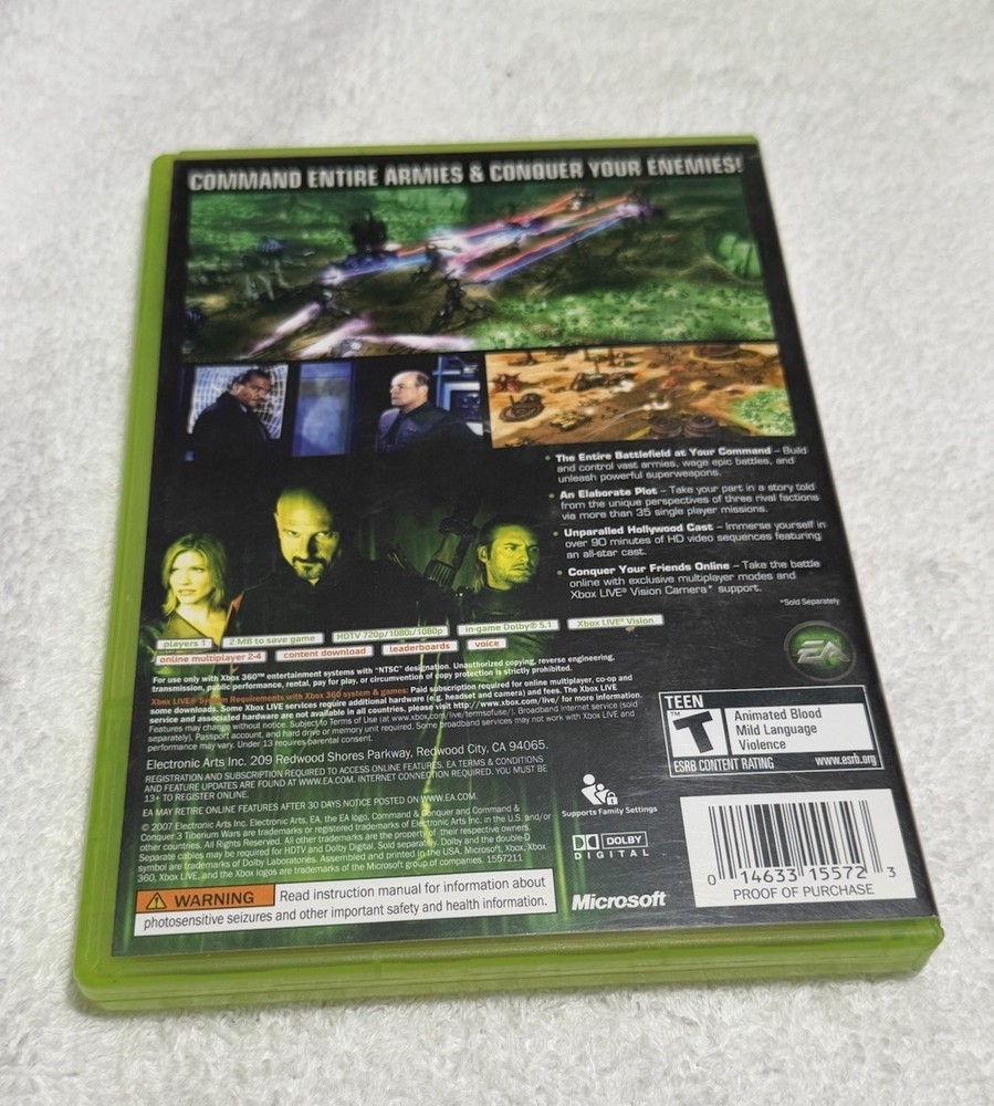 Game Name: Command & Conquer Genre: War Platform: Microsoft Xbox 360 Region Code: NTSC-U/C (US/Canada) MPN: 9999 Release Year: 2007 Rating: T-Teen Publisher: Electronic Arts