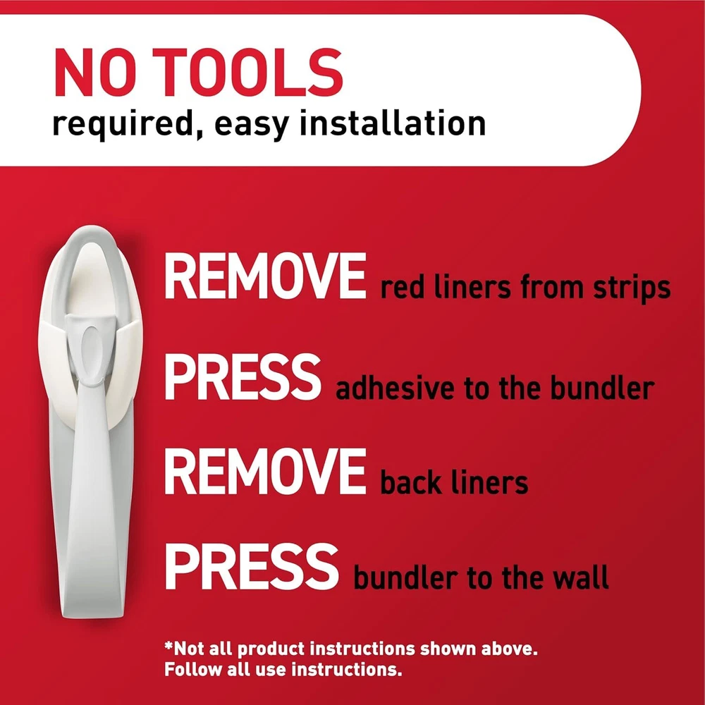 Command Cord Bundlers, Damage Free Hanging Organizer, No Tools Gray Product Details Color: Gray Brand: Command Material: Plastic Finish Type: Painted Mounting Type: Wall Mount HOLDS UP TO 2 POUNDS: One package of the Command Gray Cord Bundlers includes six cord bundlers and 12 Command Strips; one adhesive cord bundler can hold up to two pounds DAMAGE FREE HANGING: Wall cord hider works without leaving holes, marks or sticky residue on a variety of surfaces and remove cleanly when you want to reorganize your electrical cables and lightning cables during the holidays without tools WORKS ON A VARIETY OF SMOOTH SURFACES: Each Command Cord Bundler works on a variety of smooth surfaces, including painted walls, finished wood, painted concrete cinder blocks, laminate and tiles so you can create a festive winter wonderland in your space SURFACE PREP: Clean with rubbing alcohol to remove grime and dust to allow the cord organizers to bond to the surface; the indoor temperature must be between 50 degrees Fahrenheit and 105 degrees Fahrenheit USAGE TIPS: Wait seven days after painting before using the Command Cord Bundlers to allow paint to cure; do not hang over beds or on wallpaper; do not use the cord holders for hanging valuable items EASY CLEAN REMOVAL: Lightly hold the top of the wall adhesive strips and slowly pull straight down towards the floor to remove the cord wrap holding holiday cables and prevent surface damage; reuse your cord organizer with medium refill strips Command White Cord Bundlers eliminate dangerous, tangled cords and electrical cables behind your Christmas tree and Christmas decorations during the holidays without damaging your walls and surfaces. A great home improvement item this Christmas season, this damage free hanging cable cord hider sticks on a variety of smooth surfaces without leaving holes, marks or sticky residue. Mount these cord holders on painted walls, finished wood, painted concrete cinder blocks, laminate, glass, metal and tiles to optimize cable management before your holiday guests arrive. Perfect for home renovators and college students, use these wall hangers in your work office, home office and entertainment areas to elevate the appearance of your living or working space this Christmas without tools. Directions are included; follow the directions closely to use the electrical cord organizer as intended. Apply medium Command Refill Strips to relocate your 3M Cord Bundlers to a new area. A clever organizing solution that doesn’t damage surfaces, this cord organizer for appliances will help you organize your space this holiday season. Each package contains six white bundlers and 12 medium Command Strips. One cord bundler will hold up to two pounds. Decorate, organize and celebrate damage free with Command.