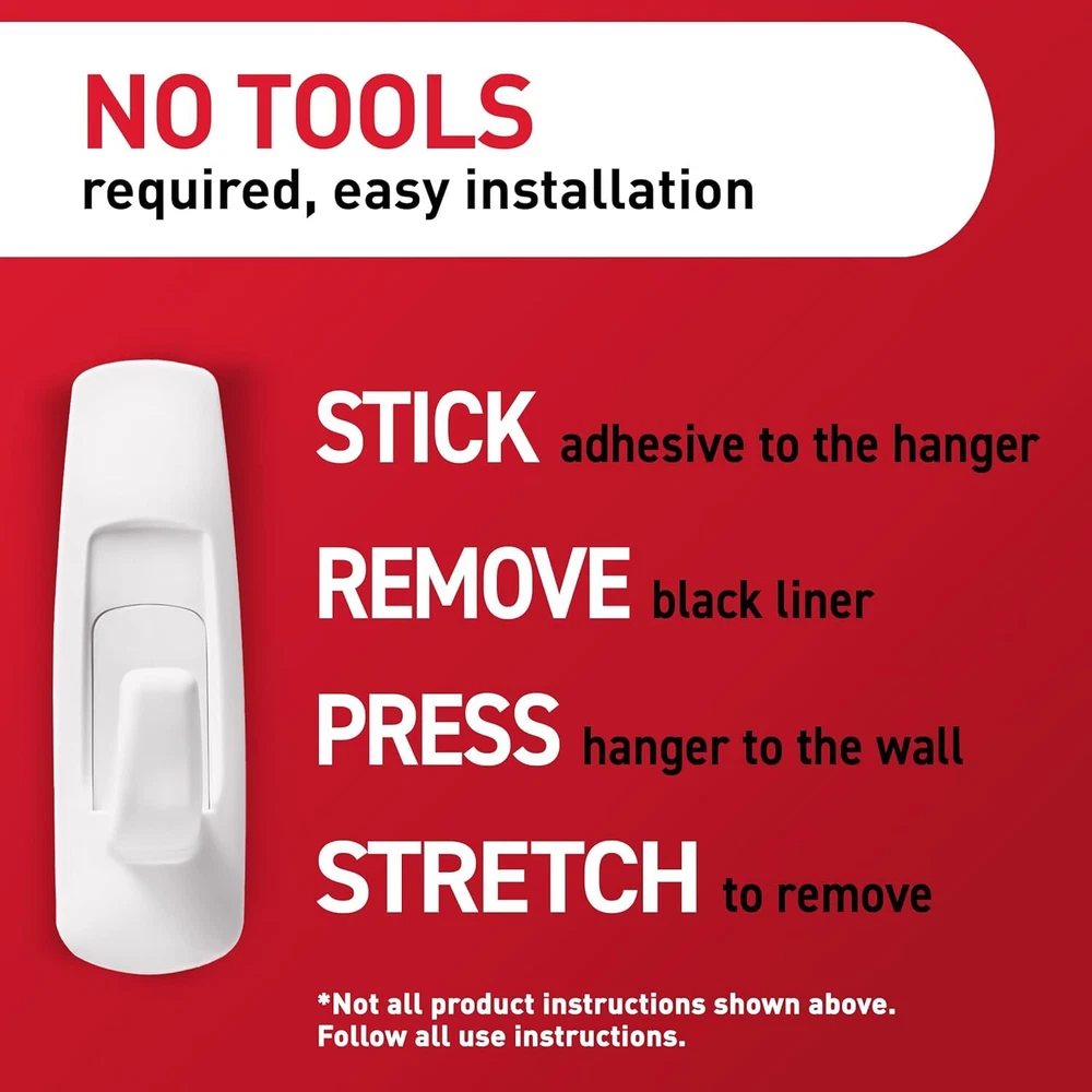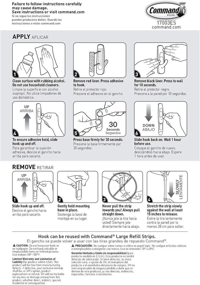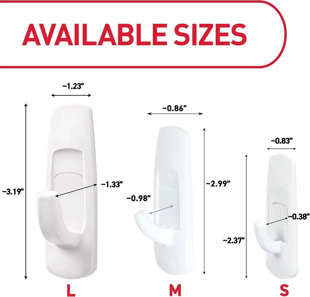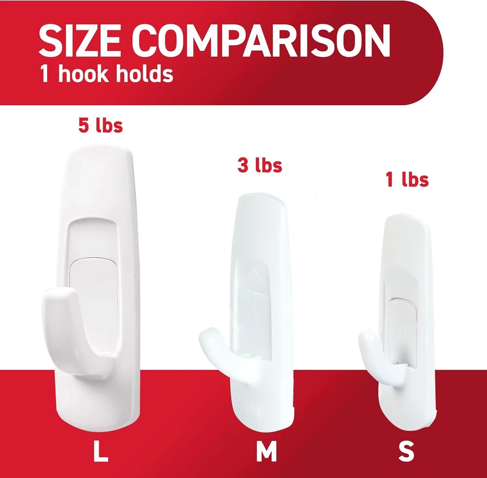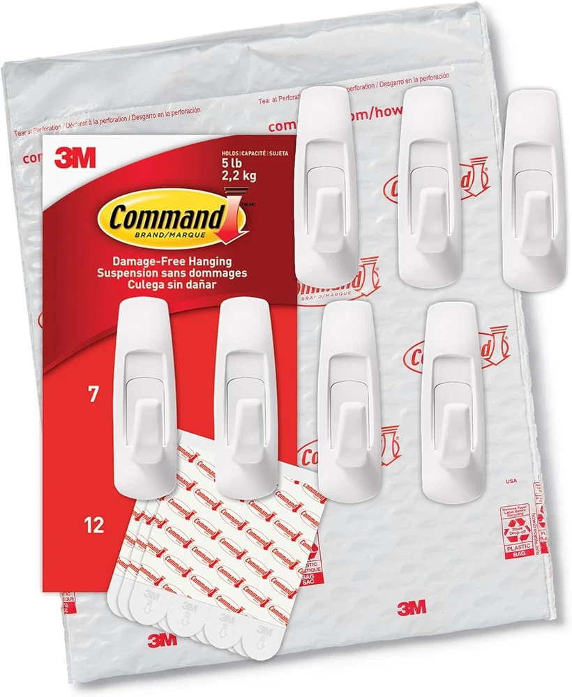 Command Large Utility Hooks, Holds up to 5 lb, 7 Hooks and 12 Large, White Product Details Color: White Brand: Command Material: Plastic Finish Type: Painted Mounting Type: Wall Mount Style: 7 Hooks Weight Limit: 5 Pounds Special Feature: Damage Free Recommended Uses For Product: Hangers,Kitchen,Indoor,Wallpaper,Utility,Coat,Wall Shape: curved Theme: storage/organization Item Weight: 40 Grams Included Components: 7 Hooks, 12 Strips Item dimensions L x W x H: 1.33 x 1.23 x 3.91 inches Number of Hooks: 12 Minimum Weight Capacity: 5 Pounds Surface Recommendation: Painted Walls, Finished Wood, Painted Concrete Cinder Blocks, Laminate, Glass, Metal, Tiles Maximum Weight Recommendation: 5 Pounds Manufacturer: 3M Part Number: GP003-7NA Item Weight: 1.41 ounces Product Dimensions: 1.33 x 1.23 x 3.91 inches Item model number: GP003-7NA Is Discontinued By Manufacturer: No Size: Large Finish: Painted Pattern: Hooks Item Package Quantity: 1 Maximum Weight Capacity: 5 Pounds Special Features: Damage Free Batteries Included?: No Batteries Required?: No Color: White Brand: Command Material: Plastic Finish Type: Painted Mounting Type: Wall Mount HOLDS UP TO 5 POUNDS: One package of the Command Large Utility Hooks includes seven wall hooks and 12 adhesive strips; each utility wall hanger can hold up to 5 pounds DAMAGE FREE HANGING: Wall hooks work without leaving holes, marks or sticky residue so you can move and rehang the hats and keys of holiday guests, seasonal calendars, stockings, and other Christmas decor or use as a coat hook to hang fleece-lined coats WORKS ON A VARIETY OF SMOOTH SURFACES: Adhesive wall hangers work on a variety of smooth surfaces, including painted walls, finished wood, painted concrete cinder blocks, laminate and tiles so you can create a festive winter wonderland in your space SURFACE PREP: Clean with rubbing alcohol to remove grime and dust to allow the hanging hooks to bond to the surface; the indoor temperature must be between 50 degrees Fahrenheit and 105 degrees Fahrenheit USAGE TIPS: Wait seven days after painting before using the Command Hooks to allow paint to cure; do not hang over beds or on wallpaper; do not use the wall hooks for hanging valuable items Command White Large Utility Hooks let you decorate and organize how you want, when you want, during the holidays without damaging surfaces. A great home improvement item this Christmas season, these no damage wall hooks stick on a variety of smooth surfaces without leaving holes, marks or sticky residue. Hang your favorite Christmas decorations, garlands and ornaments on these Christmas hooks or use them as stocking hooks to create a winter wonderland in your space. Simply mount these wall adhesive hooks on painted walls and more and enjoy the damage free hanging of your favorite holiday decorations and organizers. Perfect for home renovators and students, use these wall hooks for hanging Christmas decor in your home, office or dorm to elevate the appearance of your living or working space without tools. Directions are included that show how to use the wall hangers. A clever decorating and organizing solution that doesn’t damage surfaces, these large tool free wall hangers will help you fearlessly change your space this holiday season. One package contains seven white utility hooks and 12 large adhesive strips. Each single utility adhesive wall hook can hold up to 5 pounds. Decorate, organize and celebrate damage free with Command.
