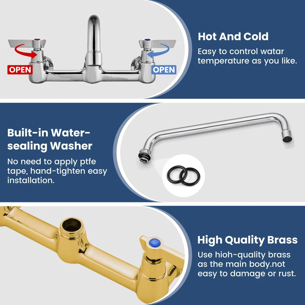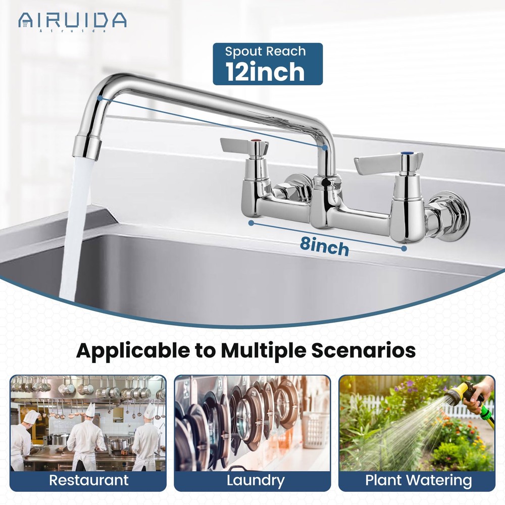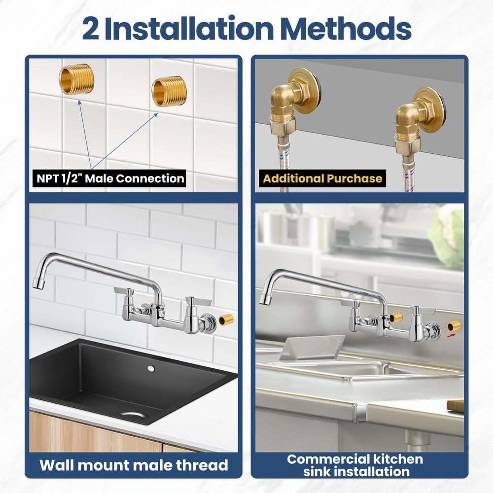 [Material]:Maximum Flow Rate:1.8gpm.6.8L/min.With refined brass material and advanced chrome polish finish,our wall mount kitchen sink faucet is built to last and resist corrosion,tarnishing,and rust. [Adjustable Distance]:This wall mount commercial sink faucet features adjustable 1/2NPT female inlets that can be adjusted from 7 3/4" to 8 1/4", making it easy to install and use. The 8 inch center wall mount faucet is perfect for any kitchen or utility sink. [Function]:Dual handles,our double handle wall mount kitchen sink faucet makes it easy to control the temperature and flow of water. The 12 inch swivel spout design allows for a 360-degree rotation,providing a great user experience. [Easy to Install]:Our faucet is suitable for water pipe connection with male NPT 1/2" pipe thread coming out of the wall.Comes with installation instructions for a hassle-free setup. [Attention]:If you need install the faucet on the commercial sink or thick ceramic sink, you need purchase additional adapters(Please refer to Product A+ for additional adapters)