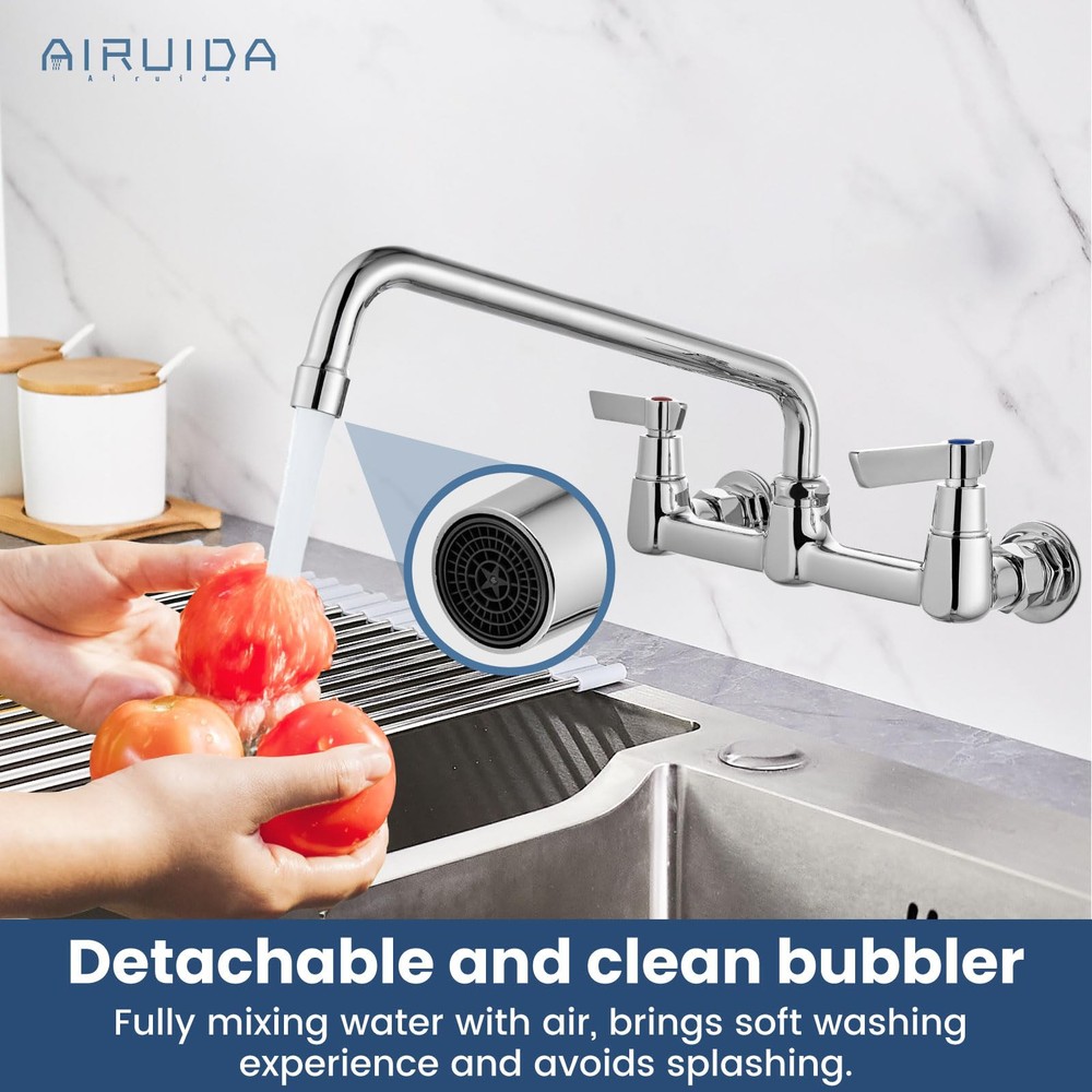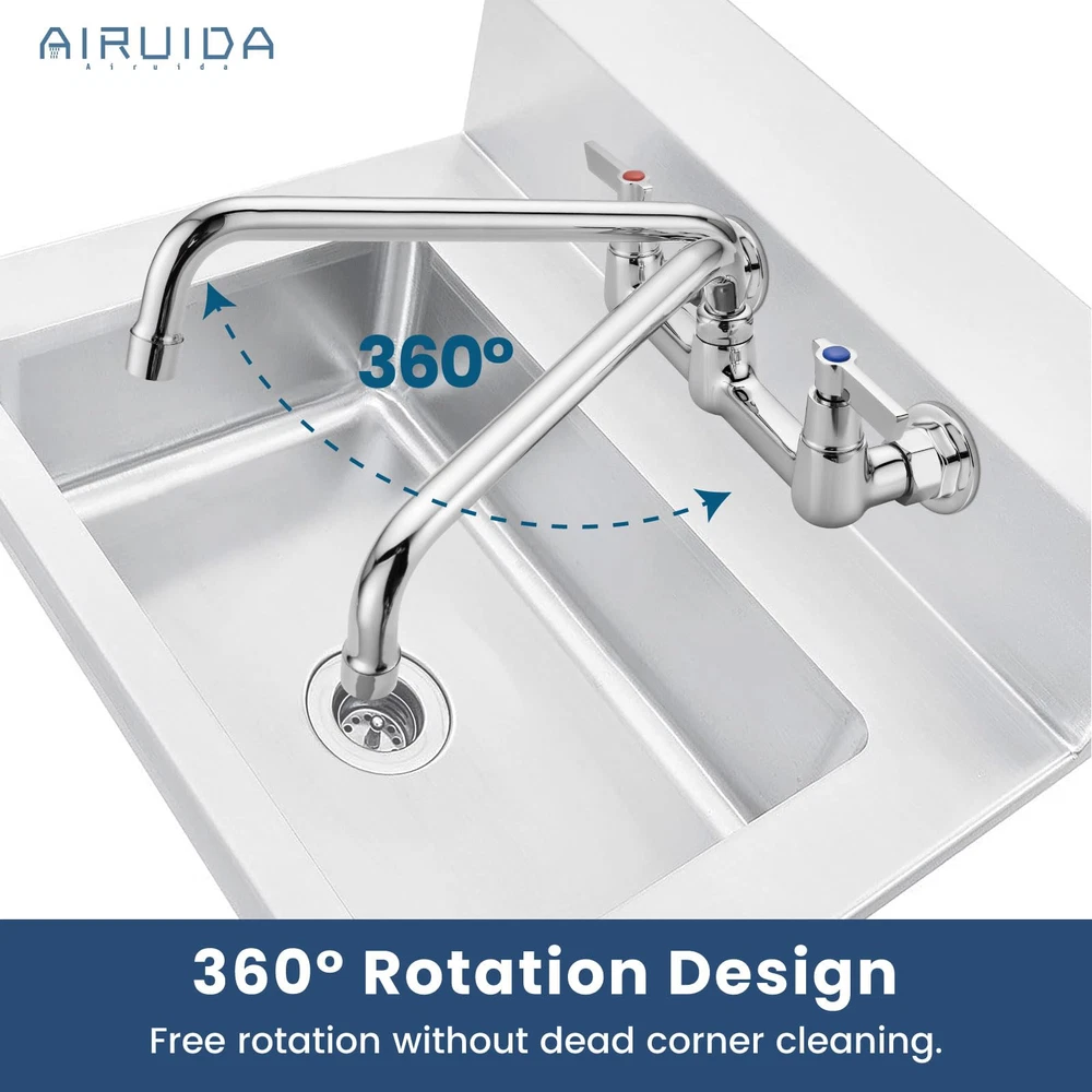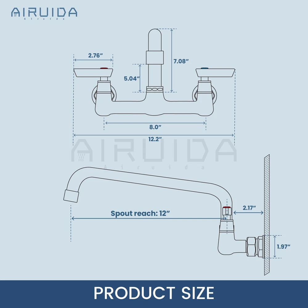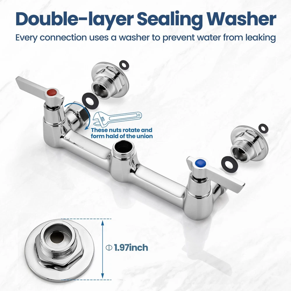 [Material]:Maximum Flow Rate:1.8gpm.6.8L/min.With refined brass material and advanced chrome polish finish,our wall mount kitchen sink faucet is built to last and resist corrosion,tarnishing,and rust. [Adjustable Distance]:This wall mount commercial sink faucet features adjustable 1/2NPT female inlets that can be adjusted from 7 3/4" to 8 1/4", making it easy to install and use. The 8 inch center wall mount faucet is perfect for any kitchen or utility sink. [Function]:Dual handles,our double handle wall mount kitchen sink faucet makes it easy to control the temperature and flow of water. The 12 inch swivel spout design allows for a 360-degree rotation,providing a great user experience. [Easy to Install]:Our faucet is suitable for water pipe connection with male NPT 1/2" pipe thread coming out of the wall.Comes with installation instructions for a hassle-free setup. [Attention]:If you need install the faucet on the commercial sink or thick ceramic sink, you need purchase additional adapters(Please refer to Product A+ for additional adapters)