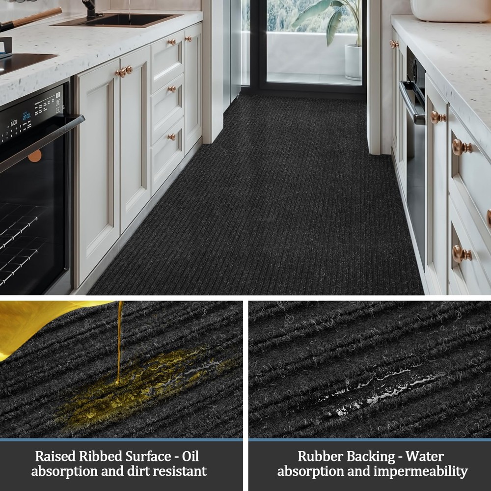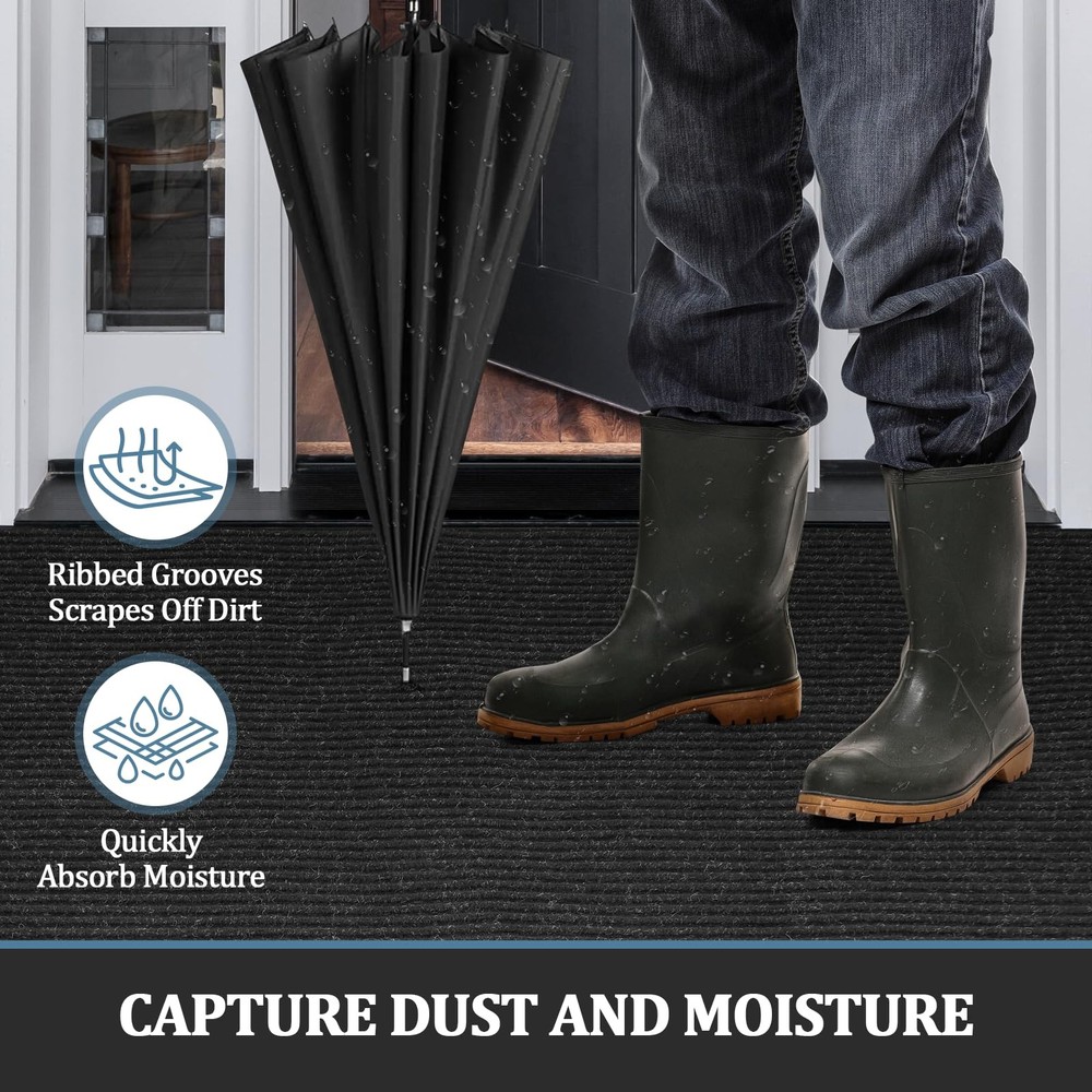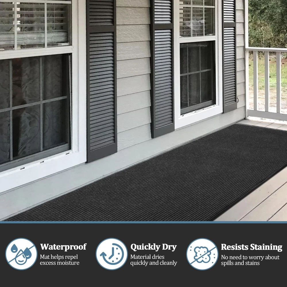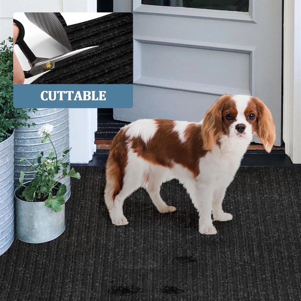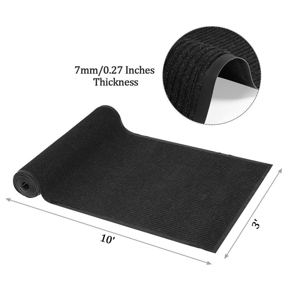 Product Dimensions: 118"L x 35.43"W Item Thickness: 0.27 Inches Item Weight: 16.53 pounds Material: Polyester , Rubber Pattern: Striped Pile Height: Low Pile Back Material Type: Rubber Color: Black Indoor/Outdoor Usage: Indoor/Outdoor Is Stain Resistant: Yes Shape: Rectangular Special Feature: Waterproof, Anti Slip, Fade Resistant, Stain Resistant, Washable Room Type: Hallway Special Feature: Pet Tools Rug Form Type: Doormat Style: Classic Min. Required Door Width: 37 Inches Number of Pieces: 1 Deep Grooves Capture Mud and Moisture: Our commercial entrance rug is made of high quality polyester and rubber. Designed with a raised ribbed surface to help capture mud, dirt, moisture and debris deep within its grooves; perfect for those rainy and muddy days Non-Slip Bottom: The commercial hallway rug has a non-slip and stain-resistant heavy-duty rubber backing that keeps floor mats in place and prevents moisture leakage. Flat on the floor and will not turn up at the corners, or move on any hard surface, keeps the mat in place. Size: 3'x10', thickness 0.27" Durability and Stability: The indoor outdoor rug mat is designed for all weather conditions, both indoors and outdoors. Premium fabric dries quickly and resists staining and fading for long lasting use. Effectively remove dirt and soft enough to not damage your shoes or hurt your feet, but reliable for boots Ease of Cleaning: The outdoor floor mat is designed for easy to clean. You just use vacuum to clean it or shake it off. For deep clean, you can rinse it with garden hose and let it dry Widely Use: Our front doormat is used for all weather, from hot summer to cold winter, works as front door mat, outdoor door mat, welcome door mats, garage rugs and mats, indoor mats for entryway, shoe mat, dog doormat, floor mats, ect. It can scrap off mud, slush, grass or retain snow