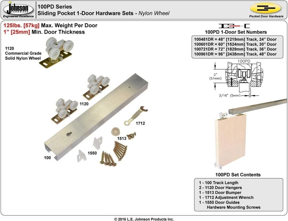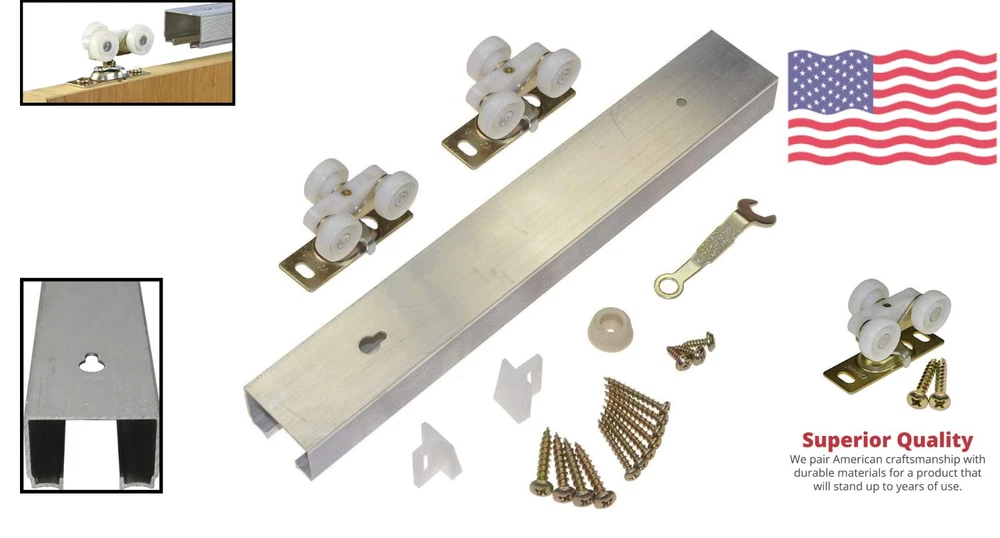 Commercial Grade Pocket Door Hardware 48" - Solid Nylon Wheel, Top Hung Design ‹ › ‹ › ‹ › ‹ › ‹ › ‹ › ‹ › ‹ › Commercial Grade Pocket Door Hardware 48" -Solid Nylon Wheel, Top Hung Design Features: Commercial grade top hung pocket door hardware with solid nylon wheel. Ideal for on-site custom pocket/sliding door installations, 125 lb. capacity. Patented design for 2 x 4 interior wall construction, minimum door thickness of 1-inch. ANSI certified aluminum track with convex rails. Made in the U.S.A., part number . Benefits: Durable and reliable for commercial use. Smooth and quiet operation with solid nylon wheel. Customizable for on-site installations. Strong and sturdy materials for long-lasting performance. Made in the U.S.A. for quality assurance. Why choose our Commercial Grade Pocket Door Hardware? Upgrade your pocket door with our commercial grade pocket door hardware. With a solid nylon wheel and top hung design, this hardware is ideal for custom installations and can support up to 125 lbs. The patented design is perfect for 2 x 4 interior wall construction, ensuring a secure fit for your door. Made in the U.S.A. with ANSI certified aluminum track, you can trust the quality and durability of this product. Don't settle for inferior pocket door hardware - choose our Commercial Grade Pocket Door Hardware for reliable performance and peace of mind. Shipping Free & Fast Shipping - We offer free shipping to most of the USA with a normal delivery time of 3-7 days. However, due to the current situation, additional delivery time (up to 3 weeks) may be required for some items. Alternative Carriers - We may use alternative carriers (e.g. USPS, FedEx, UPS, etc.) to ensure your package arrives safely and on time. Due to the use of multiple carriers, we are unable to provide a tracking number automatically. Handling Time - Orders are processed and shipped within 1-2 business days of receiving cleared payment. Shipping Restrictions - Shipping to Alaska, Hawaii, Puerto Rico, Guam, and other US territories may incur shipping charges or delivery restrictions. Please contact us before ordering, or your order can be refunded/cancelled. State Restrictions - There may be restrictions based on your state of purchase. For example, certain items may not be shipped to California due to state regulations. Contact for Tracking Updates - If you require tracking updates or have any concerns about the delivery of your order, please feel free to contact us, and we will be happy to assist you. Return 30-Day Hassle-Free Returns - We want you to be completely satisfied with your purchase. If you are not, you can return the item within 30 days of receiving it for a full refund or exchange. Easy Return Process - To start a return, simply contact us and we will provide you with a prepaid return shipping label and detailed instructions. Restocking Fee - There are no restocking fees for returns. However, the buyer is responsible for return shipping costs if the return is not due to a seller's error. Refund Processing Time - Refunds will be processed within 5 business days of receiving the returned item in its original condition. Payment We accept all major credit cards, PayPal, and Apple Pay for your convenience. Your payment information is secure and encrypted to ensure a safe and seamless transaction. Please complete your payment within 3 days of purchase to avoid any delays in shipping. Feedback Your feedback is extremely important to us. We strive to provide the best products and customer service possible. If you are satisfied with your purchase, please take a moment to leave us a positive review. If you have any concerns or issues with your order, please contact us before leaving negative feedback. We are committed to resolving any problems and ensuring your satisfaction. Contact Us If you have any questions or concerns, please feel free to reach out to our customer support team. You can contact us through the eBay messaging system. We are available Monday to Friday, 9:00 am to 5:00 pm EST, and we will do our best to respond to your inquiry within 24 hours. Thank you for supporting our small family business!