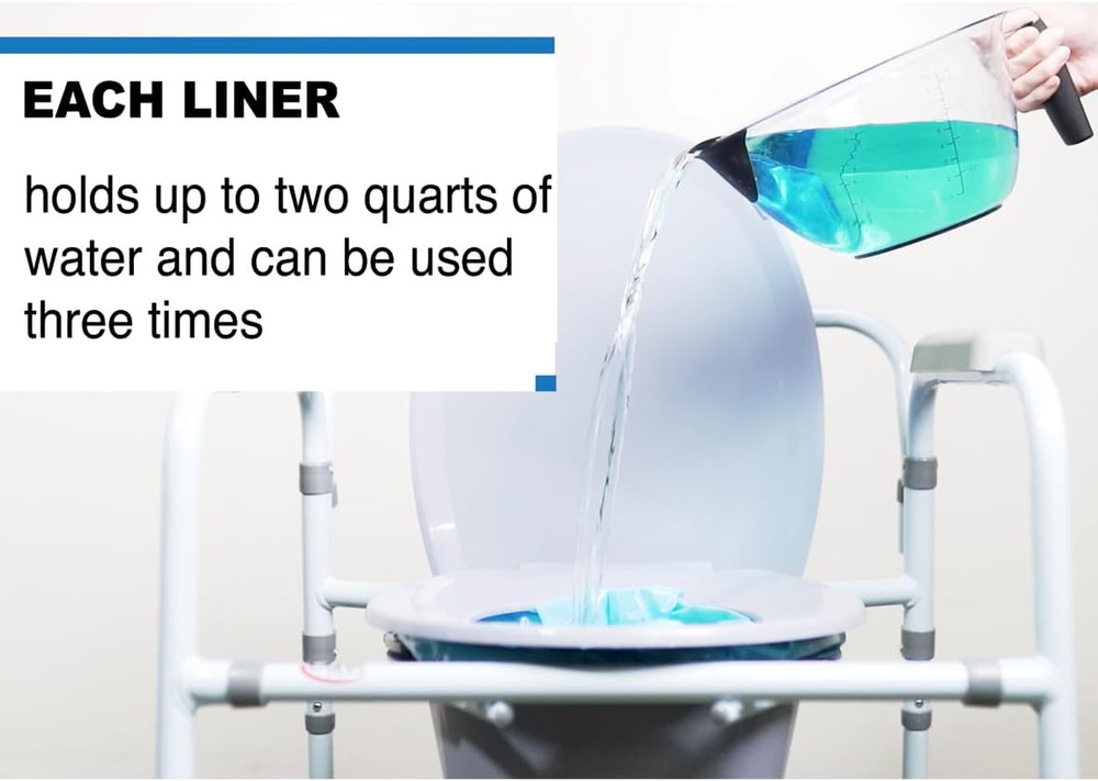 42 total portable toilet liners. Each commode liner an hold up to 2 quarts of liquid. Our portable toilet bags are universal fit and will work with most commodes, uplift commodes, or potty chairs. Disposable and hygienic. Comes with 6 boxes of 7 disposable commode liners per package. Perfect for a bedside Commode or travel commode. Thick commode bags. No accidents, no Spills. Our potty chair liners are durable, won't rip, and are very strong. Disposable liners come with absorbent powder, reducing smell and liquid. Super absorbent powder on the commode bag dries up liquid and reduces smells. Liners will also work for bedpan liners or as a replacement for porta potty bags. Commode bucket replacement. To replace the commode liner, simply close up the bag, tie up the handles, and place in the garbage. Replace immediately with a new commode liner. Compatible with the Medline commode and drive commode. Product description The video showcases the product in use. The video guides you through product setup. The video compares multiple products. The video shows the product being unpacked. Our Other Products Add to Cart Add to Cart Add to Cart Customer Reviews 4.6 out of 5 stars 2,951 3.0 out of 5 stars 119 4.6 out of 5 stars 81 4.6 out of 5 stars 513 4.6 out of 5 stars 121 4.7 out of 5 stars 154 Price $37.99 $ 37 . 99 $206.73 $ 206 . 73 — $35.11 $ 35 . 11 — — Material Steel Frame Steel Frame 100% Absorbent Polymer 100% Absorbent Polymer 100% Absorbent Polymer 100% Absorbent Polymer Weight Capacity 300 lbs 300 lbs 2 Quarts of liquid 2 Quarts of liquid 2 Quarts of liquid 2 Quarts of liquid Does it have lifting assist? ✘ ✔ ✘ ✘ ✘ ✘ Does It Include Arms? Yes Yes — — — — Do the Arms Drop Down? No No — — — — Width Between Arms — 17" 17" — — — Are Tools Required? No 7/16” Wrench — — — — Package Qty. 1 1 24 42 48 72