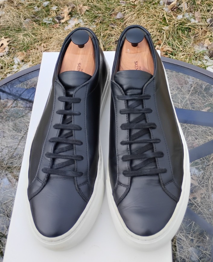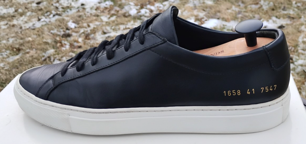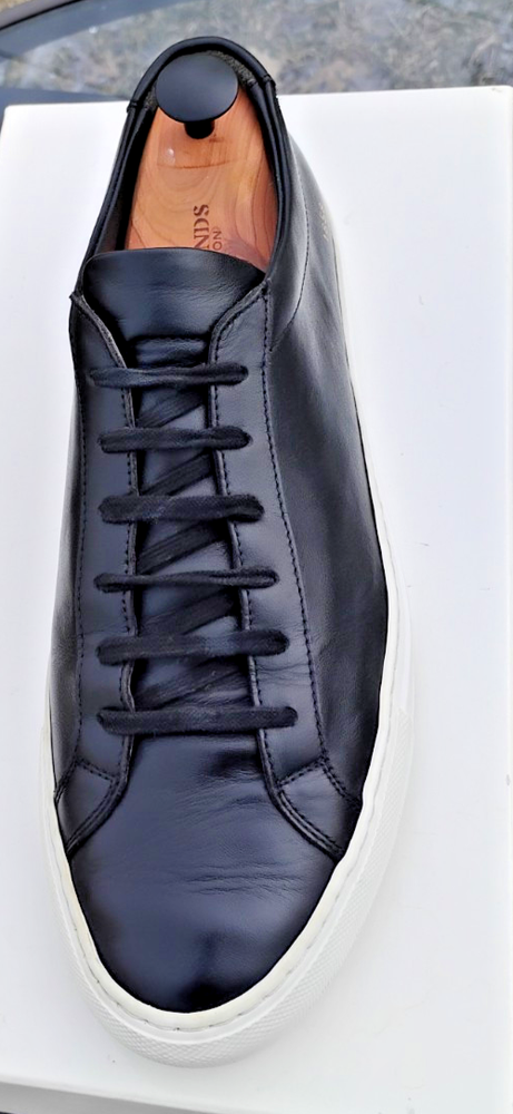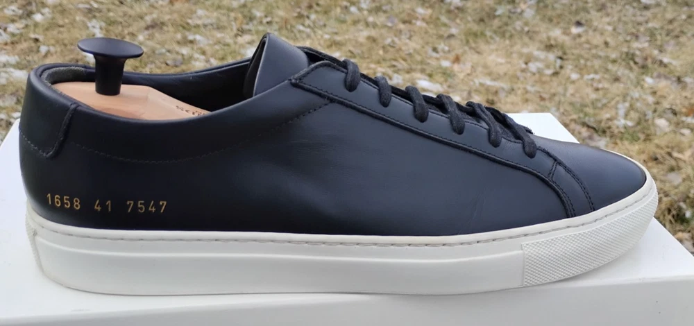 Common Projects Achilles Low model 1658 in Black (7547). EU 41. Can fit a US size 8 or 8.5 Mens. The essential luxury sneakers. Shoes are in excellent pre-owned condition. Gold letter in great shape. Please see all pictures for full condition of the shoes. Shoe trees and original shoe box are not included. Please inquire with any questions. Please know your proper shoe size before ordering. Fast and secure shipping.