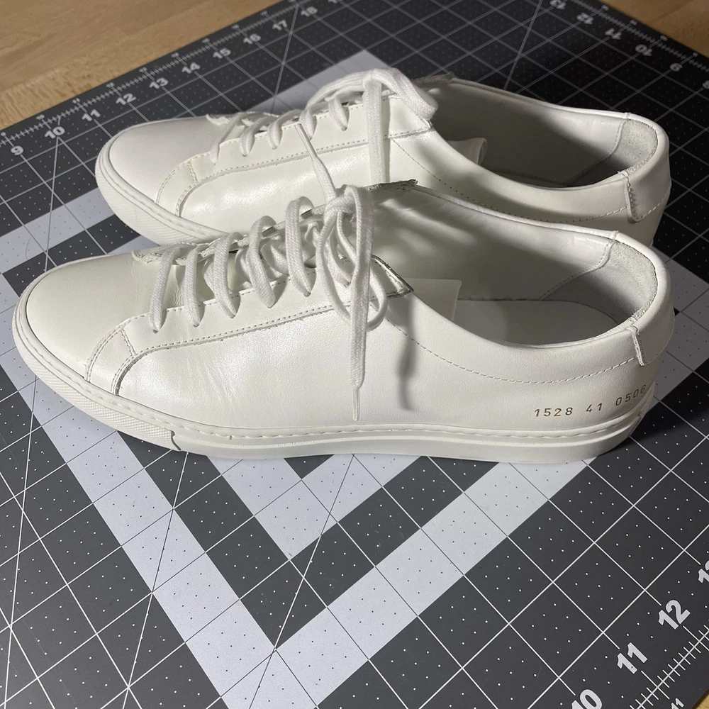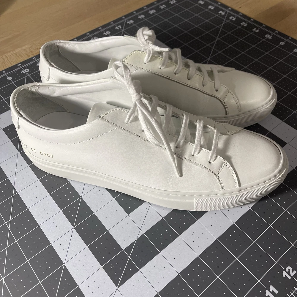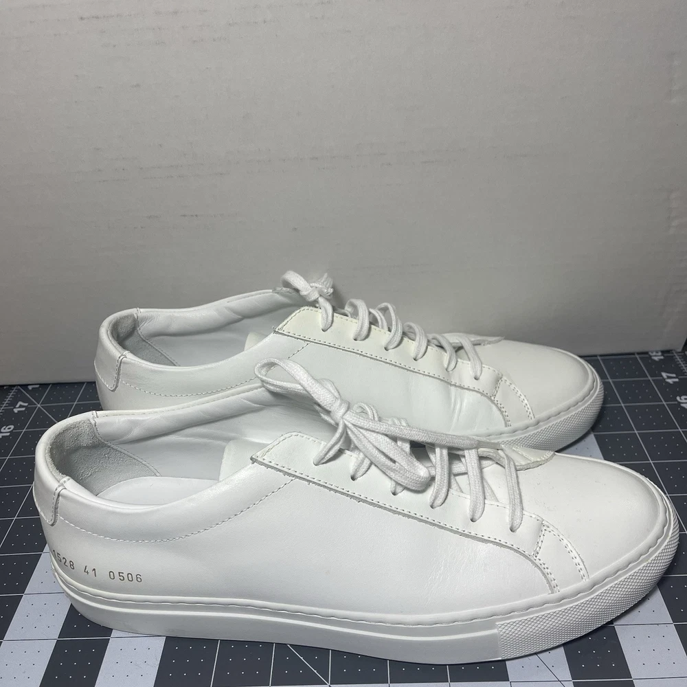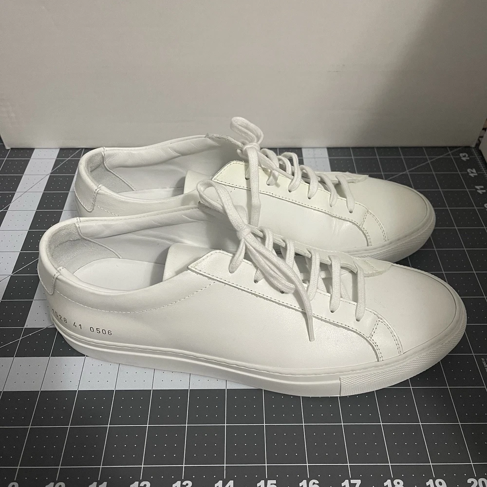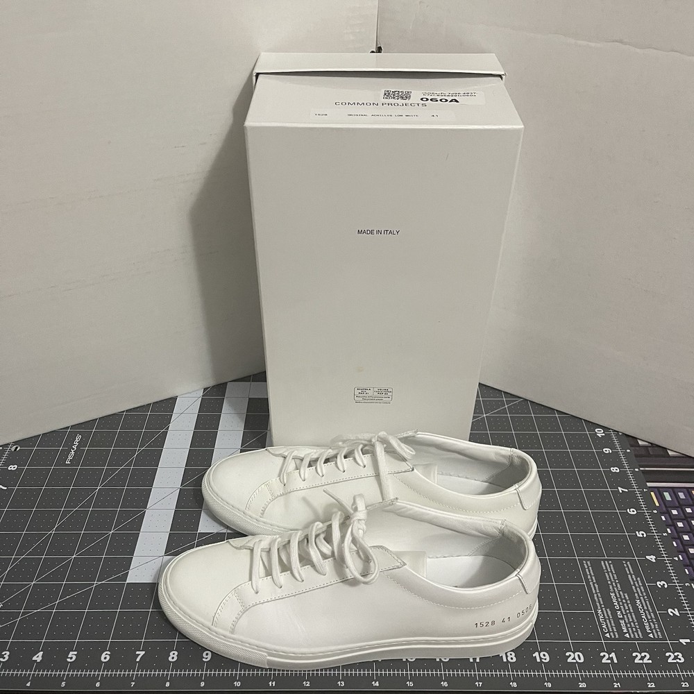 Common Projects Achilles Low White Size 41 Previously Owned Great Condition Model: 1528 41 0506 Size 41 EU Can fit a US size 8 or 8.5. The brand usually runs a little big, so I would say it fits 8.5 US. I advise you to go to your local store to try your size (Neiman Marcus, Saks Fifth Ave or Nordstrom). Condition: Pre-owned. Leather is smooth. Please, look at all pictures to see full condition of the shoes. Slight yellowing on inside left shoe near lace holes. Made in Italy. Original retail price: $400+. These sneakers come with box and dust bag. Box is slightly damaged. PLEASE KNOW YOUR COMMON PROJECTS SHOE SIZE BEFORE ORDERING AS I DO NOT ACCEPT RETURNS. EU SIZE 41. Thanks for shopping! AI Generated Description: Step into effortless style with the Common Projects Achilles Low sneakers in a crisp white. Crafted from high-quality leather, these sneakers are a testament to minimalist design and comfort. The iconic aesthetic of these sneakers is a perfect match for casual or smart-casual ensembles, making them a versatile addition to any modern man's wardrobe. Size 41 (US Size 8) ensures a comfortable fit for a variety of foot shapes, while the durable construction promises longevity. As part of the revered COMMON PROJECTS Achilles product line, these sneakers blend premium materials with a sleek silhouette to create a timeless piece that transcends seasonal trends.