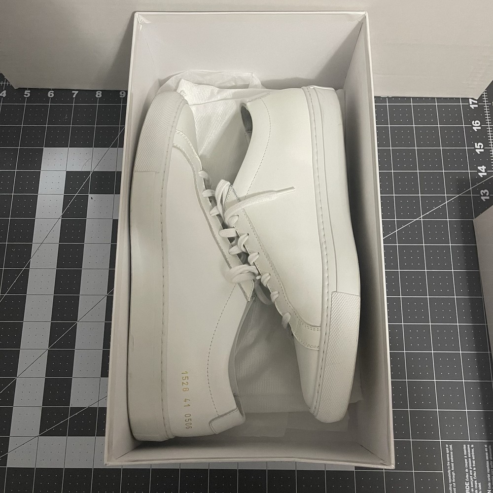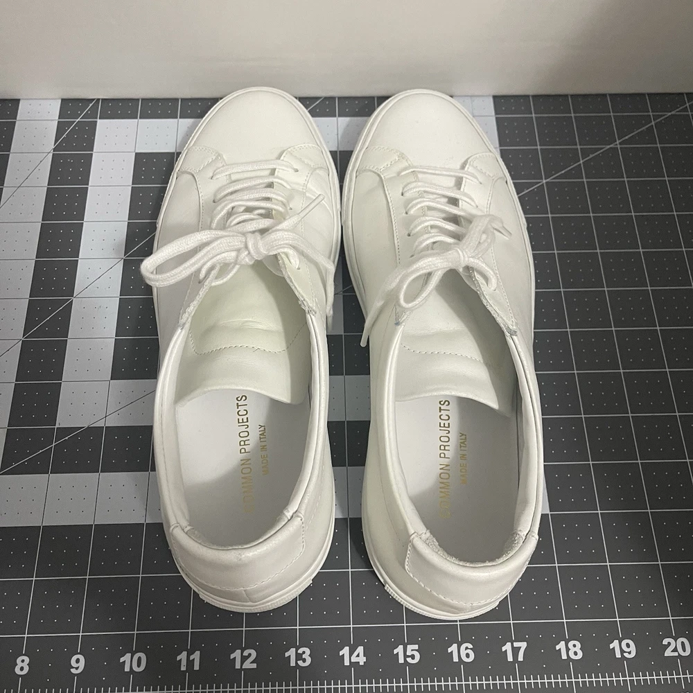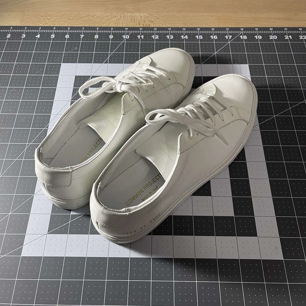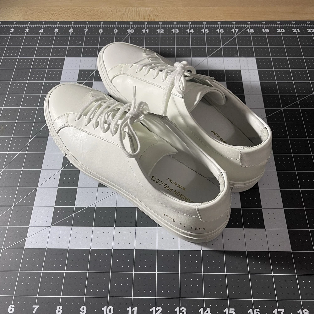 Common Projects Achilles Low White Size 41 Previously Owned Great Condition Model: 1528 41 0506 Size 41 EU Can fit a US size 8 or 8.5. The brand usually runs a little big, so I would say it fits 8.5 US. I advise you to go to your local store to try your size (Neiman Marcus, Saks Fifth Ave or Nordstrom). Condition: Pre-owned. Leather is smooth. Please, look at all pictures to see full condition of the shoes. Slight yellowing on inside left shoe near lace holes. Made in Italy. Original retail price: $400+. These sneakers come with box and dust bag. Box is slightly damaged. PLEASE KNOW YOUR COMMON PROJECTS SHOE SIZE BEFORE ORDERING AS I DO NOT ACCEPT RETURNS. EU SIZE 41. Thanks for shopping! AI Generated Description: Step into effortless style with the Common Projects Achilles Low sneakers in a crisp white. Crafted from high-quality leather, these sneakers are a testament to minimalist design and comfort. The iconic aesthetic of these sneakers is a perfect match for casual or smart-casual ensembles, making them a versatile addition to any modern man's wardrobe. Size 41 (US Size 8) ensures a comfortable fit for a variety of foot shapes, while the durable construction promises longevity. As part of the revered COMMON PROJECTS Achilles product line, these sneakers blend premium materials with a sleek silhouette to create a timeless piece that transcends seasonal trends.