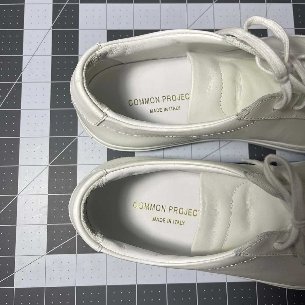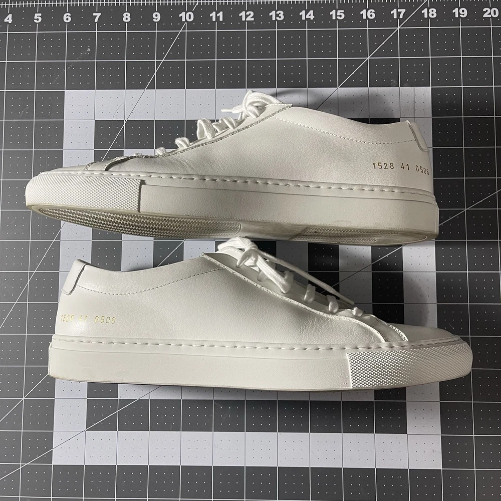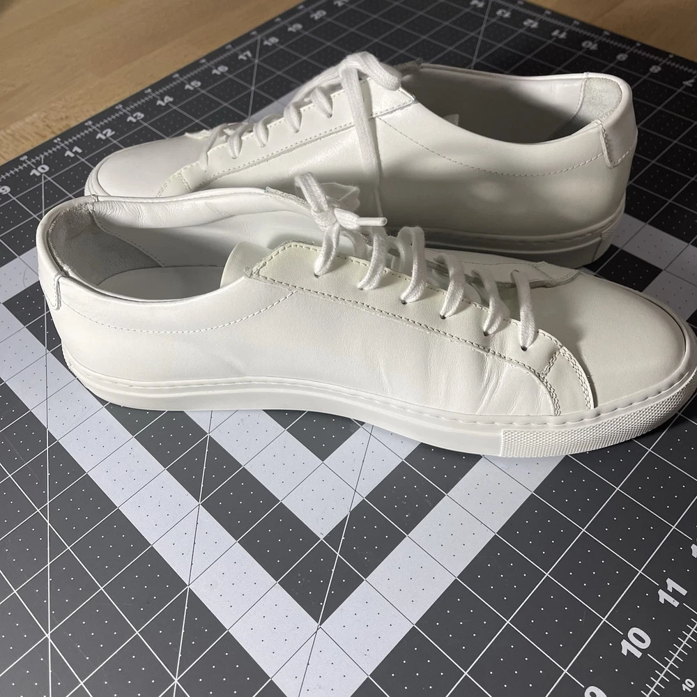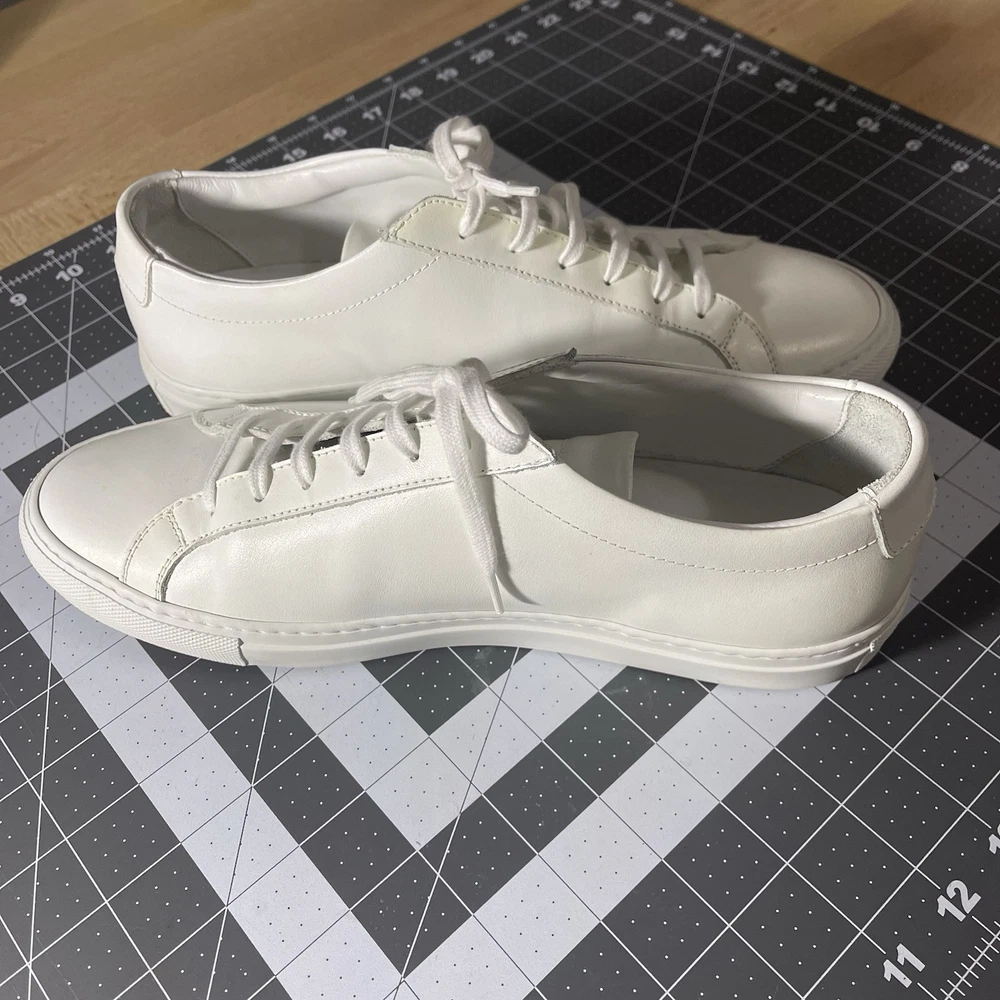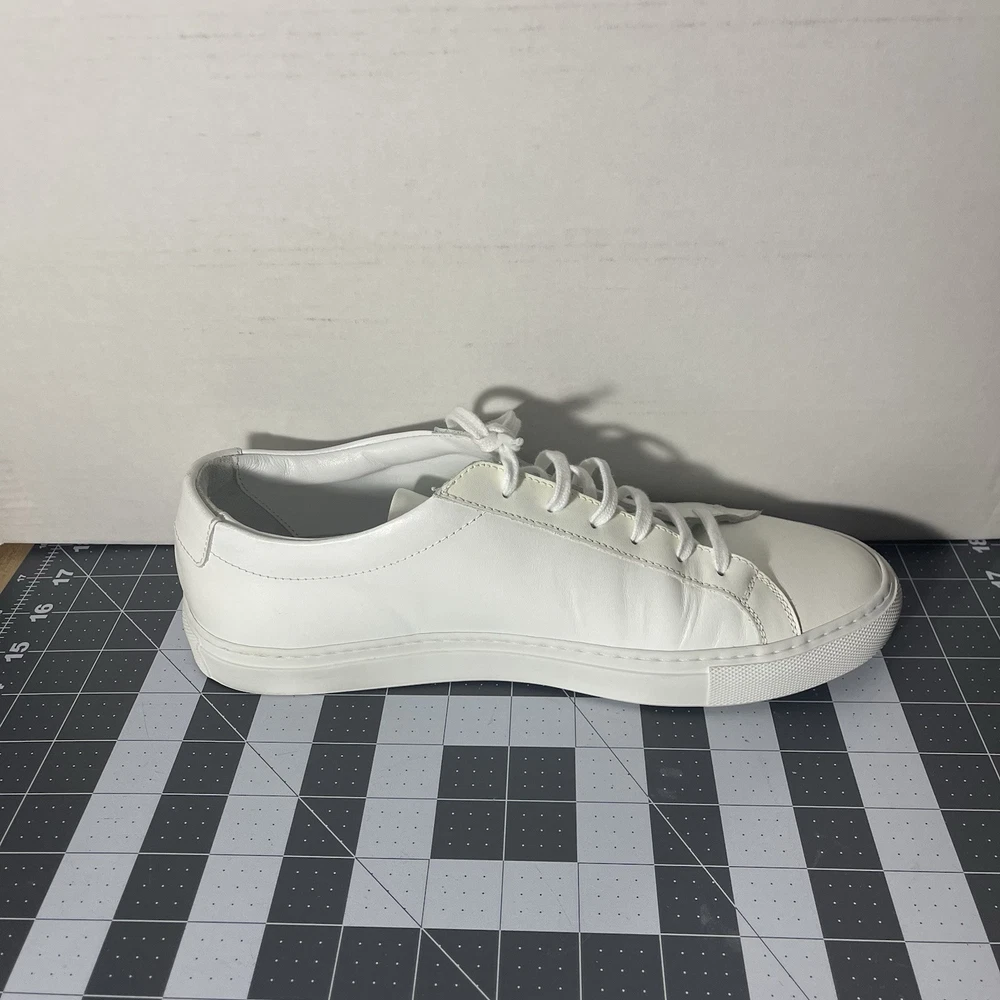 Common Projects Achilles Low White Size 41 Previously Owned Great Condition Model: 1528 41 0506 Size 41 EU Can fit a US size 8 or 8.5. The brand usually runs a little big, so I would say it fits 8.5 US. I advise you to go to your local store to try your size (Neiman Marcus, Saks Fifth Ave or Nordstrom). Condition: Pre-owned. Leather is smooth. Please, look at all pictures to see full condition of the shoes. Slight yellowing on inside left shoe near lace holes. Made in Italy. Original retail price: $400+. These sneakers come with box and dust bag. Box is slightly damaged. PLEASE KNOW YOUR COMMON PROJECTS SHOE SIZE BEFORE ORDERING AS I DO NOT ACCEPT RETURNS. EU SIZE 41. Thanks for shopping! AI Generated Description: Step into effortless style with the Common Projects Achilles Low sneakers in a crisp white. Crafted from high-quality leather, these sneakers are a testament to minimalist design and comfort. The iconic aesthetic of these sneakers is a perfect match for casual or smart-casual ensembles, making them a versatile addition to any modern man's wardrobe. Size 41 (US Size 8) ensures a comfortable fit for a variety of foot shapes, while the durable construction promises longevity. As part of the revered COMMON PROJECTS Achilles product line, these sneakers blend premium materials with a sleek silhouette to create a timeless piece that transcends seasonal trends.