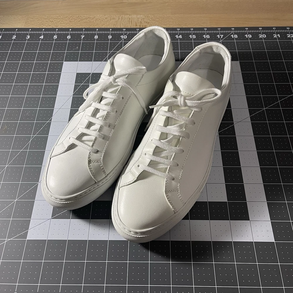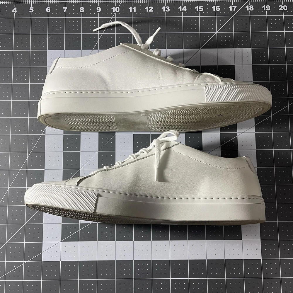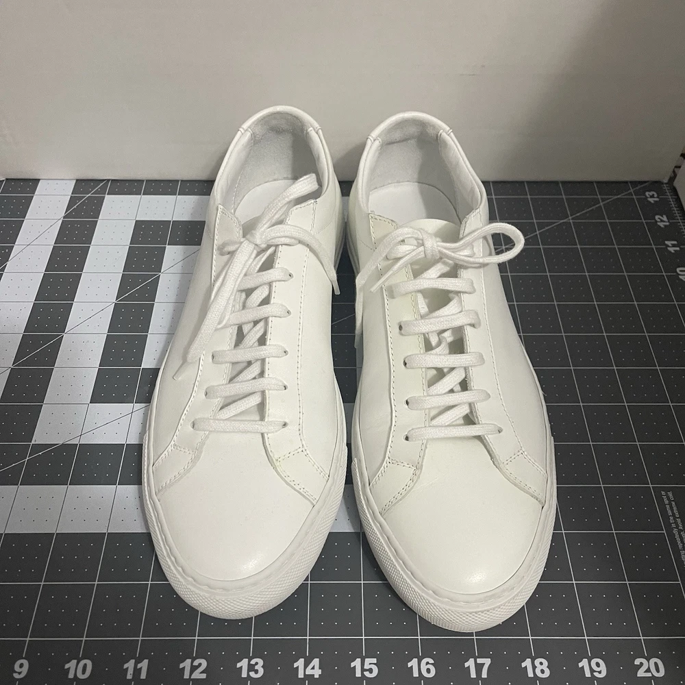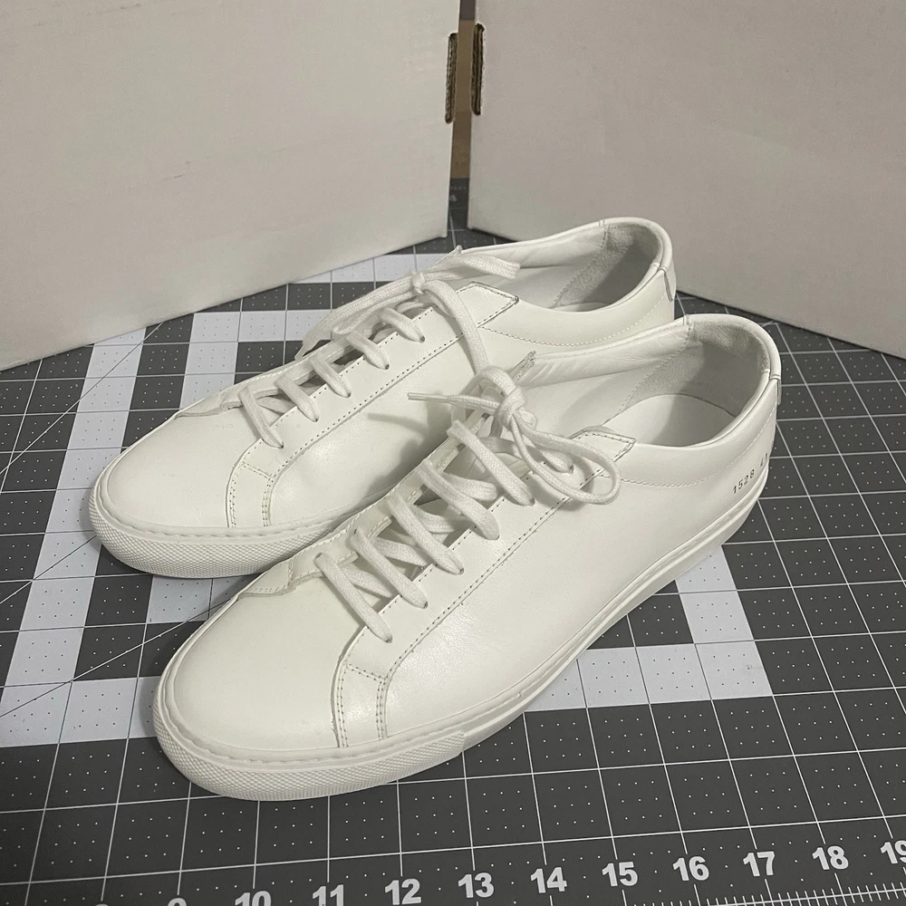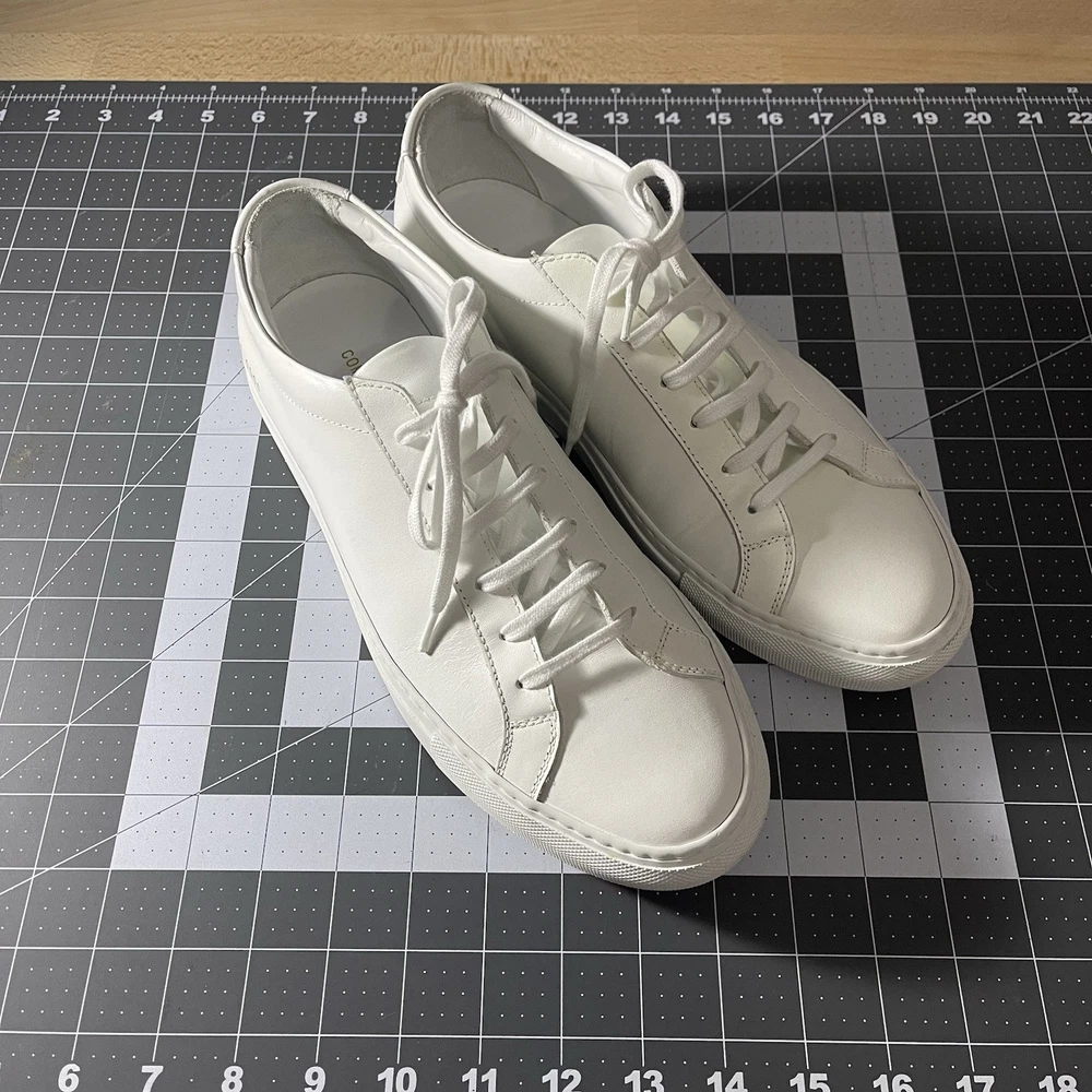 Common Projects Achilles Low White Size 41 Previously Owned Great Condition Model: 1528 41 0506 Size 41 EU Can fit a US size 8 or 8.5. The brand usually runs a little big, so I would say it fits 8.5 US. I advise you to go to your local store to try your size (Neiman Marcus, Saks Fifth Ave or Nordstrom). Condition: Pre-owned. Leather is smooth. Please, look at all pictures to see full condition of the shoes. Slight yellowing on inside left shoe near lace holes. Made in Italy. Original retail price: $400+. These sneakers come with box and dust bag. Box is slightly damaged. PLEASE KNOW YOUR COMMON PROJECTS SHOE SIZE BEFORE ORDERING AS I DO NOT ACCEPT RETURNS. EU SIZE 41. Thanks for shopping! AI Generated Description: Step into effortless style with the Common Projects Achilles Low sneakers in a crisp white. Crafted from high-quality leather, these sneakers are a testament to minimalist design and comfort. The iconic aesthetic of these sneakers is a perfect match for casual or smart-casual ensembles, making them a versatile addition to any modern man's wardrobe. Size 41 (US Size 8) ensures a comfortable fit for a variety of foot shapes, while the durable construction promises longevity. As part of the revered COMMON PROJECTS Achilles product line, these sneakers blend premium materials with a sleek silhouette to create a timeless piece that transcends seasonal trends.