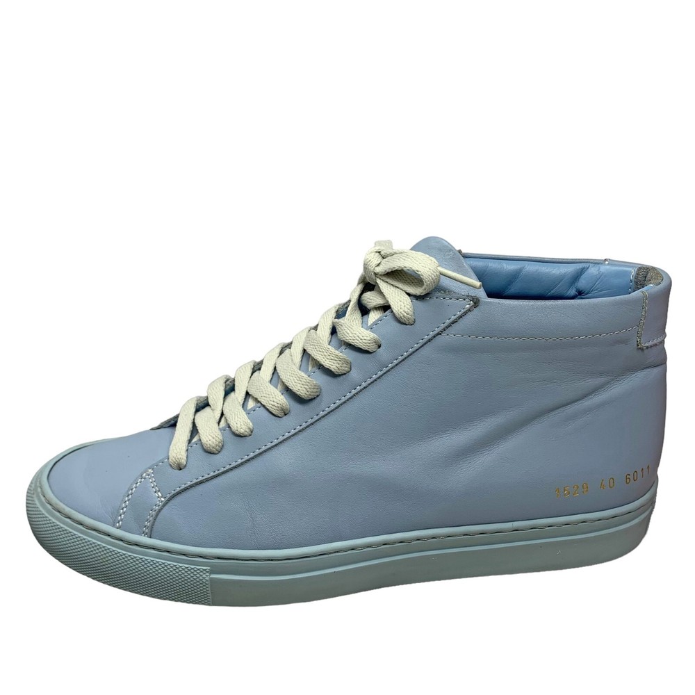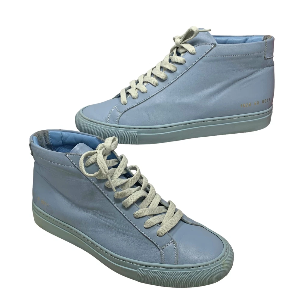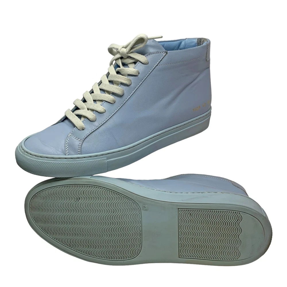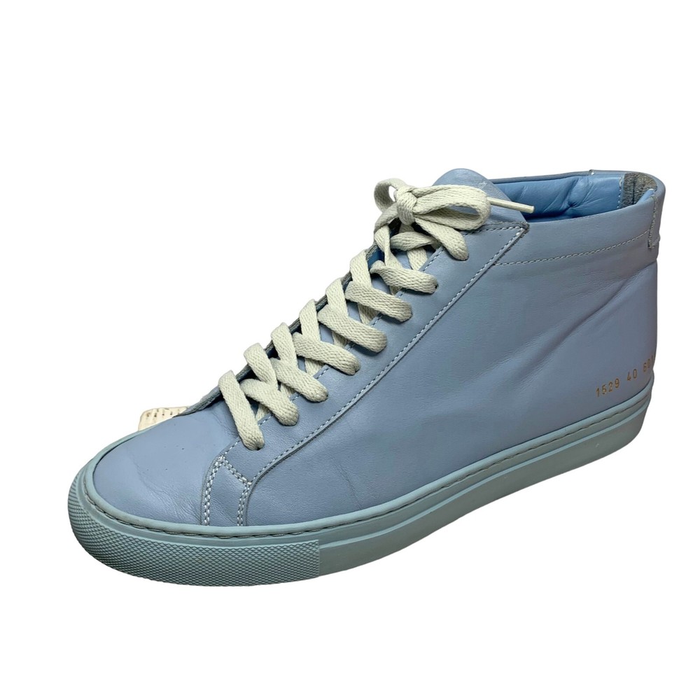 Common Projects Mid Top Sneakers Style/Model No.: Achilles / 1529 Blue Nappa Leather Upper Round Toe Lace Up Closure Feature(s): Golden Foiled Numbers at Heel counter Reinforced rubber outsole. Made in Italy Men's Size: 40 IT / 7 US Note/Condition: Signs of Insole and Outsole wear; Smudge on foil at right heel counter - please view pics. Thanks for Stopping By!