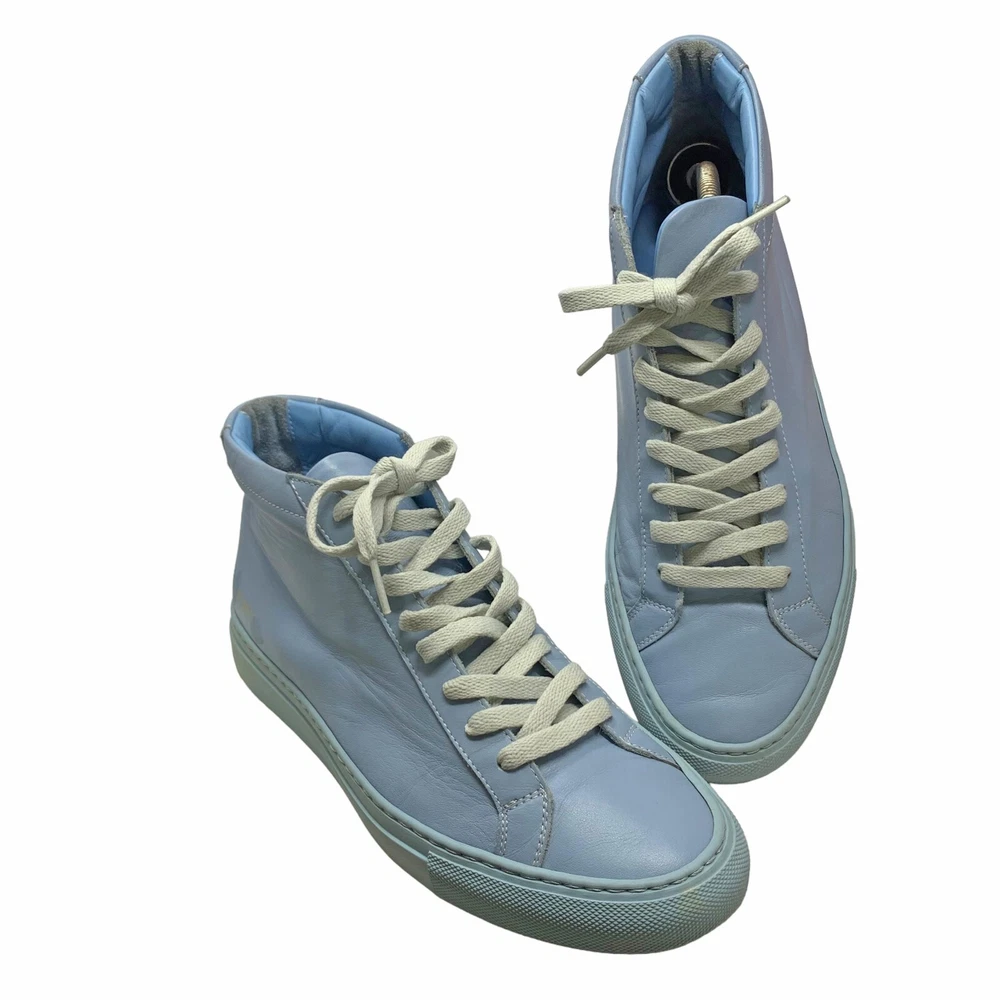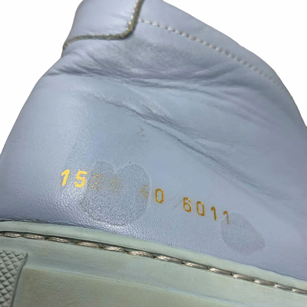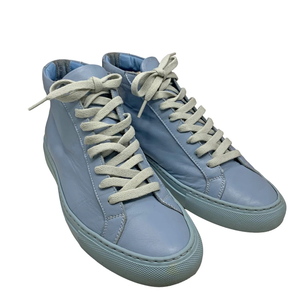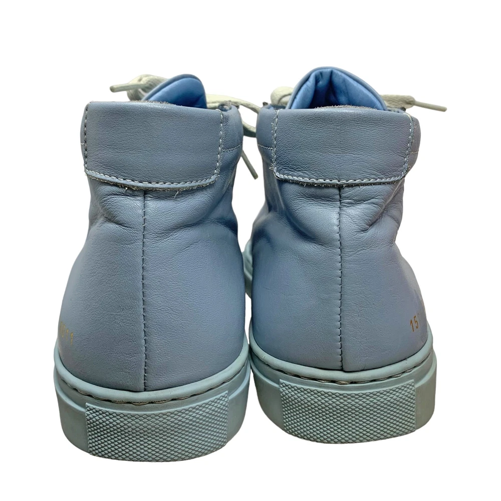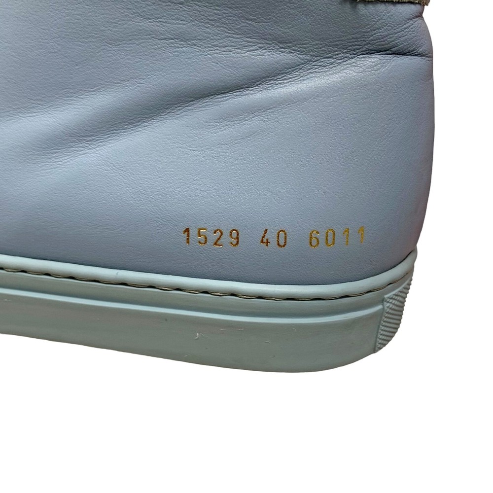 Common Projects Mid Top Sneakers Style/Model No.: Achilles / 1529 Blue Nappa Leather Upper Round Toe Lace Up Closure Feature(s): Golden Foiled Numbers at Heel counter Reinforced rubber outsole. Made in Italy Men's Size: 40 IT / 7 US Note/Condition: Signs of Insole and Outsole wear; Smudge on foil at right heel counter - please view pics. Thanks for Stopping By!