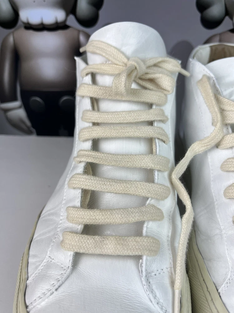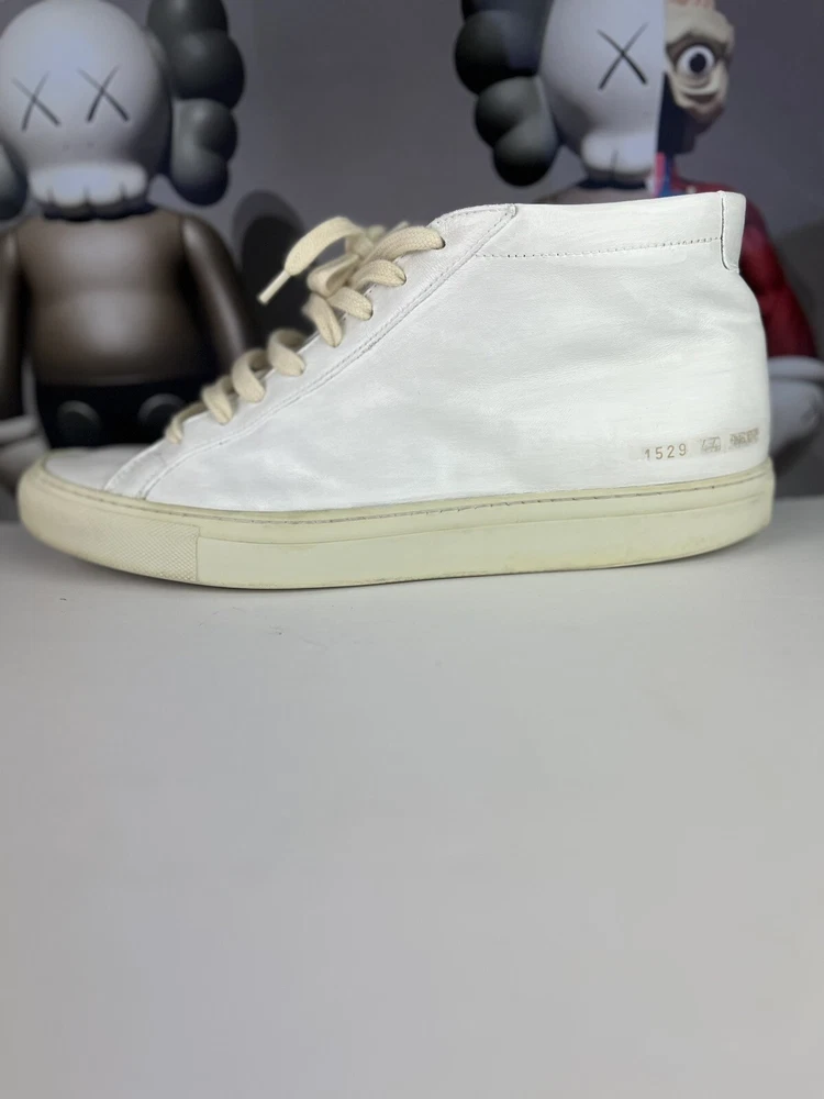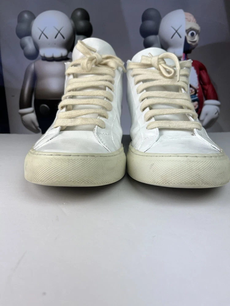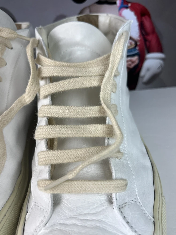 Elevate your casual shoe collection with these Common Projects Achilles Mids. Crafted with high-quality leather in Italy, these sneakers feature a solid white pattern with hand-painted accents. The lace-up closure ensures a secure fit, while the rubber outsole provides durability and traction. These shoes are part of the COMMON PROJECTS Achilles product line and are perfect for men who want to add a stylish touch to their wardrobe. With a UK shoe size of 10 and a US shoe size of 11, these sneakers are available in size 44. The leather lining and insole provide comfort, making these shoes perfect for daily wear. ****this sneakers have been repurposed/ hand painted by hand - giving it the Maison Margiela style