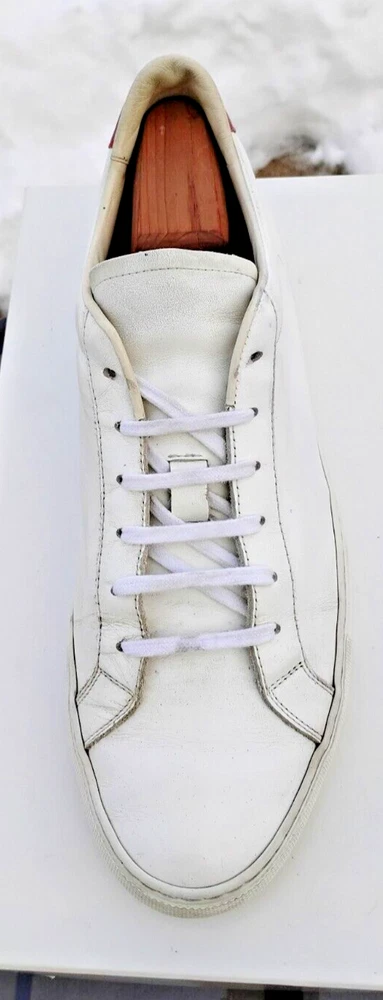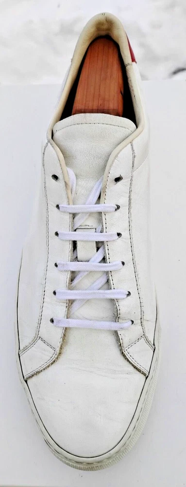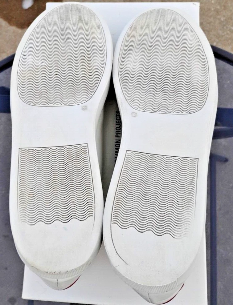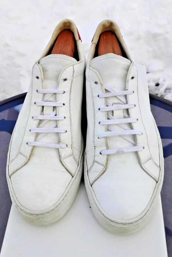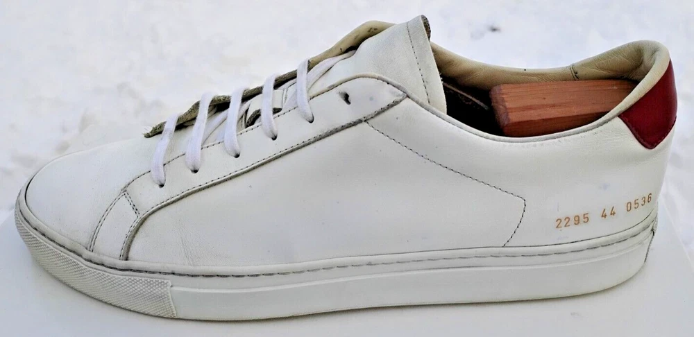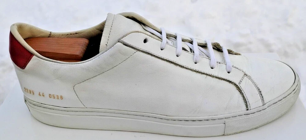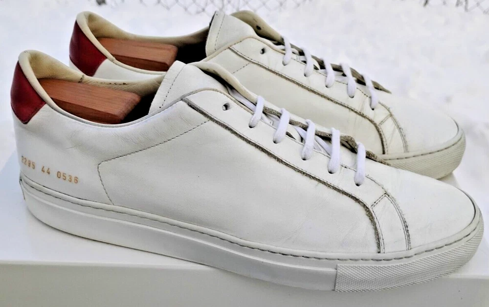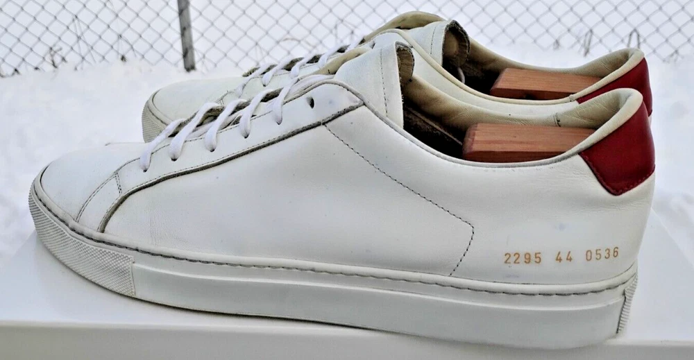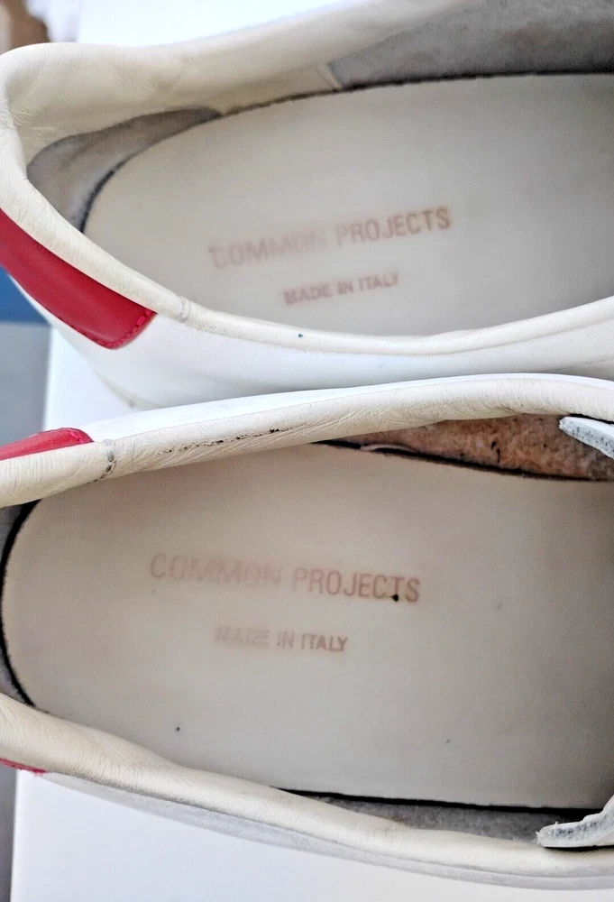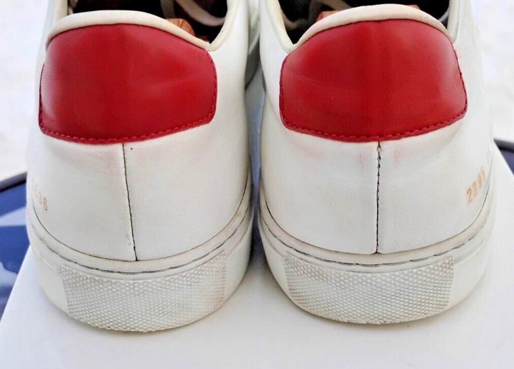 Common Projects Achilles Retro Low White/ Red 2295 EU 42 US 9/9.5 $450 Can fit a US size 9 or 9.5. The premier luxury minimalist sneakers. $450 MSRP Shoes are in pre-owned condition. Please look at all pictures to see full condition of the shoes. Please inquire with any questions. Quick and fast shipping. Shoe trees and original shoe box are not included. Please know your proper shoe size before ordering.