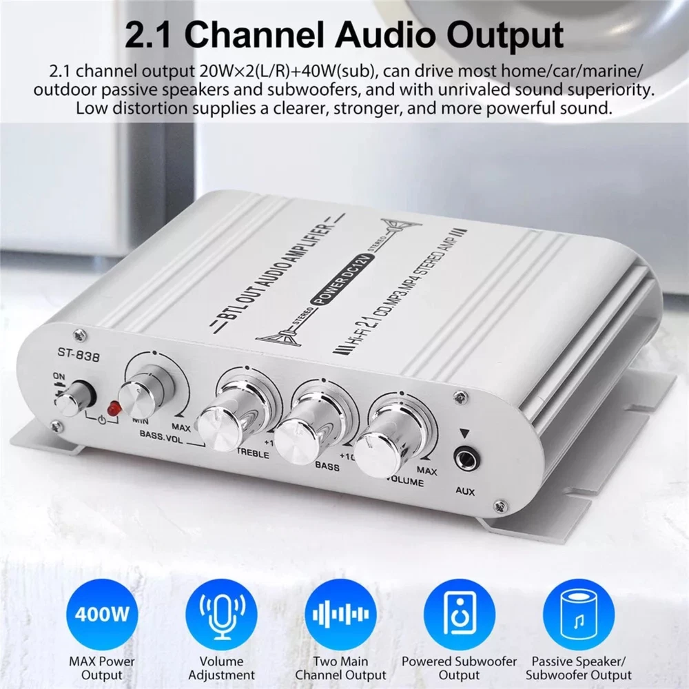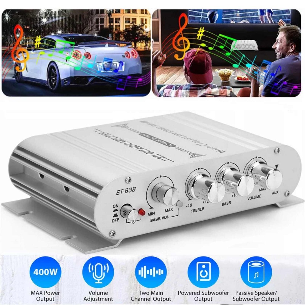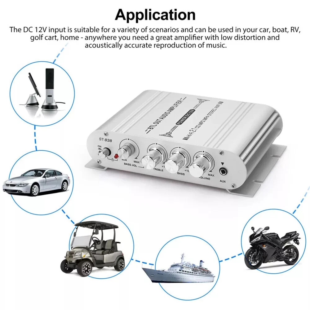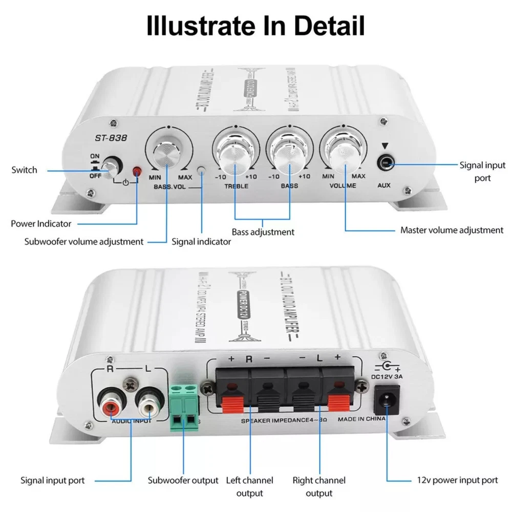 Product Description Features: Outstanding 2.1 Channel Audio Output: Boasting a powerful 2.1 channel configuration with 20W×2 (left/right) for the main channels and 40W for the subwoofer, it effortlessly drives a wide range of home, car, marine, and outdoor passive speakers and subwoofers, delivering unparalleled sound quality. The low distortion design ensures a clearer, stronger, and more powerful audio experience. Universal Compatibility with Elegant Design: Equipped with standard stereo RCA and 3.5mm AUX inputs, it seamlessly connects to devices like iPads, mobile phones, MP3 players, CD players, TVs, and computers. In addition to the main volume control, it features dedicated treble, bass, and subwoofer volume adjustments, allowing you to easily enjoy high-quality music tailored to your preferences. Flexible Audio Adjustment: Featuring crisp and responsive buttons for power control and a rotary knob for master volume adjustment, it offers effortless customization to suit your listening needs. Whether it's rocking tunes or soothing melodies, it delivers perfect sound every time. Compact and Stylish: With its compact design and exquisite matte silver casing, it not only looks fashionable and durable but also boasts a unique structure that makes it easy to install in cars, boats, or other tight spaces. It saves valuable space while remaining convenient to operate. Versatile Applications: Suitable for DC 12V input, it's ideal for various scenarios, including cars, boats, RVs, golf carts, and even homes. Wherever you need a great amplifier with low distortion and acoustically accurate music reproduction, this is the perfect choice. Specifications: Model: ST-838 Color: Silver Number of Channels: 2.1 Power Amplifier Type: HIFI Power Amplifier Audio Input: Stereo L/R RCA / 3.5mm AUX Audio Output: Cable Speaker Jacks + Subwoofer Bluetooth: Not Supported Input Voltage: DC 12V/3A (Power supply not included) RMS Power: 20W x 2 + 40W Max Power: 200W + 200W Channel Configuration: 2.1 Power Amplifier, supports connection to 2 speakers and a subwoofer Speaker Impedance: 4-8Ω Frequency Response: 20Hz - 20KHz Distortion: 0.4% Signal-to-Noise Ratio (SNR): 80dB Resolution: 47K Working Voltage: DC 12V Package Included: 1 x Power Amplifier (Power supply not included) Shipping Returns Contact Us Payment 1. Items sent from US warehouse. 2. Receiving time = Processing time + Shipping time. 3. Pro cessing Time: Around 1-2 business Days. 4. Shipping Time: 3-5 business day. it may have a little delay during some holiday (such as Christmas), any problem, please feel free to contact. 1. 30 days warranty from the purchased date. Please contact us via email before returning the defective item. 2. Our warranty does not extended to any product that are physically damaged or that are not under normal operating conditions as result of misuse or improper installation on the buyer/user's part. 3. Return items should include the original packaging and all accessories. buyers MUST contact us for the returning address. 4. In all cases, buyers pay shipping fees at their own cost to return products for exchange or refund. We will be responsible for the postage of replacements. Refund will be made upon receipt of the returned item. If you have any question, please e-mail us immediately, we will reply you as quickly as possible. We care about our valued customers, and will always try to help you. We accept all verified payment from eBay. Shipping 1. Items sent from US warehouse. 2. Receiving time = Processing time + Shipping time. 3. Pro cessing Time: Around 1-2 business Days. 4. Shipping Time: 3-5 business day. it may have a little delay during some holiday (such as Christmas), any problem, please feel free to contact. Returns 1. 30 days warranty from the purchased date. Please contact us via email before returning the defective item. 2. Our warranty does not extended to any product that are physically damaged or that are not under normal operating conditions as result of misuse or improper installation on the buyer/user's part. 3. Return items should include the original packaging and all accessories. buyers MUST contact us for the returning address. 4. In all cases, buyers pay shipping fees at their own cost to return products for exchange or refund. We will be responsible for the postage of replacements. Refund will be made upon receipt of the returned item. Contact Us If you have any question, please e-mail us immediately, we will reply you as quickly as possible. We care about our valued customers, and will always try to help you. Payment We accept all verified payment from eBay. You may also like 5/16" Line Fuel Filter Replace Part For Mercury For Quicksilver Marine Engine 12.33 USD Durable For DeWalt 20V DCB201/DCB203 Li-Ion Battery Plastic Replacement Case 17.63 USD 1.99 USD Metal Bead Eyeglass Chain Glasses Strap Holder Lanyard Sunglasses Non-slip 8.93 USD 1.99 USD 1.8mm Thickness Quick Release Watch strap Band Spring Bar Repairing Tool 17.53 USD 1.99 USD 3D-printed Material Fuel Tank Kit For Gundam MG 1/100 Sazabi ver ka Model Kit 23.63 USD 1.99 USD New MB-D18 Vertical Multi-Power Battery Grip Replacement For Nikon D850 Camera 55.93 USD 1.99 USD powered by