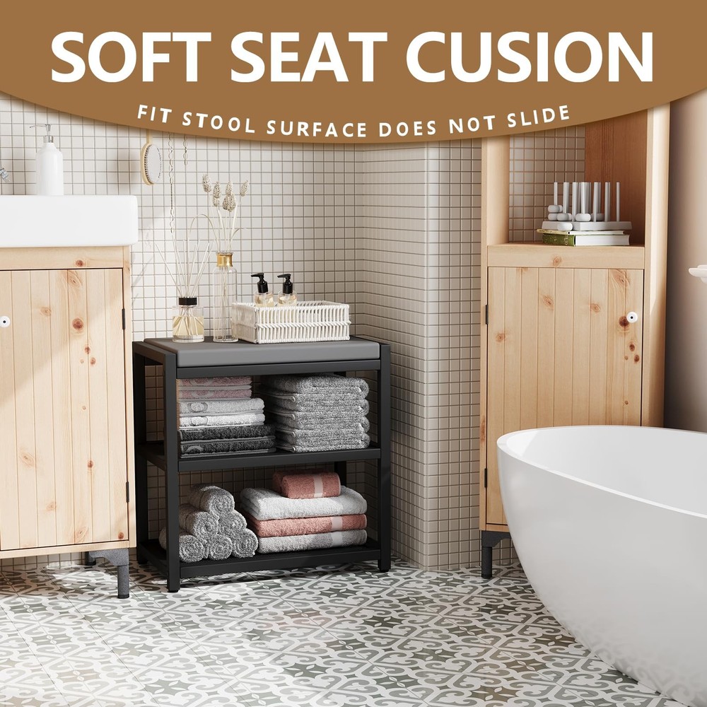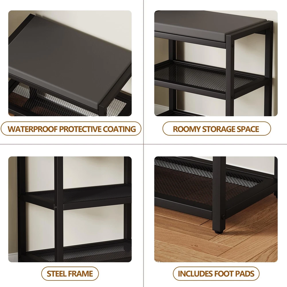 Shoe Bench Shoe Rack Storage Bench Entryway Bench Shoe Shelf with Seat Cushion, Stable Shoe Organizer for Entryway Comfortable Seats: Our Shoe Bench is designed with a detachable cushion to provide you with a comfortable shoe changing experience. The cushion is padded with thickened sponge and 1" thick, high-resilient, high-density foam, ensuring that you can sit on it comfortably without deformation. Strong Support: This shoe rack bench is built with a robust powder-coated steel frame, offering firm and reliable support. Say goodbye to hard, stone-like stools and try our comfortable Small Shoe Bench! It not only provides durability but also has a maximum static load of 300 lb, making it a strong seating option for your needs. Enough Storage Space: Organize your home in style with our Shoe Bench! Whether you need stylish storage for your foyer, entryway, or end-of-bed living room or bedroom, this practical shoe rack bench is the perfect solution. Its ample storage space allows you to neatly organize shoes, bags, books, and more, keeping your space clutter-free. Effortless Clean, Easy Assembly: Our upholstered Shoe Bench features an easy-to-clean synthetic leather surface, ensuring simple maintenance. Additionally, it comes with clear and straightforward instructions, along with an assembly tool, making setup a breeze. Spend less time on maintenance and assembly, and more time enjoying the convenience of our shoe rack bench. Satisfaction Customer Service: Your satisfaction is our top priority. In the rare event of rusted items due to wet weather, we have enhanced our quality control measures. If you open the box and find any rusted parts, please contact us immediately. We are committed to resolving the issue by sending you a new one or providing a 100% refund, ensuring your complete satisfaction.