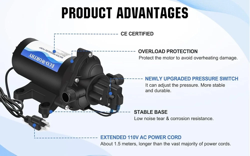 Compact 4.0GPM Water Pressure Pump with Automatic Smart Switch for Irrigation ‹ › ‹ › ‹ › ‹ › ‹ › ‹ › ‹ › ‹ › ‹ › Compact 4.0GPM Water Pressure Pump with Automatic Smart Switch Product Overview: This exceptional diaphragm pump is engineered to meet your water delivery needs with remarkable efficiency. Designed for versatility and reliability, it is the perfect solution for various applications, from irrigation to marine use. Key Features: Powerful Performance: The 110V AC diaphragm pump delivers a robust flow capacity of 4.0GPM, ensuring low water pressure is a thing of the past. Intelligent Operation: Equipped with a smart pressure switch, this pump automatically turns on and off based on water demand. It runs silently and shuts itself off when faucets are closed, providing convenience and peace of mind. Adjustable Pressure: The pressure range is customizable, allowing adjustments between 45-70PSI based on your specific requirements. Self-Priming Capability: With an impressive self-priming height of up to 9.8 vertical feet and a maximum lift of 148 feet, this pump ensures reliable operation even in challenging conditions. Safety First: Integrated thermal overload protection safeguards the pump by automatically disconnecting the circuit when temperatures exceed 70℃/158℉, preventing motor damage. Versatile Applications: Whether for RVs, marine vessels, garden irrigation, or home use, this pump is your go-to solution for efficient water transfer and pressure. Why Choose Our Water Pressure Pump? The perfect blend of power, safety, and convenience awaits you with our Compact 4.0GPM Water Pressure Pump. For anyone who demands consistent water pressure across a variety of settings, this pump stands as an unrivaled choice, allowing for continuous operation for over an hour. Your satisfaction is our priority. Should you have any questions or require assistance during use, our dedicated support team is just a communication away, ensuring you enjoy a flawless shopping experience. Order Now! Transform your water delivery experience with our elite diaphragm pump — elevate your irrigation and water use efficiency today! Shipping Free & Fast Shipping - We offer free shipping to most of the USA with a normal delivery time of 3-7 days. However, due to the current situation, additional delivery time (up to 3 weeks) may be required for some items. Alternative Carriers - We may use alternative carriers (e.g. USPS, FedEx, UPS, etc.) to ensure your package arrives safely and on time. Due to the use of multiple carriers, we are unable to provide a tracking number automatically. Handling Time - Orders are processed and shipped within 1-2 business days of receiving cleared payment. Shipping Restrictions - Shipping to Alaska, Hawaii, Puerto Rico, Guam, and other US territories may incur shipping charges or delivery restrictions. Please contact us before ordering, or your order can be refunded/cancelled. State Restrictions - There may be restrictions based on your state of purchase. For example, certain items may not be shipped to California due to state regulations. Contact for Tracking Updates - If you require tracking updates or have any concerns about the delivery of your order, please feel free to contact us, and we will be happy to assist you. Return 30-Day Hassle-Free Returns - We want you to be completely satisfied with your purchase. If you are not, you can return the item within 30 days of receiving it for a full refund or exchange. Easy Return Process - To start a return, simply contact us and we will provide you with a prepaid return shipping label and detailed instructions. Restocking Fee - There are no restocking fees for returns. However, the buyer is responsible for return shipping costs if the return is not due to a seller's error. Refund Processing Time - Refunds will be processed within 5 business days of receiving the returned item in its original condition. Payment We accept all major credit cards, PayPal, and Apple Pay for your convenience. Your payment information is secure and encrypted to ensure a safe and seamless transaction. Please complete your payment within 3 days of purchase to avoid any delays in shipping. Feedback Your feedback is extremely important to us. We strive to provide the best products and customer service possible. If you are satisfied with your purchase, please take a moment to leave us a positive review. If you have any concerns or issues with your order, please contact us before leaving negative feedback. We are committed to resolving any problems and ensuring your satisfaction. Contact Us If you have any questions or concerns, please feel free to reach out to our customer support team. You can contact us through the eBay messaging system. We are available Monday to Friday, 9:00 am to 5:00 pm EST, and we will do our best to respond to your inquiry within 24 hours. Thank you for supporting our small family business! UPC: Not Set Model: Water Pressure Pump Power: 110V AC Unit Quantity: 4.0GPM Features: Submersible,Diaphragm Pump,Smart Pressure Switch,Quiet Operation,Self-Priming,Thermal Overload Protection,Adjustable Pressure Range,Multipurpose Use Type: Water Pump Brand: Unbranded Horse Power: 1/6 HP Maximum Working Pressure: 50 psi Item Width: Not Set Item Height: Not Set Item Length: Not Set Manufacturer Warranty: Not Set Installation: Universal Installation Item Weight: 10 lb Maximum Flow Rate: 4 Voltage: 110 V Maximum Head Lift: 148 ft Country/Region of Manufacture: Not Set Maximum Working Temperature: 70 °C Minimum Working Temperature: -4 °F Item Diameter: More Than 4 in MPN: Not Set Unit Type: lb