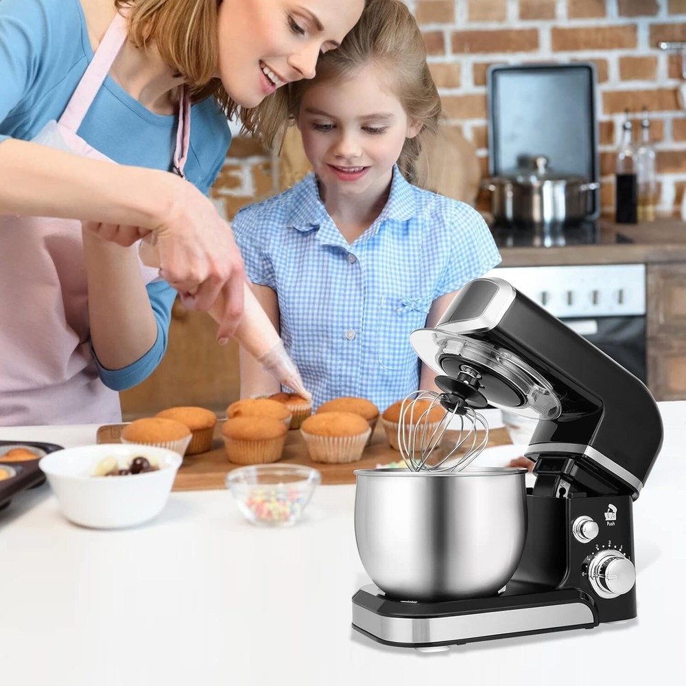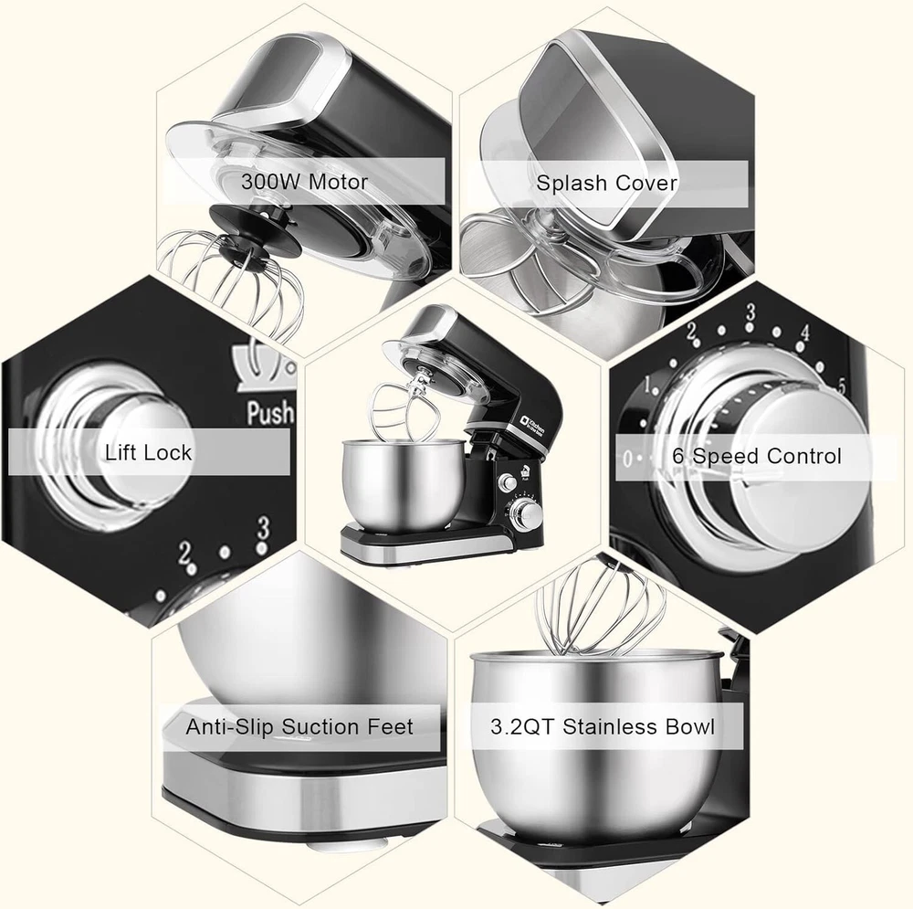 Batidora eléctrica pequeña de 3,2 cuartos para uso diario, 6 velocidades NEW US Diseño compacto y más opciones de color: La batidora de pie pesa menos de 3 kg y mide 32 x 18 x 26 cm. Es compacta y fácil de guardar, lo que ahorra espacio. Perfecta para cocinas pequeñas, apartamentos o espacios de almacenamiento limitados. Dispone de varios colores para satisfacer diversas necesidades estéticas en su cocina. Capacidad de 3.2 cuartos y diseño de cabezal inclinable: Nuestra batidora de cocina cuenta con un tazón de acero inoxidable de 3.2 cuartos, ideal para principiantes, familias de 1 a 2 miembros o parejas. Fácil de usar y limpiar. El diseño de cabezal inclinable permite instalar y desinstalar fácilmente el tazón y los accesorios. La tapa transparente antisalpicaduras evita que los ingredientes se ensucien. 6 velocidades y 4 ventosas antideslizantes: esta mini batidora cuenta con 6 velocidades diferentes, ideales para mezclar masa de pan, pastas espesas, merengues y crema batida para pasteles. Además, cuenta con velocidades más bajas para mezclar y afinar sus creaciones más delicadas, adaptándose perfectamente a diferentes ingredientes. Sus 4 ventosas más resistentes mantienen la máquina estable y evitan que se mueva o rebote durante el funcionamiento. Accesorios multiusos mejorados: gancho para masa de aluminio y batidor plano, y batidor de acero inoxidable fáciles de instalar, fabricados con materiales mejorados, más resistentes y duraderos. Una junta en la junta superior evita que los residuos de comida salpiquen y facilita la limpieza.