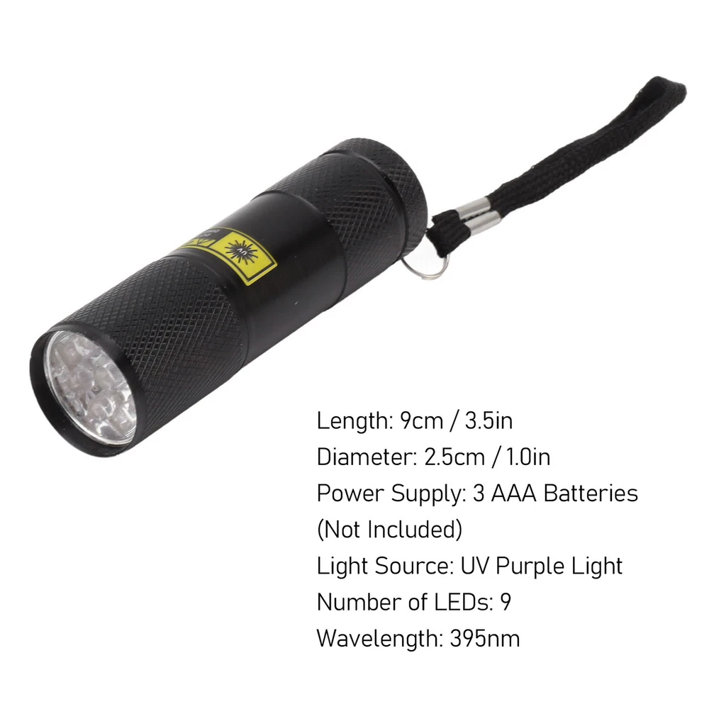 Feature: 1. Detect Stains: 395nm wavelength flashlight can reveal hidden food and pet urine stains on carpets and clothes, helping you keep your home clean. 2. : Made of IPX4 waterproof, and impact resistant aluminum alloy, this UV flashlight can withstand harsh weather conditions and rough handling, ensuring long lasting performance. (Do not invade water) 3. Superior Brightness: With 9 specially engineered LED bulbs, small UV flashlight provides you with clear and accurate visibility in low light conditions. (Batteries not included) 4. Compact and Portable: This UV flashlight is only 2.5cm in diameter and 9cm in length, weighing just 30g. Equipped with wrist strap, easy to carry. It is the ideal choice for carrying it with you wherever you go. It's perfect for outdoor activities like hunting for minerals or scorpions. 5. Multi Functional: In addition to detecting pet stains and scorpions, this versatile UV flashlight can also verify the authenticity of currency, passports, and IDs, making it a valuable tool for professionals and individuals alike. Specification: Item Type: Small UV Flashlight Material: Aluminum Alloy Weight: Approx. 37g / 1.3oz Length: 9cm / 3.5in Diameter: 2.5cm / 1.0in Power Supply: 3 AAA Batteries (Not Included) Light Source: UV Purple Light Number of LEDs: 9 Wavelength: 395nm Package List: 1 x Small UV Flashlight 1. Our listing price includes the value of goods,packaging cost,and export taxes,not including international duties. 2. duties,taxes,and charges are not included in the item price or shipping fee. 3. T he duties are buyers' responsibility .Please check with your country's customs office determine what these additional costs will be prior to your purchase. 4. All disputes arising from the duties will be submitted to ebay for solution. 1. Any questions, pls. contact us via ebay message or email us. We will reply your message within 48 hours. If you do not receive our reply within 48 hours, pls. post a message again because sometimes our message system may block some emails. 2. If you are satisfied with our service, pls. kindly leave us a positive feedback and give us the Detailed Seller Rating with all " 5 " in very area 3. Our aim is to provide Level Customer Service, your recognition will encourage us greatly and serve you better. We strive to keep all our customers satisfy. We will do our up most to exceed your expectations in customer service, communication and dispatching of your orders.