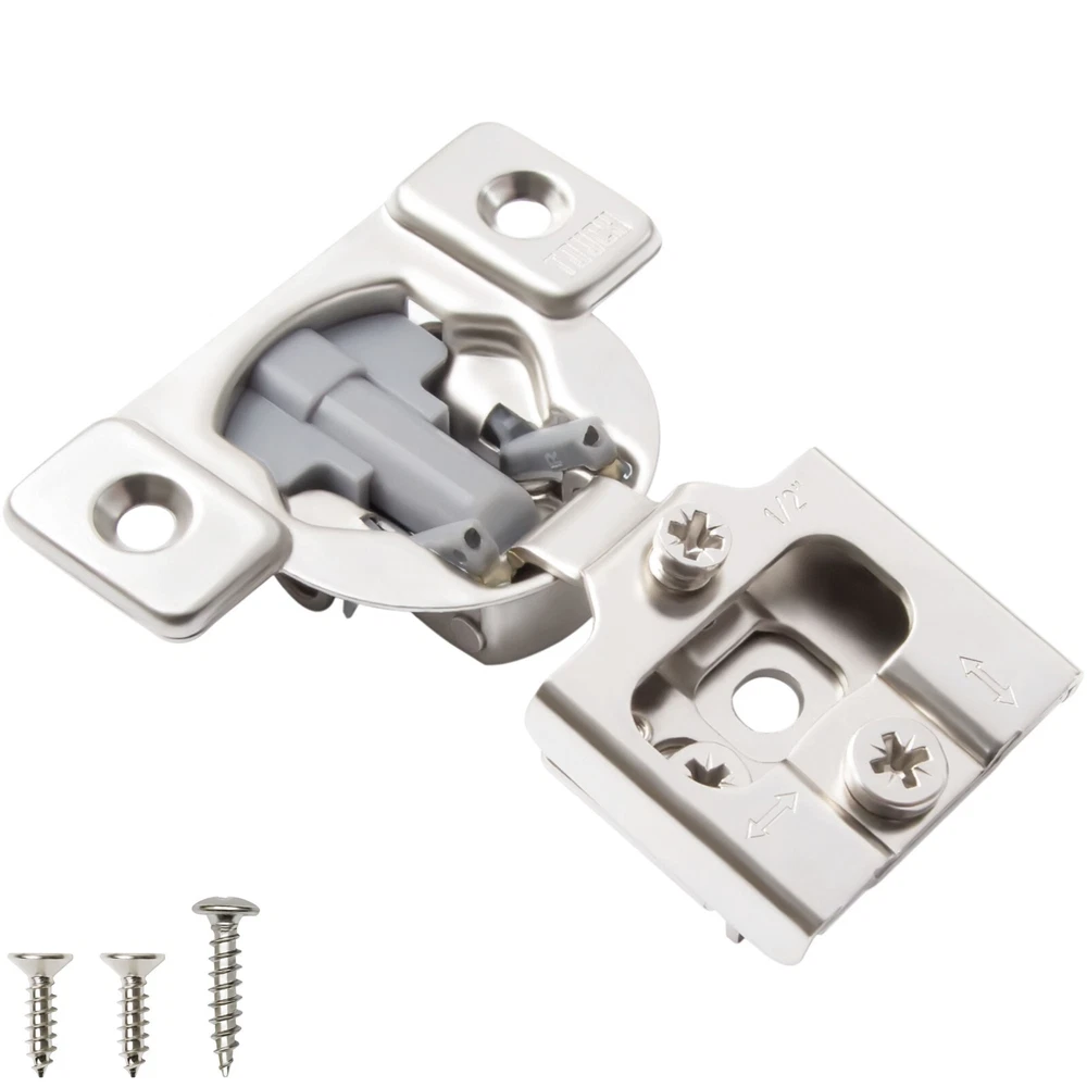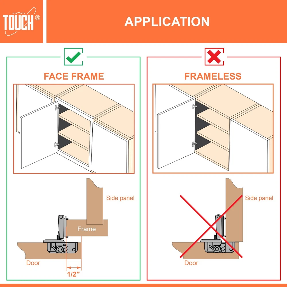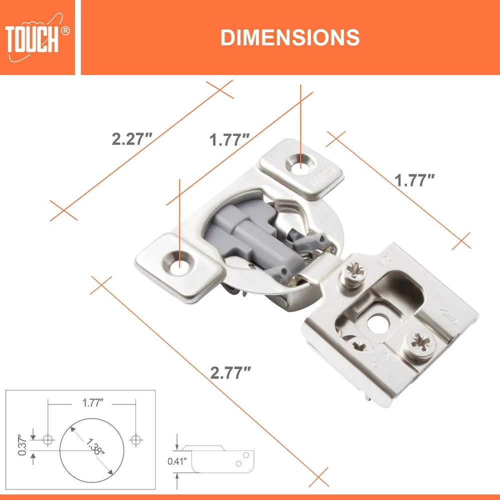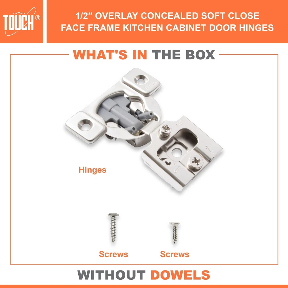 High-Quality Products TOUCH Cabinets Hardware is committed to providing a high-quality cabinet hardware, such as Door Hinges, Drawer Slides, and other kitchen cabinets hardware. Why TOUCH? Unlike other hinges, TOUCH compact - hidden soft close cabinet hinges come with two screw holes on the cabinet side to secure the hinge. The hinge’s unique design makes it height, depth and side adjustable, leaving room for no awkward gaps or clashing doors! Your satisfaction is our main priority, and we trust that our product will meet your needs. A 30-days full return/replacement is offered if faced with any obstacles, NO questions asked! SOFT CLOSE COMPACT CABINET HINGES 3D CAM ADJUSTMENT Keep your cabinets easy to open and simplify your bathroom or kitchen setup with these kitchen cabinet hinges. These cabinetry hinges allow cabinets to close easily and silently, making this cabinet hardware perfect for use with kitchen cabinet doors, bathroom vanity cabinet doors, wall cabinet and furniture cabinets. Ideal for use with face frame cabinets, the slide hinges are constructed with cold-rolled steel and can be conveniently installed for use with new cabinets, or as a replacement for old kitchen cabinet hardware, vanity and bathroom cabinets. The hinge hardware includes plastic dowels and cup covers for easy mounting, measure 1/2", and feature an opening angle of 105 degrees. SPECIFICATIONS Application: Face frame cabinet Closing type: Soft Close Mounting type: Screw-on or with dowels Opening angle: 105° Degree Diameter of hinge cup: 35mm Height of hinge cup: 10.5mm Distance of cup holes centers: 45mm Door thickness: 14-21mm CLOSING TYPE Soft close cabinet hinges features a built-in hydraulic damper. ADJUSTMENT 3D cam adjustment for easy adjust and precise Installation. OPENING 105° degree opening angle it’s easier to open doors to suit your kitchen needs. Mounting Type: Overlay Type: Closing Type: Face Frame 1/2" Half Inch Overlay Soft Close Face Frame 3/4" Overlay Soft Close Face Frame 1" Full Overlay Soft Close Face Frame 1.25" Overlay Soft Close