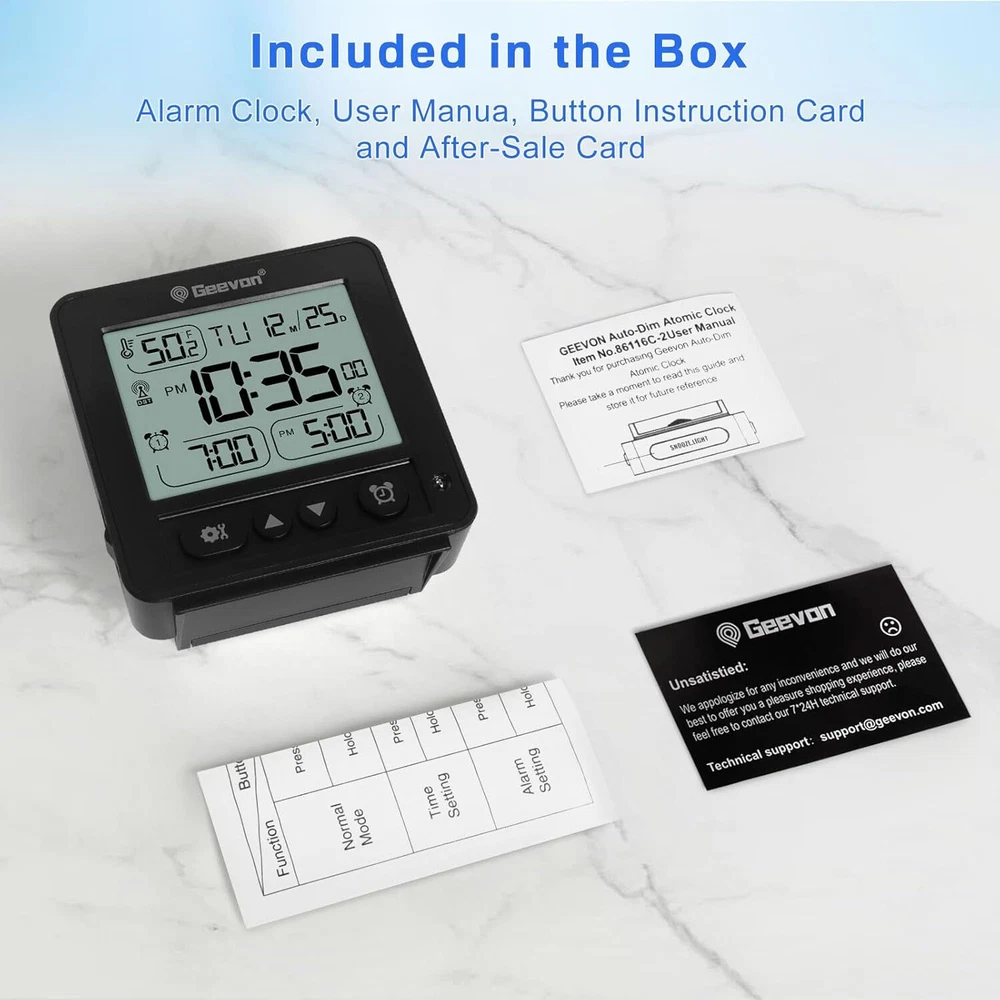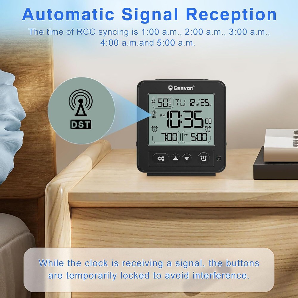 [Reliable RCC Time Sync for Accurate Timekeeping] Automatically syncs with RCC signals at 1:00 a.m., 2:00 a.m., 3:00 a.m., 4:00 a.m., and 5:00 a.m. Ensure your time zone is set correctly for precise updates. Manual syncing is also available by holding the “down” button for 2 seconds [Dual Alarms for Flexible Scheduling] Set two different alarms to match your daily routines or multiple schedules. This feature is suitable for couples, families, or anyone who needs separate wake-up times, making mornings easier and more convenient [Auto Light Function for Nighttime Convenience] The "Auto Light" button activates a soft blue glow in the dark, providing clear visibility of the time without being too bright or disruptive during sleep [Compact & Travel-Friendly Design] With a size of just 3.5"x3.8"x0.98", this portable alarm clock is easy to pack and carry, making it a perfect travel companion or a space-saving solution for bedside tables [8-Second Backlight for Quick Visibility] A simple press of the top button activates the backlight, which stays on for 8 seconds, allowing you to check the time easily in dim or dark conditions