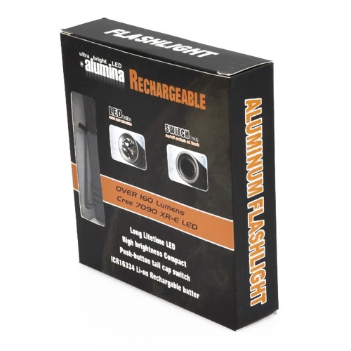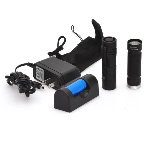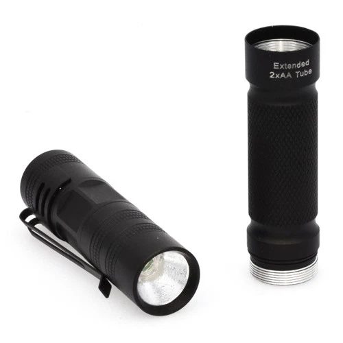 Features 3-watt CREE LED light source with output of over 160 lumens Operates on 1x CR123A battery or 2x AA batteries Durable anodized aluminum body with knurled grip Kit includes LED flashlight, rechargeable battery with charger, and nylon belt holster Long LED life of ~100,000 hours Description Featuring a bright and efficient 3W CREE 7090 XR-E LED, packed in a high-quality machined anodized aluminum body with smooth switch performance, this compact flashlight is a customer favorite. This flashlight takes 1x CR123A or the more easily accessible 2x AA batteries. Both the rechargeable Li-ion ICR17335 (replaces RCR123) and charger are included in the kit, meaning there is no need to purchased additional accessories. An extension tube is also included for use with 2x AA batteries. Specifications LED Type: 3W CREE 7090 XR-E Body Material: Machined aluminum Battery Type: 1x RCR123A, 1x CR123A, or 2x AA Battery Life: ~10 hours Switch Type: Clicky On/Off on rear LED Life Expectancy: 100,000 hours Dimensions with 1x CR123A: Ø = 0.85" (22mm), Length = 3.1" (79mm) Dimensions with 2x AA: Ø = 0.85" (22mm), Length = 5.75" (146mm) 20180507
