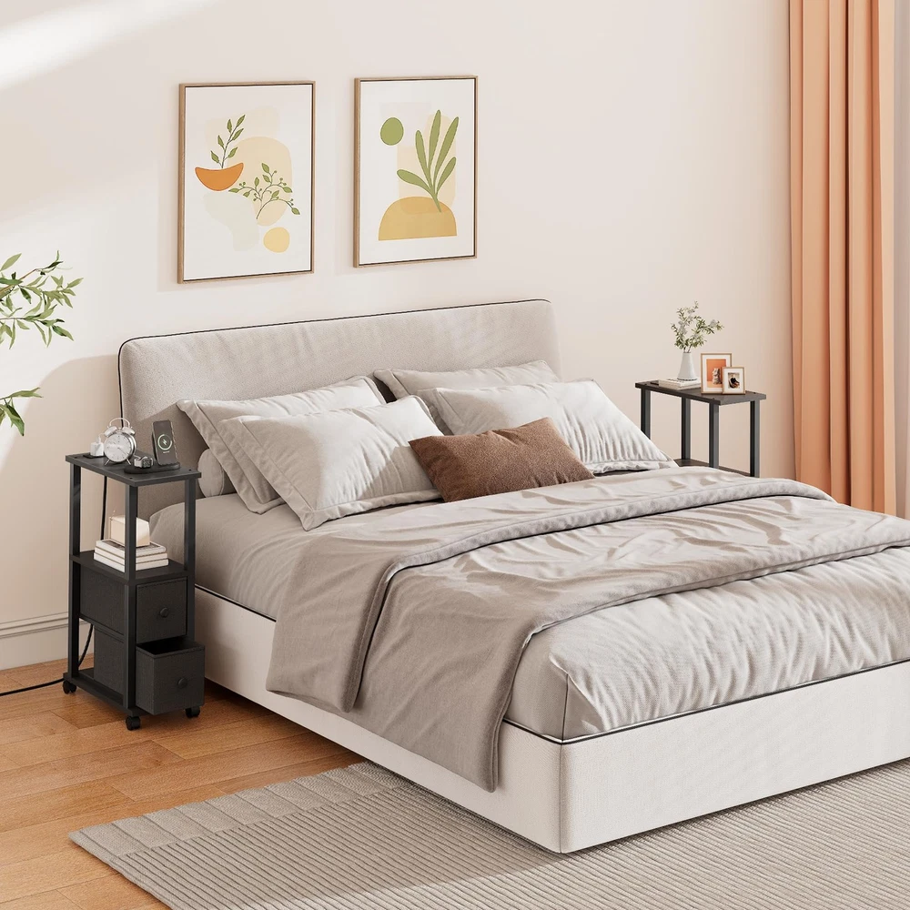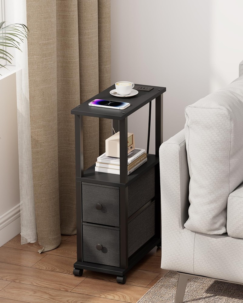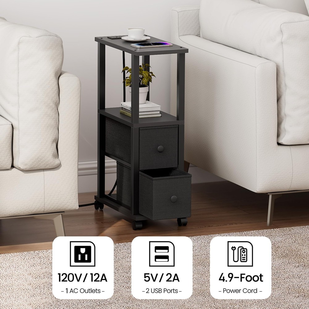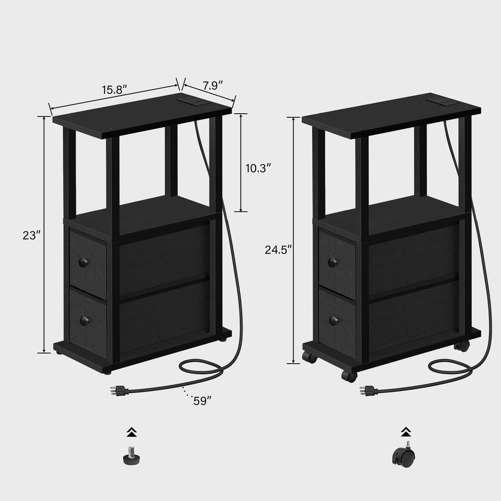 End Table [Side Table with Charging Station] This Narrow side table with 1 AC outlet, 2 USB ports, and the 4.5 ft extension cord helps you charge your phone, lamp, or game console at the same time. Keeps you away from wall corner where the home power outlet located. [2 Ways & Wheels/Adjustable Feet] The small end table provides you with 4 adjustable feet and 4 wheels, and you can choose whether to install wheels. The wheels allow you to move this end table freely. The adjustable feet for you to adjust on uneven floors. It also prevent the metal legs from directly touching the floor. Avoid tiles, Scratches on wooden floors. [3-Tier Storage for Small Space] Size: 7.9”D x 15.8”W x 23”H or 24.5”H(with wheels), 7.9” width, this industrial side table is perfect for small spaces as a sofa end table, nightstand put in the corner and small spaces, the beside table not very spacious but still has enough space to add a lamp, photo frame, coffee and magazines in the top panel, and you can charge your phone or tablet by placing it on the second layer board and you also can put storage basket on the bottom board. [Multi-purpose] The skinny end table can be used as a sofa side table, nightstand, bedside table, small coffee table, reading table, corner table, drink table, snack table, decorative displays table. It's an ideal choice for living room, bedroom, hallway, or office. [After Sale Service] Simple and Easy to Assemble! Assembly instructions are included in the package, no other special tools are required. Every end table is thoroughly and rigorously tested. friendly and professional customer service will respond to you within 24 hours. If you have any questions, please feel free to contact us!