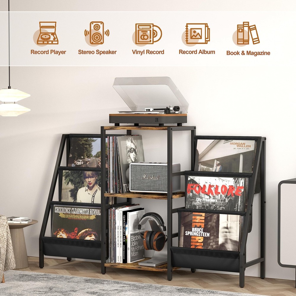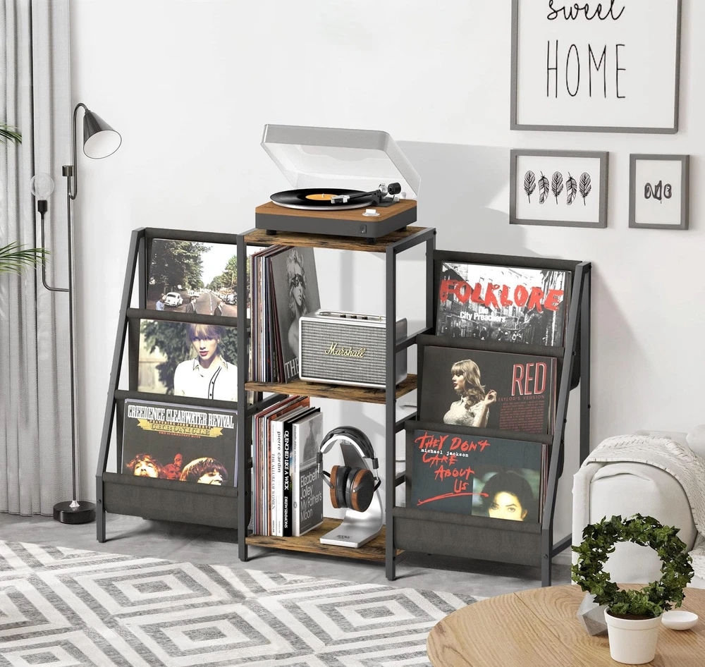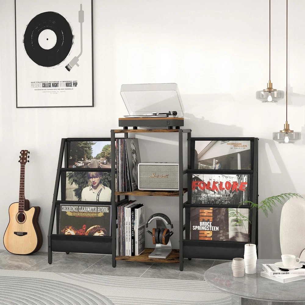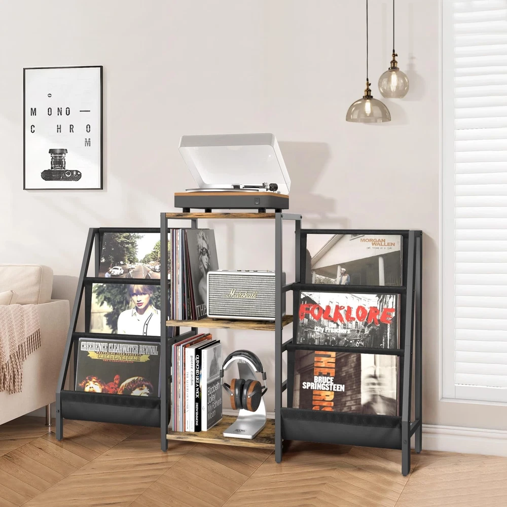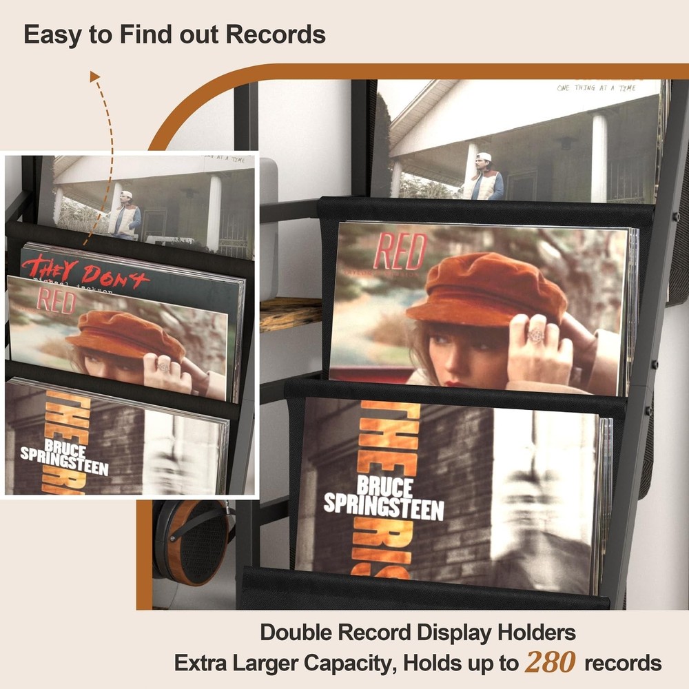 Record Player Stand with Vinyl Storage, Record Player Table with Vinyl Record Storage Up to 280 Albums, Turnta ble Stand with Record Holder Display Shelf, Record Cabinet for Media Stereo Audio Product Details Color: Two-side storage-Black&Brown Brand: Tewinko MPN: SL-01 UPC: Does not apply EAN: Does not apply Color: Two-side storage-Black&Brown Material: Wood, Metal Brand: Tewinko Item dimensions L x W x H: 11.8 x 51 x 29 inches Finish Type: Powder Coated Shape: ‎Rectangular Assembly Required: ‎Yes Special Feature: ‎Dust Resistant Manufacturer: ‎Tewinko Item Weight: ‎17.66 pounds Product Dimensions: ‎11.8 x 51 x 29 inches Country of Origin: ‎China Item model number: ‎SL-01 Date First Available: May 24, 2023 Larger-capacity Record Player StandFeaturing spacious 3-layer shelves and 2 vinyl display holders, the storage capacity of the record player table is double others. It offers a stylish spot to play/organize your record players, speakers, records, books, magazines, albums, media equipment and more. Turntable Stand with 2 Record HolderTwo stylish record display storage racks have totally 6-tier vinyl shelf storage spaces. The whole record stand can hold over 200 records. Its convenient to find out records and provides a browsing experience that feels like youre in a record shop. Top-quality Vinyl Record Storage StandHigh-end durable powder-coated metal frame to resist rust, high-quality thickened easy cleaning wooden board and high-grade oxford fabric offer stable support and ensure years of use. Versatile Style for Your Home DecorThe combination of vintage wood color and serene black infuses the record table with a retro vibe. When adorned with stunning and distinctive records on the vinyl display organizer, it exudes a mid century modern aesthetic, making it suitable for any style of home decoration. Multifunctional Record Holder StandExcept for being a record player cabinet with vinyl storage, this vinyl storage organizer also can be used as a magazine rack, a bookshelf with display, an audio rack, a stereo cabinet, a media shelf stand, an av rack.