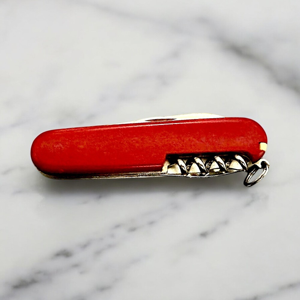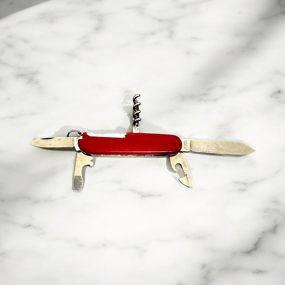The Swiss Army Multitool is a red manual multi-tool featuring a toothpick, corkscrew, fish scaler, and bottle opener. It has a plain edge blade with two blades, making it a versatile tool for various tasks. It is a modern folding knife manufactured by Swiss Army, suitable for collectors and everyday use. Blade 1 length- 2.75” Blade 2 Length- 1.5” Weight- 2.05oz Will only ship where legal, Let me know if you have any questions.