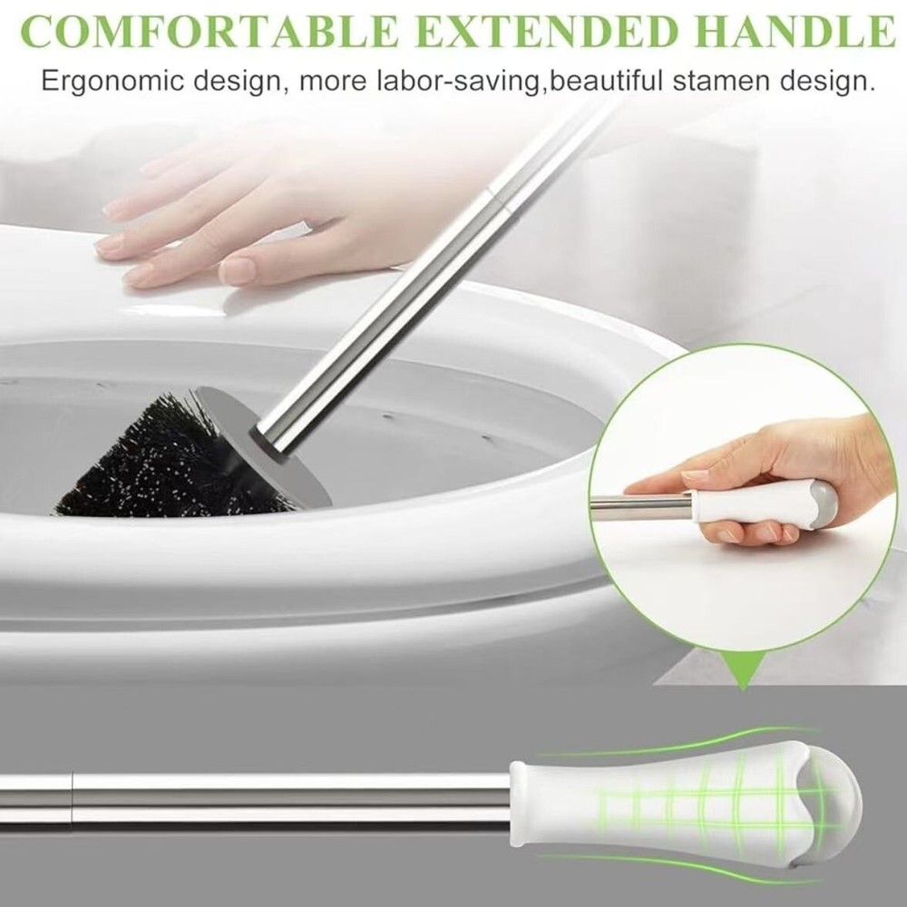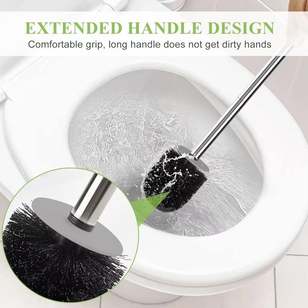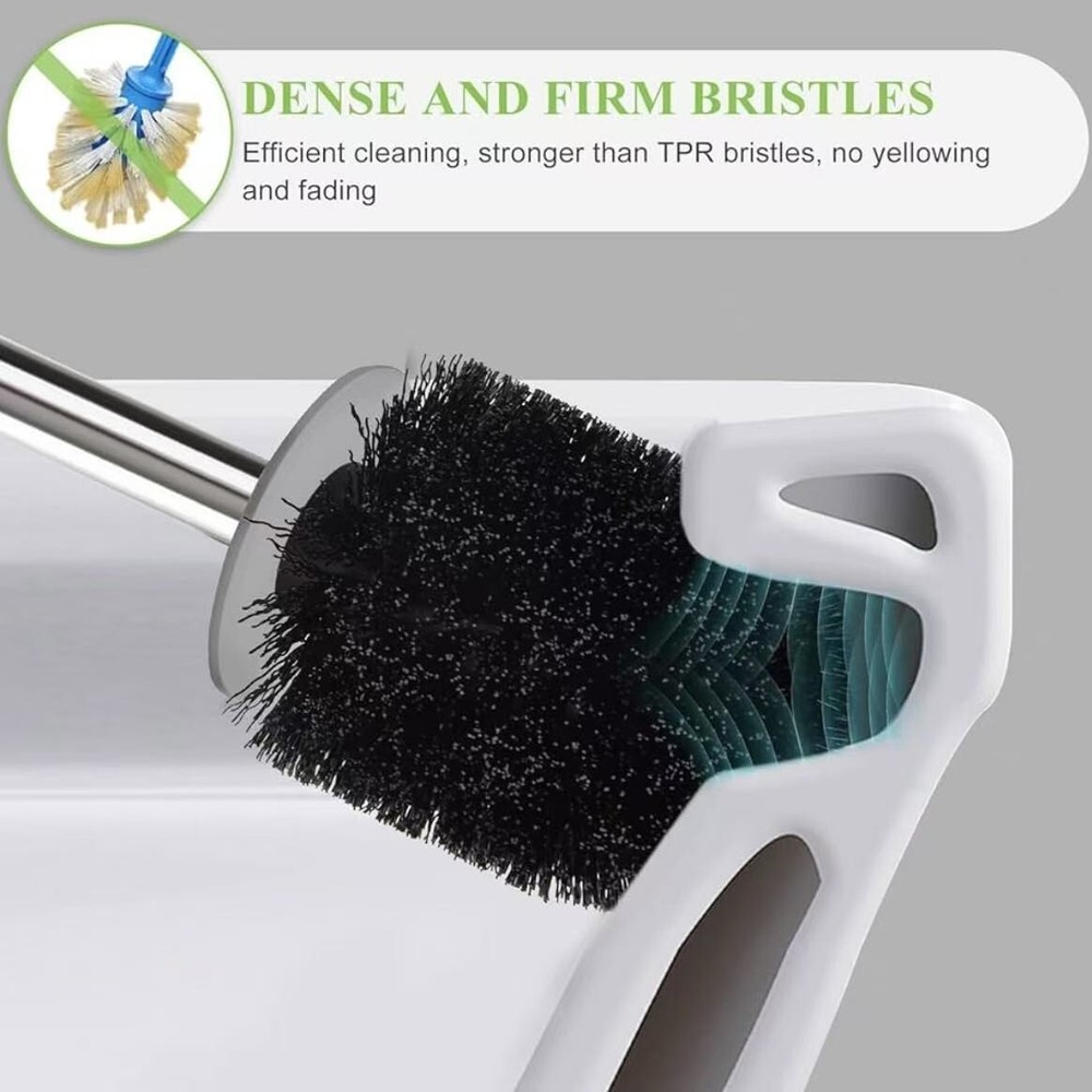 About this item Compact Size: The holder measures 4.1" x 3.3" x 5.1", Small Size holder Space Saving for Storage and Organization, Easy to hide to ensure the beauty of the bathroom. Hidden Toilet Scrubber: Toilet brush with plastic cover hides the brush head inside the base from view, keeping it beautiful. Durable Bristles: toilet bowl brush and holder with Sturdy-bristled deep clean the toilet, such as under the rim, inside the pipe. The brush sits in its own holder and easy to store. Stainless steel and plastic handle: forbidden to soak in toilet cleaner to avoid corrosion and rust. After use, rinse with clean water and dry in time for maintenance. Hollow base: High-quality ABS thickened toilet cleaner brush base. The compact size doesn't take up too much space, and the elegant design matches every bathroom style.
