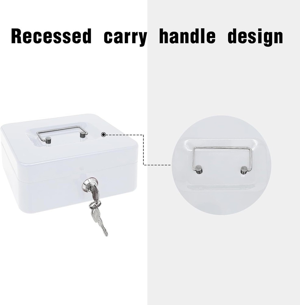 Steel Cash Box with Key Lock, Metal Small Money White- 7.8" x 6.3" x 3.3" Product Details Brand: PACOLO Product Dimensions: 5.9"D x 3.1"W x 4.7"H Lock Type: Key Color: White- 7.8" x 6.3" x 3.3" Material: Alloy Steel, Metal Special Feature: Key Lock Mounting Type: Floor Mount Control Type: Key Control Included Components: Stainless Steel, Alloy Steel, Plastic, Metal Water Resistance Level: Not Water Resistant Chamber Depth: 5.9 Inches Manufacturer: PACOLO Item Weight: 1.76 pounds Country of Origin: China Item model number: Steel Cash Box Style: Classic Special Features: Key Lock Batteries Included?: No Batteries Required?: No Brand: PACOLO Product Dimensions: 5.9"D x 3.1"W x 4.7"H Lock Type: Key Color: White- 7.8" x 6.3" x 3.3" Material: Alloy Steel, Metal Special Feature: Key Lock Mounting Type: Floor Mount Control Type: Key Control Included Components: Stainless Steel, Alloy Steel, Plastic, Metal Water Resistance Level: Not Water Resistant Size And Color:Exterior dimensions: 7.8 inch x 6.3inch x 3.3 inch,4 colors(Black, White,Pink and Blue) available for you to choose. Key Lock:This cash box has a key lock to keep valuables safe. The key is easy to operate,can open it no problem with one hand. Removable Tray:This cash box has a removable tray with 6 compartments which makes for great coin organization,as well as a layer underneath the tray for storing cash and checks. Highly Quality:This cash boxes is made of high quality steel which is solid and not afraid of knocks and shocks.Suitable to store bills, coins, checks and receipts.The lock box is lightweight with a convenient handle, so you can take it to anywhere and hide it easily. Wide Application:This money box with key is suitable for indoor or outdoor small business,commercial supermarket,store,lockers, cabinets, family use.It also is a perfect gift for Birthday, Mother’s day,Christmas for your friends and family. Suitable to store bills, coins, checks and receipts.