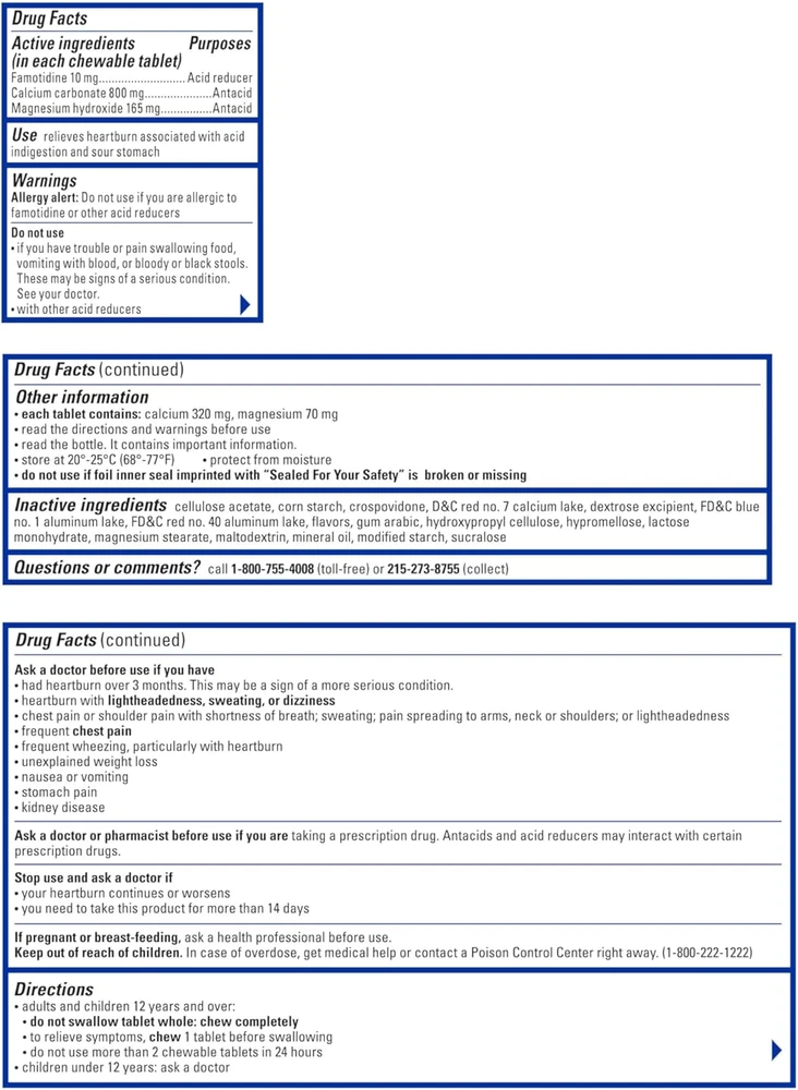 50-count bottle of Dual Action Pepcid Complete Acid Reducer + Antacid Chewable Tablets with famotidine in a berry flavor to help provide fast heartburn relief from acid indigestion and sour stomach Just one chew starts working in seconds for effective acid control that lasts all day or all night (based on 9-hour acid control studies during the day and 12-hour acid control studies during the night. Acid control does not imply symptom relief) Each chewable antacid tablet is specially formulated with 10 milligrams of famotidine, a known acid reducer, plus 800 milligrams of calcium carbonate and 165 milligrams of magnesium hydroxide, which are antacids The chewable berry-flavored heartburn medicine features a dual-action formula containing both an acid reducer and antacids to control and neutralize acid, and lasts longer than Tums (Tums is a registered trademark of GlaxoSmithKline) Formulated to relieve heartburn due to acid indigestion and sour stomach, keep a bottle of Chewable Pepcid Complete Acid Reducer + Antacid Tablets at home and one in the office to relieve heartburn whenever it strikes Product Description Quickly relieve heartburn & reduce acid associated with acid indigestion & sour stomach with Pepcid Complete Acid Reducer + Antacid Chewable Tablets. These berry flavored heartburn medicine + antacid chews combine a fast-working antacid & long-lasting acid reducer to help control acid all day or night.* Formulated with 10 mg of the acid reducer famotidine, 800 mg of the antacid calcium carbonate & 165 mg of the antacid magnesium hydroxide per tablet, this heartburn reliever helps to neutralize & control acid. The dual-action formula of these antacid chews starts working in seconds & lasts longer than Tums.*† Whether at brunch or a new food spot, use Pepcid Complete Berry Flavored Chews for fast-acting heartburn relief so you don't have to worry about heartburn getting in the way. * Based on 9-hour acid control studies during the day & 12-hour acid control studies during the night. Acid control does not imply symptom relief. *† Tums is a registered trademark of GlaxoSmithKline. From the Manufacturer With Dual Action, Reduces And Neutralizes Acid. Works with Just One Tablet! Contains Calcium! Relieves Heartburn Due to Acid Indigestion! 50 ~ Berry Blend Flavored Chewable Tablets. The benefits of a chewable antacid + Acid Control of Pepcid AC = A single tablet that both reduces and neutralizes acid. A Non-Prescription Stomach Medicine - Pepcid Complete combines an acid reducer (famotidine) with antacids (calcium carbonate and magnesium hydroxide) to relieve heartburn in two different ways: Acid reducers decrease the production of new stomach acid. Antacids neutralize acid that is already in the stomach. The active ingredients in Pepcid Complete have been used for years to treat acid-related problems in millions of people safely and effectively. Just 1 tablet relieves heartburn due to acid indigestion. Excess Acid: A Burning Problem - It is normal for the stomach to produce acid, especially after consuming food and beverages. However, acid in the stomach may move up into the wrong place (the esophagus), causing burning pain and discomfort that interfere with everyday activities. Heartburn - Caused by acid in the esophagus. Burning pain/discomfort in esophagus. A valve-like muscle called the lower esophageal sphincter (LES) is relaxed in an open position. Acid moves up from stomach. Tips for Managing Heartburn. Do not lie flat or bend over soon after eating. Do not eat late at night, or just before bedtime. Certain foods or drinks are more likely to cause heartburn, such as rich, spicy, fatty, and fired foods, chocolate, caffeine, alcohol, and even some fruits and vegetables. Eat slowly and do not eat big meals. If you are overweight, lose weight. If you smoke, quit smoking. Raise the head of your bed. Wear loose fitting clothing around your stomach. Proven effective in Clinical Studies: In clinical studies, Pepcid Complete was significantly better than placebo pills in relieving heartburn. Onset of Relief - Percent of heartburn episodes relieved within 30 minutes. 45% Pepcid Complete. 33% Placebo. 38 % Famotidine. 41% Antacid. Duration of Relief - Percent of heartburn episodes relieved for at least 7 hours. 70% Pepcid Complete. 59% Placebo. 68% Famotidine. 61% Antacid.