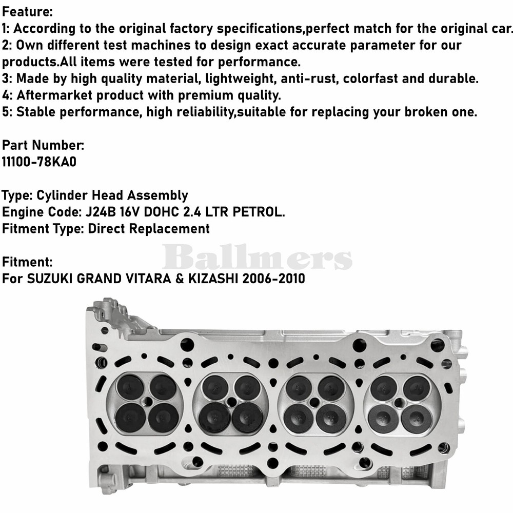 Part Number: 11100-78KA0 Type: Cylinder Head Assembly Engine Code: J24B 16V DOHC 2.4 LTR PETROL. Fitment Type: Direct Replacement Fitment: For SUZUKI GRAND VITARA & KIZASHI 2006-2010 Package Include: 1x Cylinder Head Assembly Home Payment Shipping Return Policy About Us Contact Us Feedback Title Other Catalytic Converter Shock Absorbers Struts Other Fuel Pump 11100-78KA0 J24B Complete Cylinder Head Assy For Suzuki Grand Vitara 2.4L Feature: 1: According to the original factory specifications,perfect match for the original car. 2: Own different test machines to design exact accurate parameter for our products.All items were tested for performance. 3: Made by high quality material, lightweight, anti-rust, colorfast and durable. 4: Aftermarket product with premium quality. 5: Stable performance, high reliability,suitable for replacing your broken one. Part Nu mbe r: 11100-78KA0 Type: Cylinder Head Assembly Engine Code: J24B 16V DOHC 2.4 LTR PETROL. Fitment Type: Direct Replacement Fitment: For SUZUKI GRAND VITARA & KIZASHI 2006-2010 Package Include: 1x Cylinder Head Assembly Terms of sales Delivery details Payment About us Contact us Terms of sales If you are not sure about the compatibility, or you are looking for other car parts, just contact us. We are happy to offer any help. Bellow information will help: VIN(Vehicle Identification Number), detailed car model, part number and photos of the parts. as the information in the " vehicle compatible chart" section above is generated by eBay Motors and not from us. 📣30-day window for returns and exchanges for reason other than defect. 📣Standard 1 year warranty on all parts except as noted. 📣 We do not warranty for improper installation or usage after time of purchase. 📣 Please make sure your address and contact information is accurate and correct. 📣 Except the product costs, international buyers may need to pay additional import taxes to local customs. Our prices do NOT include taxes. Delivery details 👉Domestic orders are usually shipped within 2 working days. Delivery is between 2-5 business days. (except holidays and weekends). Sometimes the carrier may not update the tracking in time, so we arranged staff to follow up the tracking status of all orders. If there is any abnormality, we will provide solutions to guarantee the rights and interests of customers. (Domestic orders will be shipped FREE of charge via UPS/ FedEx/ USPS at our discretion.) 👉Outside the United States, orders will be shipped within 3 working days and delivered within 2-7 working days. Apart from the product cost, international buyers may have to pay additional import duties to the local customs. Our price does not include tax. (International orders will be shipped via DHL, FedEx, UPS) Payment Please use the eBay checkout system when paying for your order. Immediate payment is required for all orders. About us We are a leading auto parts supplier with our own supply chain system. Our products are produced according to the original factory standard, with high quality and a competitive price, and the warranty period is one year. Our Advantage: Expert Guidance and Support: Our team of knowledgeable and experienced professionals is here to provide expert guidance and support. Exceptional Quality Assurance: Quality is our top priority. All our auto parts undergo rigorous testing and quality assurance processes to meet or exceed industry standards. Competitive Pricing and Value : We understand the importance of competitive pricing without compromising on quality. Our commitment is to provide customers with value for their money, offering affordable auto parts that don't sacrifice performance or reliability. Specialized in automotive shock absorber and catalytic converter parts, fuel pump, Transfer Case, ignitioncoil, Vacuum Pump, Repair kit, etc. Contact us ❤️ Communication is the best way to solve the problem. If you have any problems after purchasing, please contact us in time, before opening return or case 🔔Please contact us before committing to buy if you have any questions about the applicability, warranty or conditions of the product. ⚠️Notes: Due to the time difference, we may not be able to reply in time. Please be patient. Please don't worry. We will definitely reply your email within 24 hours. Main Brand