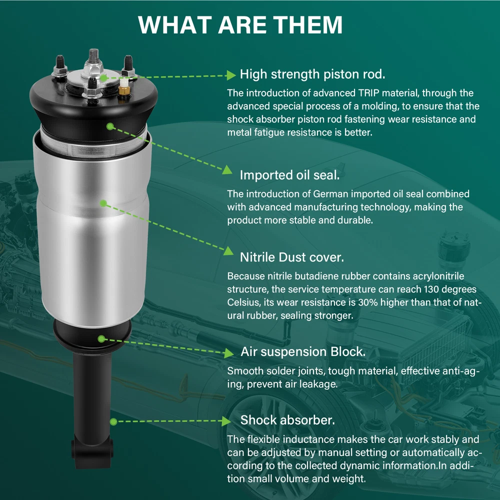 *Compatibility Chart 1, You can distinguish specific model of an automobile by VIN(Vehicle Identification Number). 2, VIN(Vehicle Identification Number) consists of total 17 English letters and arabic digits. 3, VIN does not include the letters I (i), O (o), and Q (q) (to avoid confusion with numerals 1 and 0). Range Rover Sport Excludes VDS Model With Electrical Plug on Mounting Base 2010-2014 Complete Suspension Shock Strut Air Compressor Fits Land Rover Range Rover Sport *Compatibility Chart 1, You can distinguish specific model of an automobile by VIN(Vehicle Identification Number). 2, VIN(Vehicle Identification Number) consists of total 17 English letters and arabic digits. 3, VIN does not include the letters I (i), O (o), and Q (q) (to avoid confusion with numerals 1 and 0). Range Rover Sport Excludes VDS Model With Electrical Plug on Mounting Base 2010-2014 GT Limited Edition 3 Sport Utility 4-Door 5.0L 2012 GT Limited Edition Sport Utility 4-Door 5.0L 2011 2013 HSE Lux Sport Utility 4-Door 5.0L 2012-2013 HSE Sport Utility 4-Door 4.4L 2006-2009 HSE Sport Utility 4-Door 5.0L 2010-2013 LE Sport Utility 4-Door 4.2L 2008 Supercharged Sport Utility 4-Door 4.2L 2006-2009 Land Rover LR4 Base Sport Utility 4-Door 3.0L 2014-2016 Base Sport Utility 4-Door 5.0L 2011-2013 HSE Lux Sport Utility 4-Door 3.0L 2014-2016 HSE Lux Sport Utility 4-Door 5.0L 2012-2013 HSE Sport Utility 4-Door 3.0L 2014-2016 HSE Sport Utility 4-Door 5.0L 2010-2013 SE Sport Utility 4-Door 5.0L 2010-2013 V8 Sport Utility 4-Door 5.0L 2010 Land Rover LR3 Base Sport Utility 4-Door 4.0L 2006 HSE Lux Sport Utility 4-Door 4.4L 2009 HSE Sport Utility 4-Door 4.4L 2005-2009 SE Sport Utility 4-Door 4.0L 2005-2009 SE Sport Utility 4-Door 4.4L 2005-2009 *Air Suspension Structure: 1 Front Rh Air Spring Damper Module 2 Front Rh Height Sensor 3 Air Suspension Control Module 4 Air Suspension Control Switch 5 Rear Rh Height Sensor 6 Rear Rh Air Spring Damper Module 7 Air Supply Unit Silencer 8 Rear Lh Air Spring Damper Module 9 Air Fitter 10 Rear Valve Block 11 Rear Lh Height Sensor 12 Upper Acoustic Cover 13 Lower Acoustic Cover 14 Air Supply Unit 15 Reservoir Valve Block 16 Air Reservoir 17 Front Lh Height Sensor 18 Front Lh Air Spring Damper Module 19 Front Valve Wock * Generation & Evolution: Land Rover Discovery First generation (Project Jay; 1989-1998) Second generation (LR2/L318; 1998-2004) Third generation (LR3/L319; 2004-2009) Fourth generation (LR4/L319; 2009-2016) Fifth generation (L462; 2017-present) Range Rover Sport First generation (L320; 2005-2013) Second generation (L494; 2013-present ) SVR (2015 Pre-Facelift) SVR (2018 Facelift) *Platform Drive Layout : Front Engine-Four Wheel Drive Layout *Air Suspension System: The Discovery LR3 LR4 own fully independent air suspension with cross-linking when off-road and the twin-range transfer gearbox with an electronic infinitely variable locking centre differential. As before, a similar locking rear differential is available. The Terrain Response system remains but with two new features – the 'Sand' mode incorporates a new traction control mode to prevent loss of traction when starting off and stopping in soft sand, and the 'Rock Crawl' mode gains a feature that applies gentle brake pressure at low (less than walking pace) speeds to improve grip and stability on slick rock. Range Rover Sport air suspension system gives the driver the option of three ride height settings including a standard ride height of 172 mm (6.8 in), an off-road height of 227 mm (8.9 in) and a lowered access mode. There is also an extra height available which is accessed by holding the respective button for when the off-road ride height is not enough. When the vehicle bellies out, its control system will sense weight being lessened on the air springs and the ride height is automatically raised to the suspensions greatest articulation. The cross-link aspect of the suspension system, which debuted on the L322 Range Rover in 2002, results in better off-road performance by electronically operating valves in pneumatic lines which link adjacent air springs. In the event of a wheel on one side being raised when travelling off-road, the pneumatic valves are opened and the adjacent wheel is forced down, simulating the action of a live axle setup. *Removal Guideline: Caution: Damage to the vehicle and air suspension system can be incurred if work is carried out in a manner other than specified in the instructions or in a different sequence. 1.To avoid the possibility of short circuits while working with electric components consult your owner's manual on how to disconnect your battery. 2.Consult your vehicle owner's manual, service manual, or car dealer for the correct jacking points on your vehicle and for additional care, safety and maintenance instructions. Under no circumstances should any work be completed underneath the vehicle if it is not adequately supported, as serious injuries and death can occur. 1.Remove front wheel to expose the front air strut.(picture 1,2) 2.Loosen and remove the three(3)top mounting nuts.(picture 3) 3.Loosen and remove the lower mount nut. Support the air strut and remove the lower mount bolt.(picture 4,5) 4.Carefully lower the air strut to gain access to the air line. Unthread the fitting, remove the strut from the vehicle.(picture 6) 5.Remove the air strut from the vehicle.(picture 7) 6.Remove the air line fitting from the air hose and discard. To remove the air line fitting, remove the collet and the remaining fitting will slide off of air hose.(picture 8) *Installation Guideline: Installation is in reverse order of air strut removal. * Frequently Asked Questions : How to prevent the damage of air springs/How to extend the service life of air springs/struts etc.? An air strut with separable air springs If your vehicle offers a separable air suspension (Audi Allroad A6 C5, Mercedes-Benz W164, BMW X5, etc.), you should regularly (about once a week) lift the car to the maximum position