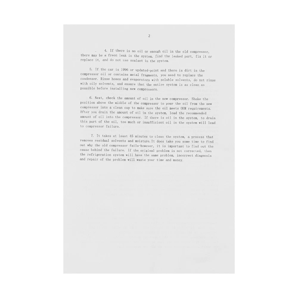 A/C Air Conditioner Compressor w/ Clutch For Audi A6 A7 Q5 S4 S5 2006-2015 3.0L New AC Compressor for AUDI A5, A6, A7, Q5, S4, S5.. - OE# 4F0260805AF Specifications OE/OEM Part Number: 4F0260805AF, 4711503 Compressor Model: DENSO 6SEU14C Type: AC Compressor Condition: New Color: Silver, Black Material: Aluminum, Iron, Copper Applicable Models: 06-15 Audi A6, A7, Q5, S4, S5 Voltage: 12V Grooves: 6 Clutch Diameter: 125mm/4.92in Coil Pos: 12 Compressor Mount: Direct Compressor Fitting: Pad Way of Use: Direct Replacement Placement on Vehicle: Engine Oil Type: PAG 46 Oil: Oz.7 Gross Weight: 6kg/13.23lbs Package Size: 28*22*19cm/11.02*8.66*7.48inch Key Features Improving Cooling Effect: The new AC compressor effectively helps to reduce fuel consumption, and ensure a better cooling effect, providing you with a safe driving experience. Low Noise: It adopts low noise technology, which can effectively reduce noise interference and provide drivers with a quieter and more comfortable driving experience. Protective Packaging: This product comes in custom foam to resist compression and falls, which can prevent product damage in transit as much as possible. Sturdy and Durable: Made of high-quality iron, aluminum, and copper , it can resist wear, corrosion, shock, and deformation, ensuring an extended service life. Highlights Brand New Direct-fit Replacement Comfortable Driving Fast Cooling High Security Easy to Clean Fine Workmanship Long Service Life Notes We strongly recommend professional installation. Please contact us if you have any questions. Please allow the slight color difference caused by the shooting light and 1-3cm error due to manual measurement, and make sure you do not mind before you place the order. Fits (As a Reference) For 06-15 Audi A6, A7, Q5, S4, S5 OE/OEM Part Number: 4F0260805AF, 4711503 Package Included 1 x AC Compressor 1 x English Installation Instruction Automotive Air Conditioning Compressor Disassembly and Assembling Steps 1. Preparation Before you start to disassemble the automobile air conditioning compressor, you need to do the following preparatory work. 1. Make sure the car has been parked and completely turned off. 2. The vehicle should be in a flat and safe environment, avoiding operation on slopes or unstable ground. 3. Wear acid and alkali-resistant gloves and goggles for protection. 4.When you receive this compressor item, please first check if there is any damage to the compressor, and then manually rotate the wheels and suction blades to see if there are any abnormalities. Furthermore, please confirm if the 12V plug of the power clutch is properly powered on 2.Disassemble the air conditioning compressor 2.1 Compressor location determination Before removing the air conditioning compressor, its location needs to be determined. Typically, the air conditioning compressor is located at the front of the engine compartment, and its exact location can be found through the technical manual provided by the vehicle manufacturer or online resources. 2.2 Discharging the refrigerant Before removing the air conditioning compressor, the refrigerant in it must be drained. This is very important as refrigerants can be harmful to the environment and illegal. The following are the steps for discharging the refrigerant. 1. Open the hood of the vehicle. 2. Locate the refrigerant charging and discharging ports on the air conditioning compressor. 3. Use a refrigerant recovery machine to pump out the refrigerant and store it. Be sure to follow local regulations to ensure proper handling of the refrigerant. 2.3 Removing the connecting piping After discharging the refrigerant, it is necessary to remove the connection pipes on the air conditioning compressor. These pipes are usually bolted or clamped to the compressor. The following are the steps for removing the connecting pipes. 1. Loosen the bolts or pliers on the connecting pipes with the appropriate tools. 2. Carefully separate the connecting pipe from the compressor. It may be necessary to shake the connection pipes gently to loosen them. 2.4 Removing the electrical connections After removing the connecting pipes, it is necessary to remove the electrical connections on the compressor. These electrical connections are usually secured to the compressor by plugs or screws. The following are the steps for removing the electrical connections. 1. Locate the electrical connections on the compressor. 2. If there is a plug connection, carefully unplug it from the compressor. 3. If there is a screw connection, use the appropriate tool to loosen the screw and remove the wire. 2.5 Removing the compressor After completing the above steps, the entire air conditioning compressor can now be removed. The following are the steps for removing the compressor. 1. Remove the bolts or screws holding the compressor in place using a wrench or wrench glove device. 2. Carefully remove the compressor from its mounting position. 3.Installation of a new air-conditioning compressor 3.1 Preparation for installing a new compressor Before installing a new air conditioning compressor, some parts need to be prepared. The following are the steps of preparation. 1. Clean the joints of the connecting pipes and make sure that their surfaces are clean and dust-free. 2. Prepare the new compressor and make sure it fits your vehicle model and cooling system. 3. Prepare new washers, bolts, or screws to fix the new compressor. 3.2 Installing the air conditioning compressor The following are the steps for installing a new air conditioning compressor. 1. Carefully place the new compressor in its mounting position. 2. Use new bolts or screws and place washers in the necessary positions before installation. 3. Tighten the compressor bolts or screws using a wrench or wrench-glove device. 3.3 Connecting the wires The following are the steps for connecting the wires. 1. Connect the compressor wires to the new compressor. Depending on the disassembly procedure in the previous section,