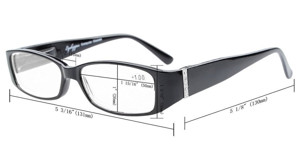 Computer Glasses with Crystals for Women Reading Blue Light Filter Eyeglasses(Black) without Strength PROTECT YOUR EYES - Anti glare lens coating prevents insomnia and macular degeneration. Low blue light glasses provide computer eye strain relief & alleviate dry eyes & relief headache when using your T.V., smartphone, tablet or PC gamer equipment. BLOCKING OVER 30% BLUE LIGHT - Blue light blocking technology naturally blocks out the recommended 30% of blue light rays: do not settle. Protect your eyes with the best blue light blocking glasses money can buy. HIGH TECHNOLOGY - Anti-scratch, anti-reflective, anti-screen flicker, anti-glare, anti-fog coated; Electromagnetic ray, UVA & UVB blocking & fingerprint resistant. 100% UV PROTECTION - CessBlu Computer Reading Glasses offer 100% UV Protection to protect your eyes from harmful UV Rays, reduce the discomfort caused by extended exposure to UV Rays. [Kindly Notice] If you cannot make sure which magnification strength to choose, please use the EYE TEXT CHART we provide on the left. Please specify magnification strength before your pay. Thanks! FEATURES Frame Material: Plastic Lens width: 1 15/16"(50mm) Frame width: 5 3/16"(131mm) Lens height: 1"(26mm) Frame height: 1 3/16"(30mm) Bridge (DBL): 1/2"(12mm) Temple length: 5 1/8"(130mm) Spring hinge: Yes Lenses: Aspheric Head size: Narrow to Medium CARE To avoid damage, never clean your eyeglasses with paper towels or clothing or alcohol, and also avoid using household detergents or soaps. While a few mild soaps don't harm lenses, today's extra strength soaps are powerful enough to slowly disintegrate lens coatings. KINDLY NOTICE Please ensure that the FRAME SIZE is fit for your head before your pay. Shipping We offer FREE shipping on all orders! We ship within Three business days of payment, usually sooner. We use a selection of shipping services such as UPS, FedEx, USPS etc. We only ship to the lower 48 states, no APO/FPO addresses or PO Boxes allowed. Local pickups and combined shipping options are not provided at this time. Return You can return a product for up to 30 days from the date you purchased it. Any product you return must be in the same condition you received it and in the original packaging. Please keep the receipt. Feedback Customer satisfaction is very important to us. If you have any problem with your order, please contact us and we will do our best to make you satisfied. Contact Us If you have any queries, please contact us via ebay. We usually respond within 24 hours on weekdays. Please visit our eBay store to check out other items for sale! Thank you for shopping at our store.