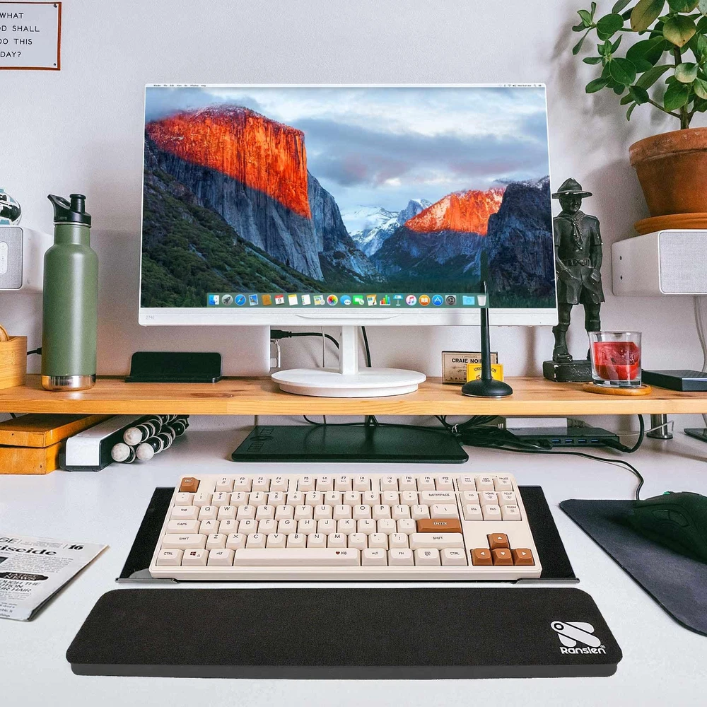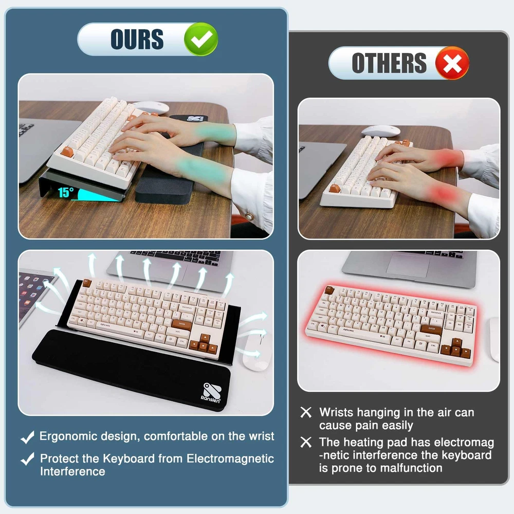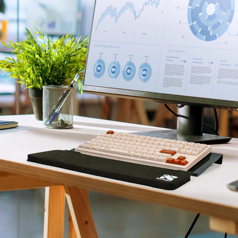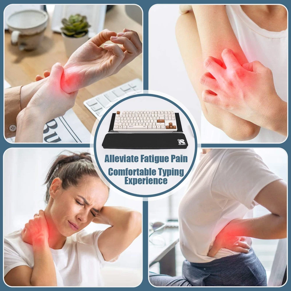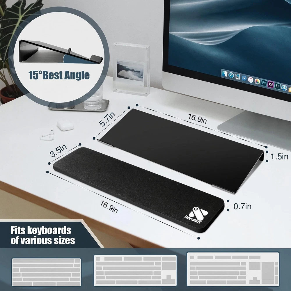 โŒจ ๐„๐ซ๐ ๐จ๐ง๐จ๐ฆ๐ข๐œ ๐ƒ๐ž๐ฌ๐ข๐ ๐ง-Creatively combines perfect tilted keyboard riser with keyboard wrist rest for optimal office effect and ease wrist fatigue. Discover the perfect angle and height that will make your wrists sing in joy. Experience the ultimate blend of style, comfort and functionality, turning every keystroke into a symphony of productivity. โŒจ ๐๐ž๐ซ๐Ÿ๐ž๐œ๐ญ ๐‚๐จ๐ฎ๐ฉ๐ฅ๐ž- tilted computer keyboard holder for easy ergonomic typing is the ultimate winner of computer desk accessories, seamlessly fitting keyboards of all sizes - thin keyboard, keyboard, mini keyboard, full-sized keyboard, etc. The keyboard stand measures16.9in/43cm x 5.70in/14.5cm x1.49in/3.8cm, the wrist pad for keyboard measures 16.9in/43cm X 3.54in/9cm X 0.70in/1.8cm. โŒจ ๐๐ข๐ ๐…๐š๐ซ๐ž๐ฐ๐ž๐ฅ๐ฅ ๐ญ๐จ ๐’๐ฅ๐ข๐ฉ๐ฉ๐ž๐ซ๐ฒ ๐ƒ๐ข๐ฌ๐š๐ฌ๐ญ๐ž๐ซ๐ฌ-keyboard tray holder with silicone non-slip case and non-slip rubberized base, never suffer from slippery or wobbly typing again. Unlike traditional front lip of keyboard stand hinder typing or stab your hands, 's wrist support for keyboard has the same width as the keyboard lifter to fully avoid your keyboard from sliding down and wobbly. โŒจ๐’๐ฎ๐ฉ๐ž๐ซ๐› ๐๐ฎ๐š๐ฅ๐ข๐ญ๐ฒ & ๐‹๐ข๐ฌ๐ญ๐ข๐ง๐  ๐ƒ๐ฎ๐ซ๐š๐›๐ข๐ฅ๐ฒ-Immerse in excellence with premium acrylic computer keyboard stand riser and rubber wrist pad. Built to withstand time, enjoy worktime. Rounded edge design protects potential damage to your hands, elegant office essential. โŒจ๐’๐ญ๐ซ๐ž๐š๐ฆ๐ฅ๐ข๐ง๐ž๐ ๐ƒ๐ž๐ฌ๐ข๐ ๐ง & ๐’๐ฅ๐ž๐ž๐ค ๐‹๐จ๐จ๐ค-ergonomic design is your secret for unrivaled typing speed, accuracy and precision. When you receive the units, black keyboard display stand has a protective film to prevent handprints and fingerprints.. Peel off the film to reveal more luster and luxury.