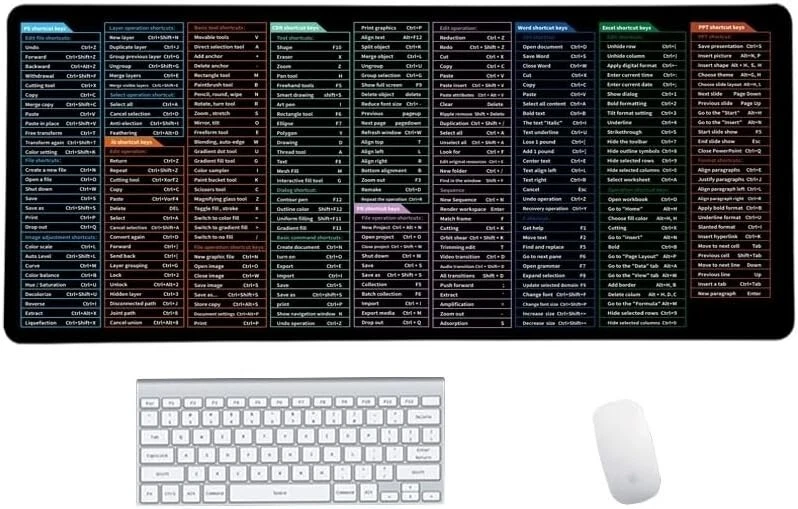 Computer Mouse Pad Desk Mat Excel Shortcut Mouse Pad Quick Key Super Large Product Details: Anti-Slip Mouse Pad: Quick Key's extra-large anti-slip keyboard pad is designed with dense anti-slip shading to firmly grip the desktop and provide stable operation of the mouse and keyboard. Effectively prevents mouse and keyboard from sliding and moving. Large surface area: Measuring 800*300mm (11.8*31.5in), our rectangular mouse pad gives you ample space for your mouse and makes navigation quick effortless. Clear Shortcut Key Pattern: This large non-slip keyboard pad is designed with office software shortcut key pattern, making it easy to read and use. This mode allows users to quickly and easily access commonly used commands and functions. Premium quality: Made from durable materials and featuring durable stitched edges that prevent it from fraying and degumming. This mouse pad is built to last and will withstand everyday use for years to come. Easy to clean: Simply wipe away spills or stains with a damp cloth to keep your mouse pad always fresh and vibrant.