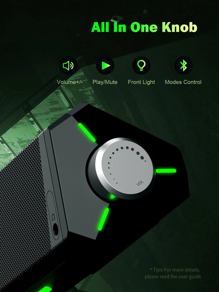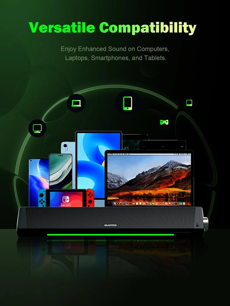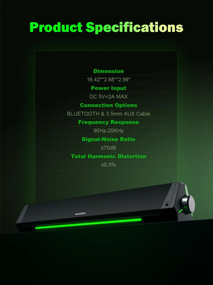 【Hi-Fi Sound Quality】Featuring dual drivers and dual diaphragms, these computer speakers deliver a harmonious blend of high-pitched notes and deep bass. With anti-magnetic technology eliminating static interference, you'll enjoy a crisper, more immersive audio journey. 【2 Ways to Connect】No need to worry about this computer soundbar not being compatible with your existing devices. Featuring both a 3.5mm headphone plug and Bluetooth 5.0 function, connects effortlessly with your preferred device. 【Relaxing Ambiance Lights】Gentle light strips complement the avant-garde design of the computer speaker, elevating your auditory experience, and adding a touch of elegance to your desk. 【Simple USB-powered】Simply plug into a USB port - be it from a laptop, PC, power bank, or adapter, and the computer soundbar powers on instantly. No additional drivers or software required, just plug and play. 【Compact Profile Design】Slim and futuristic design, which allows the computer soundbar to fit neatly below your computer monitor without taking up much desk space; The speaker measures 16.4" W x 2.6" D x 2.6" H. 【Tidy Deskspace Solution】Equipped with nylon-braided Y-cable that combines both power and audio, only for returning an organized workspace to you. 【Eco Commitment】85% of this computer speaker is crafted from eco-friendly ABS material, and our packaging is made from eco-friendly cardboard as well. is consistently committed to playing our part in protecting our blue planet. 【Trustworthy After-Sales】Once purchased, you are our valued customer entitled to lifetime after-sales service. Should you have any queries or require technical help, contact us via Amazon messages or the contact information in the user manual.