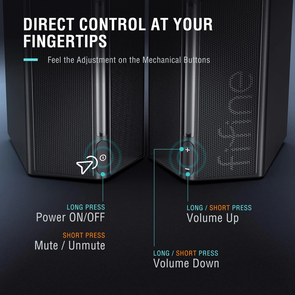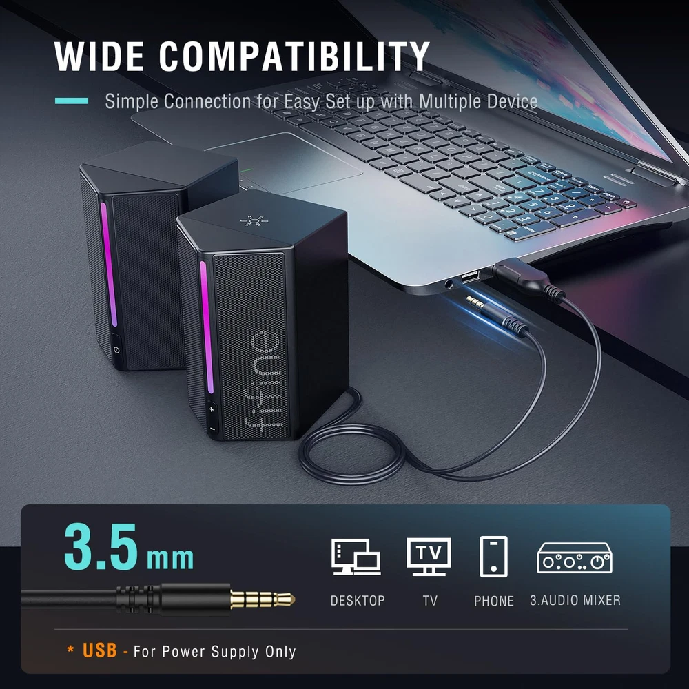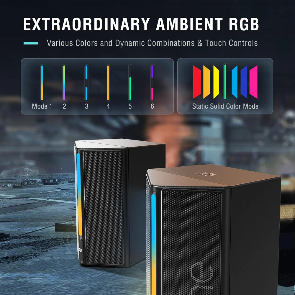[Unleash Immersive Gaming Audio] Whether you're gaming in intense firefights on the battlefield or unraveling the dialogue of a adventure, the computer speakers for gaming deliver sound clarity and depth to capture details with precision. You will pinpoint enemy movements and react swiftly to environmental cues via immersive audio. RGB PC speakers give you fully immersive feeling in the virtual world. [Speaker Drivers for Immersive Gaming] The desktop PC speakers boast drivers that deliver a rich and dynamic sound stage that draws you deeper into your gaming world. You will hear the faintest footsteps of approaching enemies, or feel the rustle when navigating the dense jungles of an adventure game, or experience the subtle nuances of a cinematic storyline, The 3.5mm speakers heighten immersion and makes sound transmission more dynamic. [Controllable RGB for Gaming Ambiance] Elevate your gaming setup to the next level with gaming speakers for desktop computer featuring controllable RGB with 6 kinds of dynamic modes and 7 color options. The LED speakers adds a dynamic visual dimension to your gaming experience. Tailor your gaming environment to match the mood and atmosphere of more scenario, amplifying immersion and enhancing overall gaming enjoyment. [Volume Control at Your Fingertips] PC monitor speakers feature intuitive volume and mute buttons, providing effortless control over your audio experience. When you're deep in the heart of a tactical shooter, coordinating with teammates, turn up the volume to amplify the intensity of the battlefield. A gripping adventure game with whispered conversation stimulate gaming progress. Mute button allow instant silence elevating your overall immersion and enjoyment. [3.5mm Aux Connectivity] Powered by USB connector, the wired computer speakers with 3.5mm aux-in compatibility ensure easy connection with computer, monitor or mobile phone. You can hunch over your computer monitor or lounge with your phone in hand, diving into an intense gaming session. The PC speakers gaming provide a versatile audio solution for your gaming needs to immerse yourself in the action and adapt to your setup. [Friendly Cable Uses] Easily connect these laptop speakers to your computer, monitor or phone without hassle through the length of 6ft (1.8m) cable between the speakers and devices. There is no more worrying about limited space or awkward positioning. The cable length of 5ft (1.5m) between the two aux speakers allows you to place the speakers more conveniently, as a way to be placed on the left and right ends of the computer screen and from other directions of the sound quality effect.