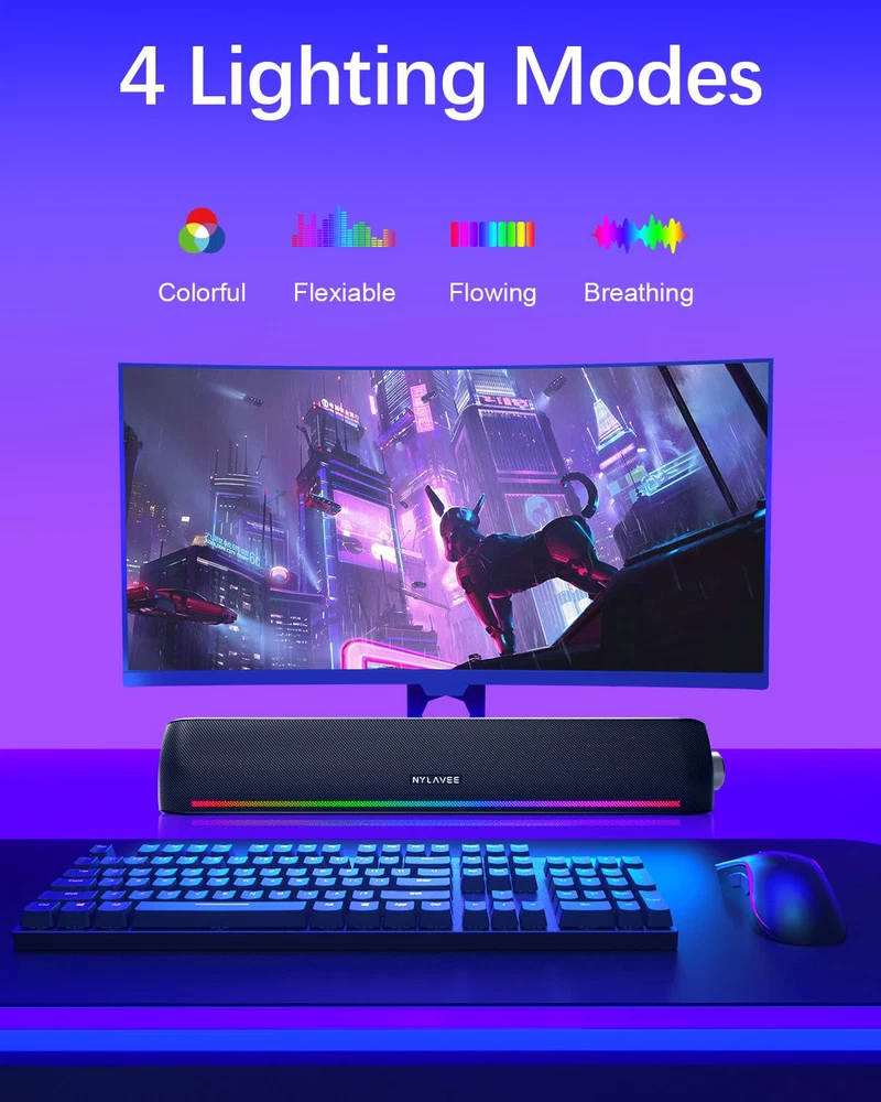 【Top-notch Stereo】: computer speakers equip with two double-layer neodymium magnets full-range speaker units and two independent bass diaphragms to provide rich high pitch and powerful bass, which will provide you with an unparalleled audio experience on music, movie, and gaming. 【4 Dynamic Lighting Modes】: The computer speakers for desktop pc come with 4 dynamic RGB lighting modes that can be customized to your liking. The lighting modes include rainbow, breathing, flowing, and rhythm to add an extra level of visual appeal to your entertainment setup. 【2 Connection Methods】: There are 2 connection methods for the pc speakers which are Bluetooth and 3.5mm Aux wired connections. desktop speakers are compatible with laptops, desktops, PCs, monitors, phones, tablets, Xbox, PS5, etc 【USB Powered & One-Knob Operation】: The speakers for pc have no built-in battery, just plug the USB plug into any power source then it will turn on automatically. All functions of the USB speaker are operated simply by the knob on the side. 【The Advantages】: The special cavity design and luxury configurations of desktop speakers not only bring a deep and powerful bass but also a clear and rich high-pitch performance. Perfect computer sound bar for bedroom