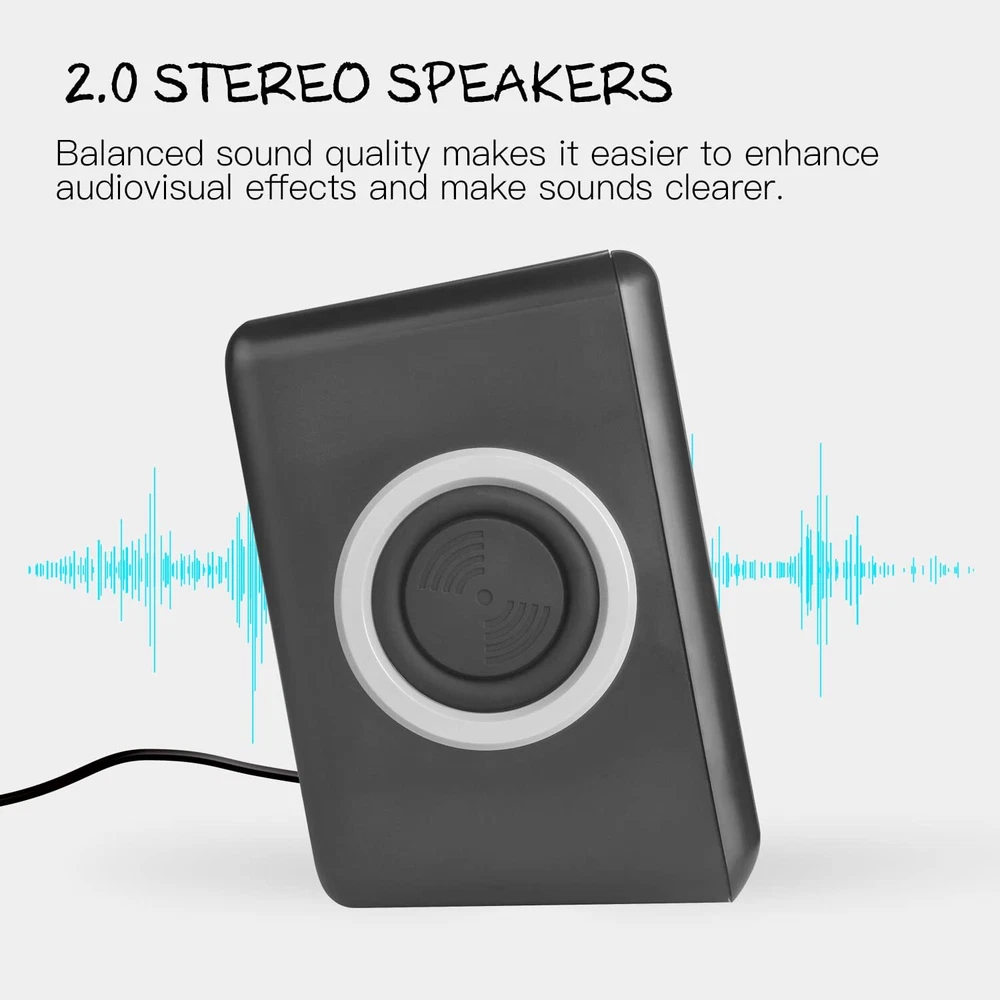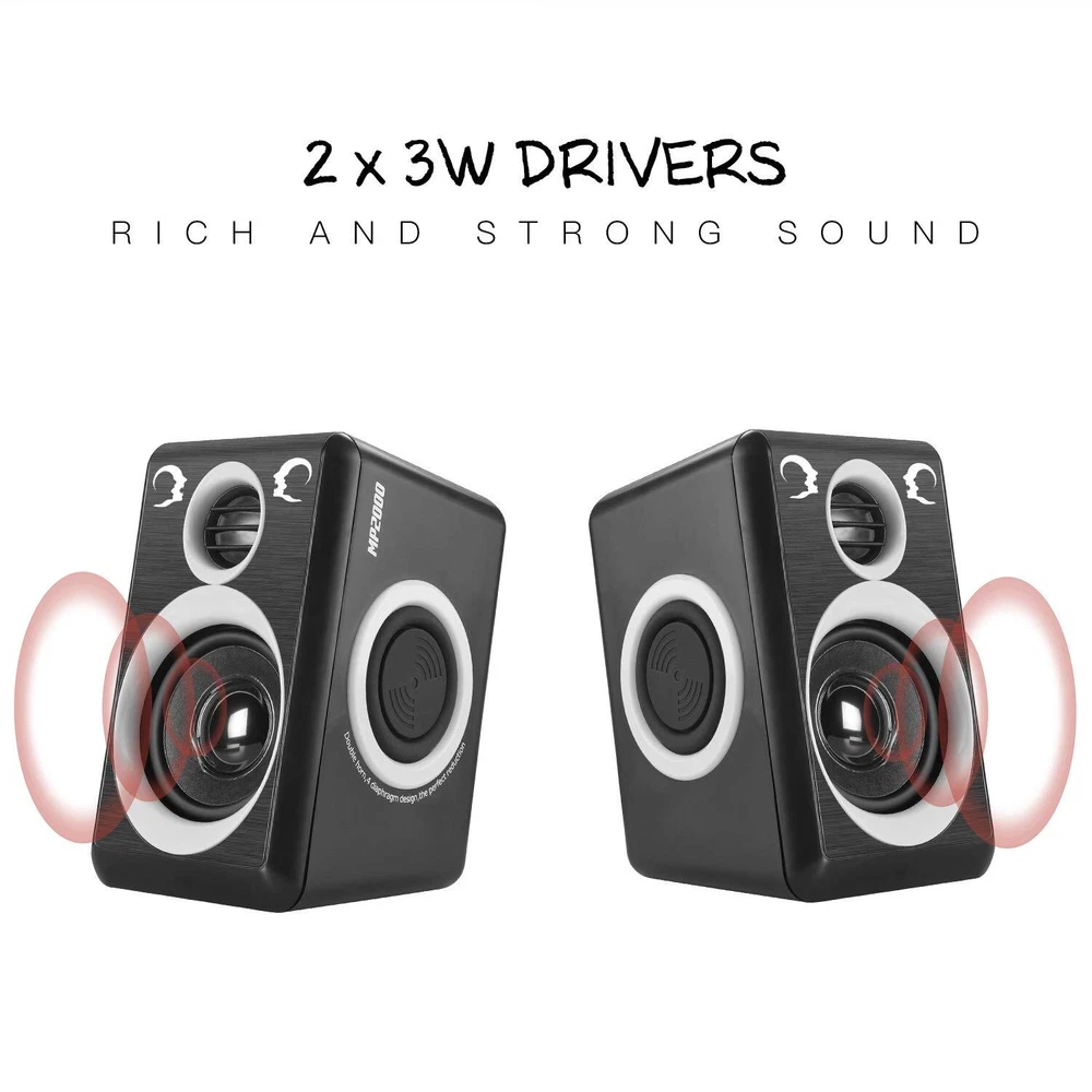 【SIMPLE SQUARE STRUCTURE】ABS high quality plastics make it shiny without murky grey. Black color with the grey oval ring, make speakers show the beauty of stereo. Adopted the low-voltage digital power, the maximum power can be 5W, ensure the sound clear, bright, rounded and thick. Small Body(5.4x3.2x.3.6inch) with powerful audio. 【RICH AND STRONG STEREO SOUND PROVIDE SUPPER SOUND QUALITY】Built-in 4 x bass diaphragm, closed Cavity and Low Frequency Aid design, compared to other small speakers. The unique acoustic resonator structure using the enclosed low-frequency aid design makes the sound more penetrating and powerful, to make up for the lack of bass of the Mini 2.0 speakers. 【COMPATIBLE WITH MULTIPLE DEVICES】MP2000 2.0 stereo speaker which is with 3.5mm audio interface and USB powered,compatible with most music players, , iPad, Galaxy phone or tablet, MP3 player or other device, just plug into your device to listen to your music at full volume. USB power supply, can be directly plugged into the computer USB port to take power, can also connect most of the 5V charger power supply. 【NOTE】Restricted to the small volume, bass effect still can’t compare with big speakers and professional subwoofer. To enjoy the best stereo effect need to separate 2 speakers, for example, the two speakers are separated from the distance of 1 meter, the two speakers and people should be 1 meters distance, then the two speakers and people is an equilateral triangle, such a position, you will hear the best stereo effect. 【12 MONTHS 】computer speakers provides 12 months manufacturer's and unconditional 30 days money-back .