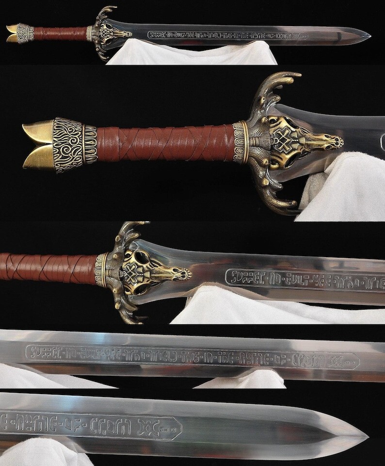 Conan’s Father Sword Custom Hand Forged Medieval Atlantean Replica Ideal Gift This custom-forged Conan's Father Sword, inspired by the legendary Atlantean design from Conan the Barbarian, is a remarkable piece for collectors and cosplay enthusiasts alike. With a meticulously handcrafted carbon steel blade, this full-tang sword embodies the strength and grandeur of ancient times. The unique Albion-style design makes it an impressive display piece or a standout accessory for cosplay. Innovative, Traditional, Precise Ergonomic Handle, With Classic Look Easy To Clean, Very Hygienic Custom Handmade Stainless steel blades User-friendliness Authentic Viking Craftsmanship Best Gift For Your Love Once & Hunter Friends. Carbon Steel Viking Sword, With Leather Sheath. PRODUCT SPECIFICATION Total length: 95,5 cm Blade length: 70 cm Handle length: 12 cm Pommel: 7,5 cm Weight: 2740 g Point of balance from guard: 8 cm RESTRICTION You Must Be Over 18 Years Of Age To Purchase These Products, The Buyer is Fully Responsible For Local Laws And Regulations Concerning the Purchase And Possession Of Knives, Swords, And Other Cutlery Tools, By Making A Purchase You Are Confirming Our Age Policy. HAVE A SAFE SHOPPING PLEASE LEAVE A HONEST REVIEW