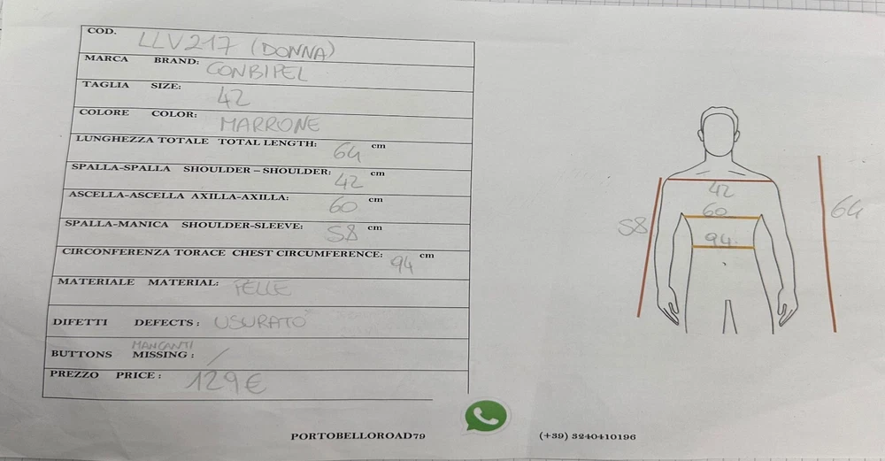 Style:JacketType:JacketSize Type:RegularColor:BrownBrand:ConbipelSize:42Vintage:Yesgtin13:Does not applyUPC:Does not applyOuter Shell Material:LeatherClosure:ButtonDepartment:woman
