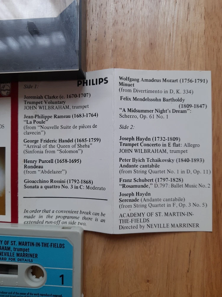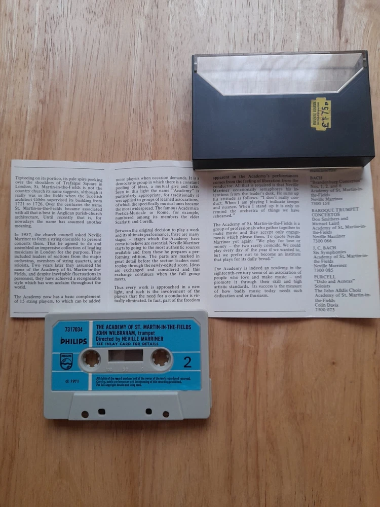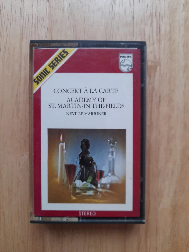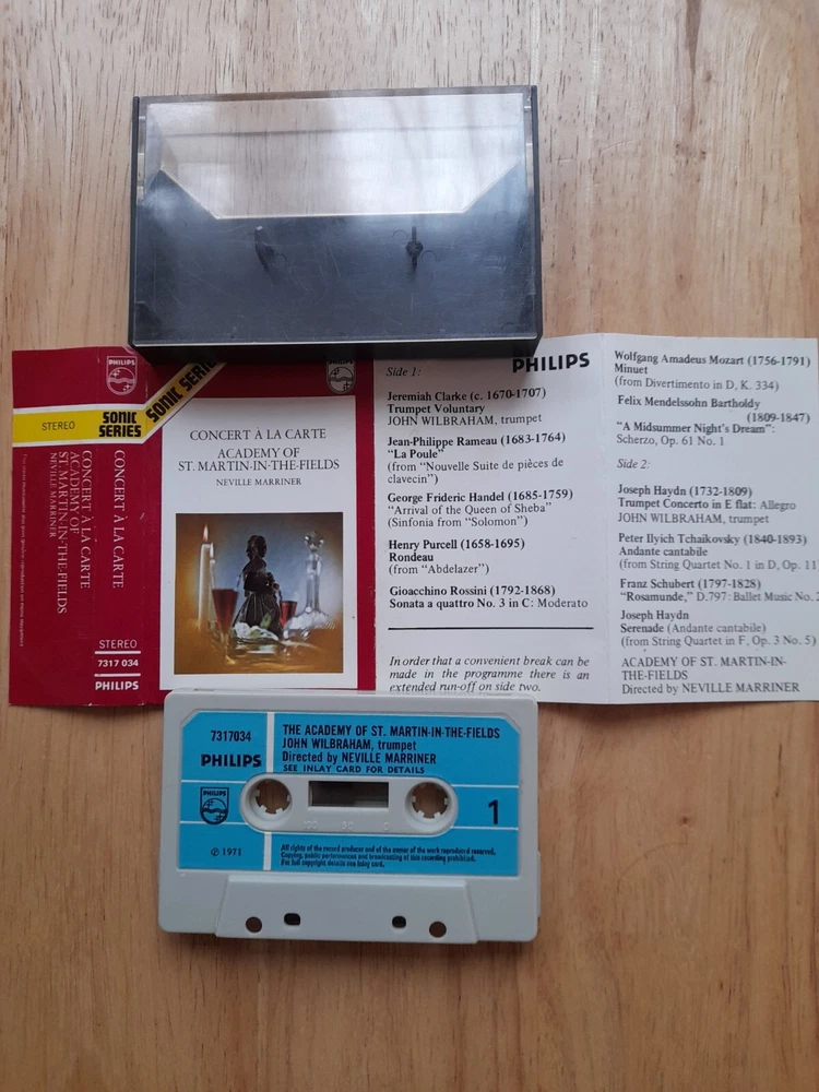 For sale a 1971 Philips Sonic Series Blue Paper Label Concert A La Carte Academy of ST Matin-in-the-Fields - John Wilbraham on Trumpet - Directed By Neville Marriner Cassette tape album . see pictures See inlay pictures for track list . Cassette case is in good used condition a few age and use related scratches - see pictures Inlay card is in very good used condition - see pictures Cassette tape listened to all the way through both sides - sounds great - tested play rewind fast forward working condition . Postage cost combined and reduced on multiple purchases so please check out my other audio cassette listings . Thank you for looking Any questions please ask Items despatched UK royal mail second class large letter bubble wrap envelope. Internationally- Royal mail international standard large letter bubble wrap envelope . No 240