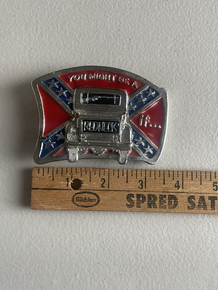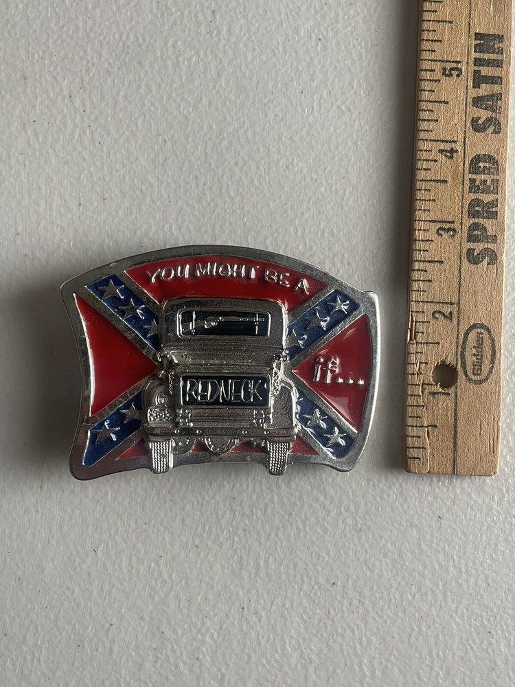 The "You Might Be a Redneck If…” Confederate Belt Buckle is a vintage accessory. Made of metal and featuring colors of red, blue, and silver, this original belt buckle exudes a Southern look that is both unique and eye-catching. Perfect for wearers seeking a distinctive and bold accessory to add to their collection, this belt buckle is a statement piece that pays homage to a bygone era.
